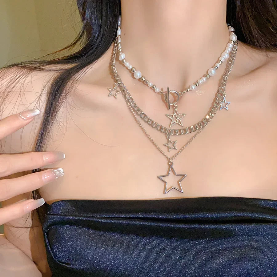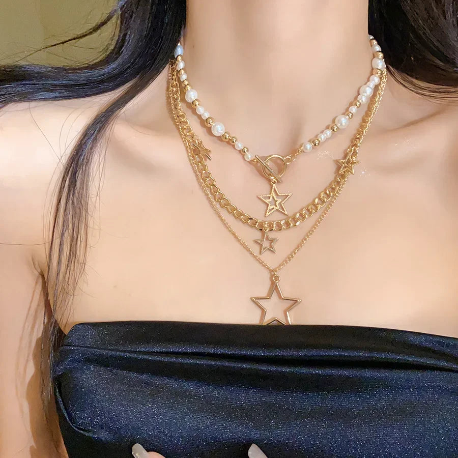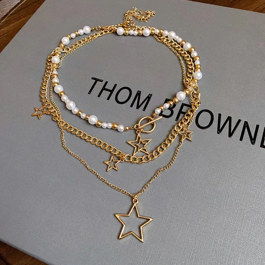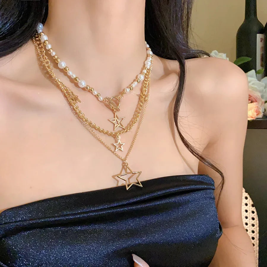 Daiiibabyyy Pearl Star OT Buckle Pendant Necklaces 2025 Fashionable Personalized Collarbone Chain Necklace Light Luxury High-end Jewelry