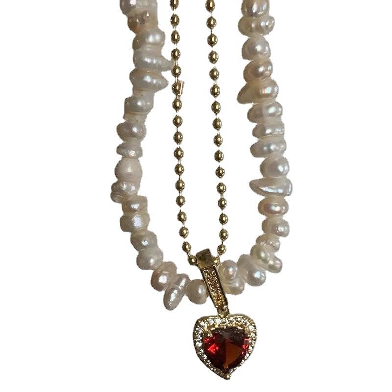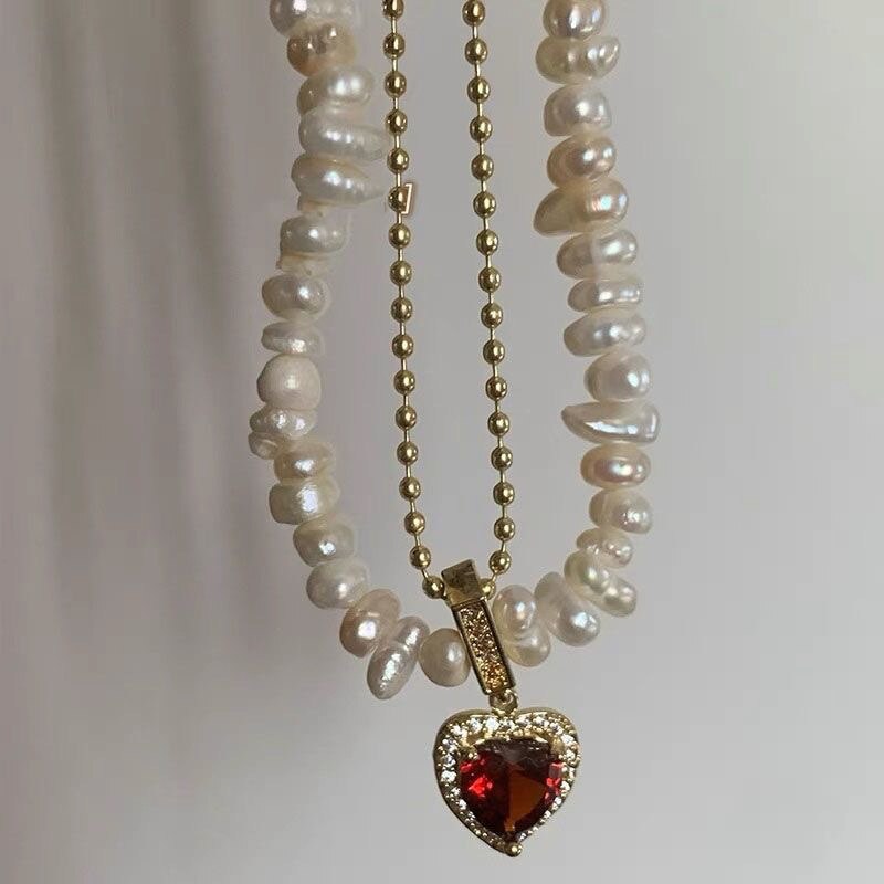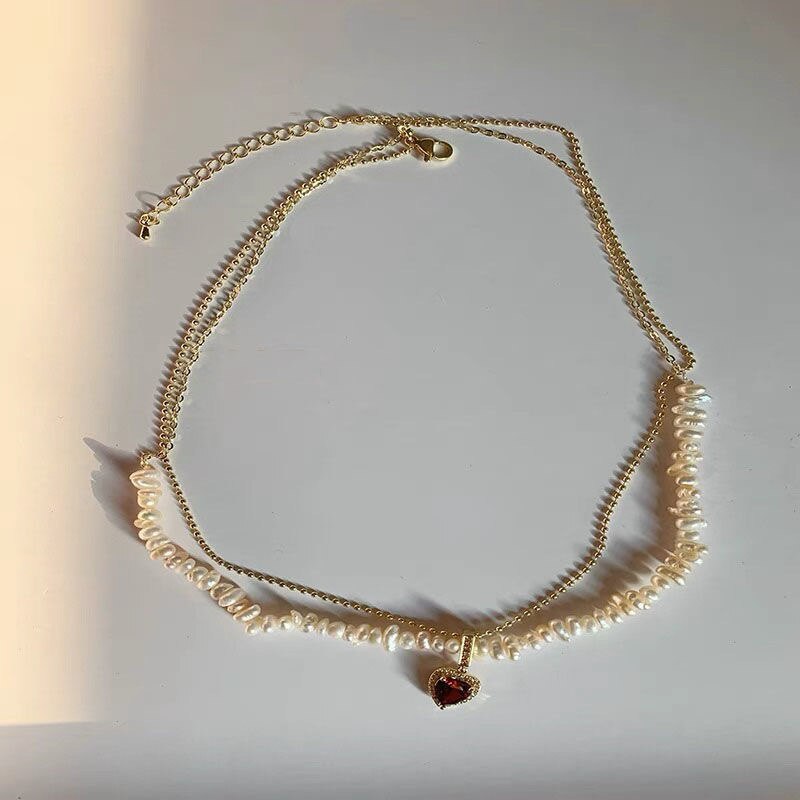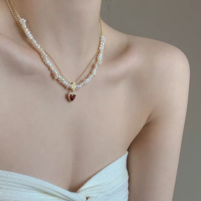 Daiiibabyyy Sweet Peach Love Heart Crystal Pendant Necklaces Irregular Pearl Beads Metal Double Layer Chains Choker for Women Gifts Jewelry