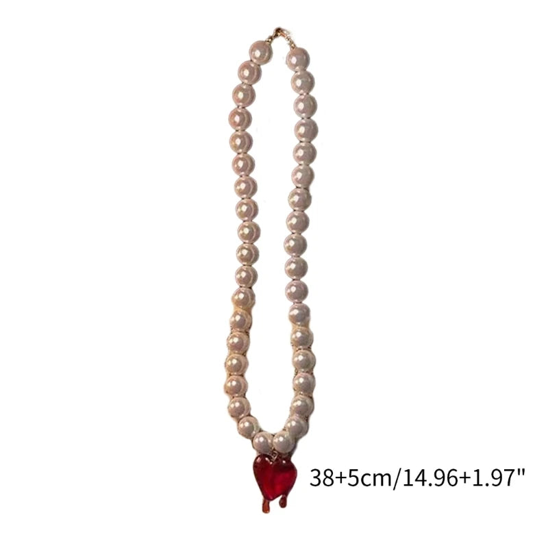 DAIIIBABYYY - Trendy Imitation Pearls Choker Necklace for Women Red Heart Pendnt Beaded Necklaces Temperament Clavicle Chain Jewelry