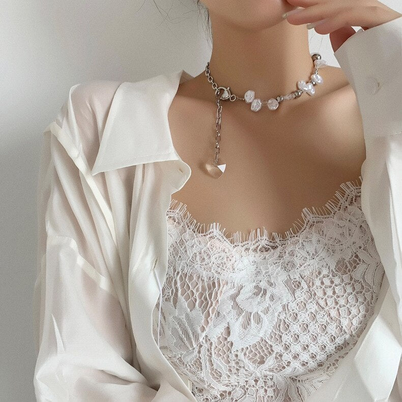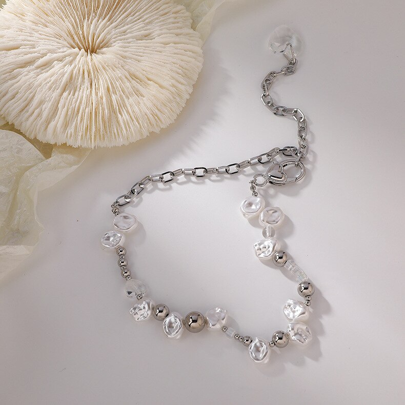 Trendy Hip hop Irregular Imitation Pearl Chain Statement Necklaces For Women Girls Jewelry Glass Clear Heart Necklace Pendant