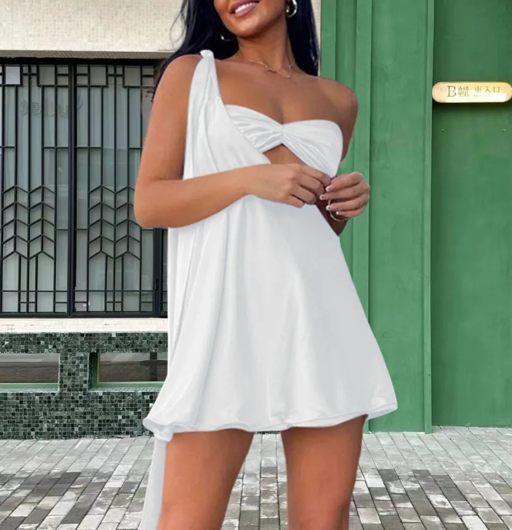 DAIIIBABYYY - 2024 Summer Elegant One Shoulder Solid Mini Dress Women Sexy Spicy Girls Bra Sleeveless Backless White Robes Vacation Beachwear