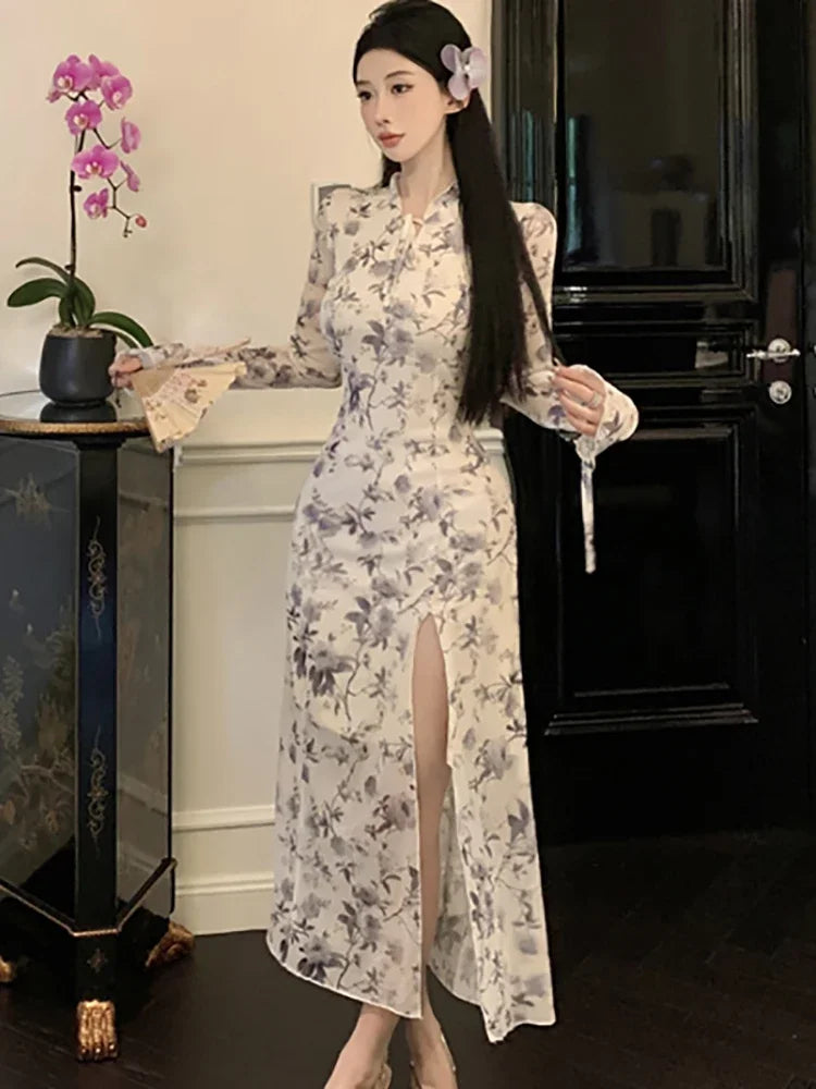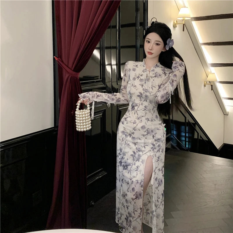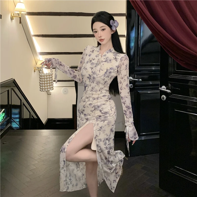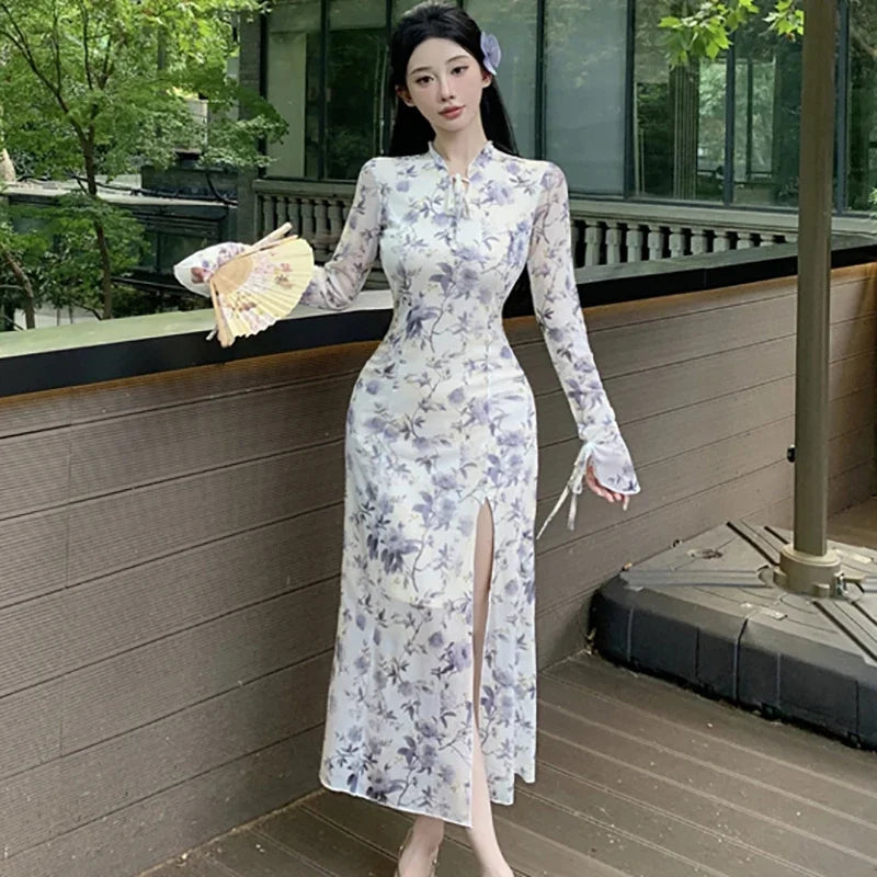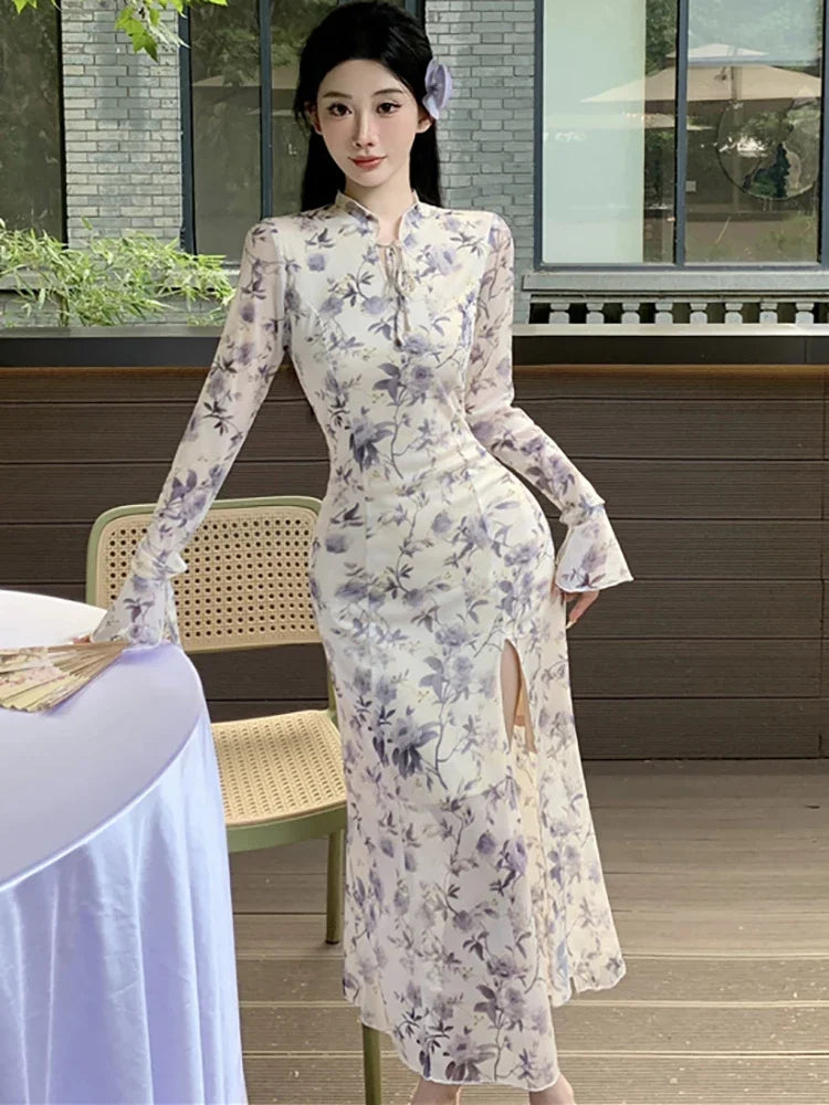 DAIIIBABYYY  -  Autumn Floral Mesh Long Sleeve Chic Bow Collar Long Dress Women Elegant Bodycon Slit Dress 2025 Korean Fashion Party Night Dress