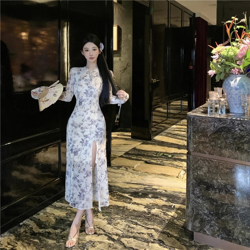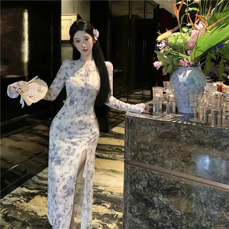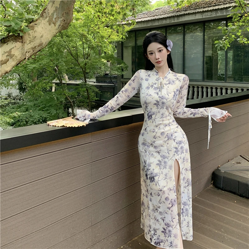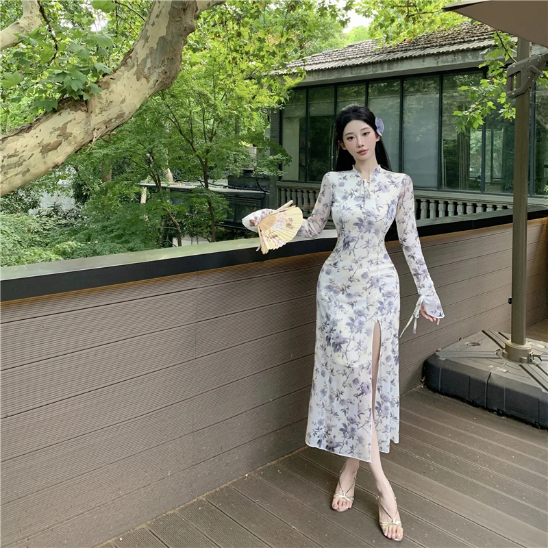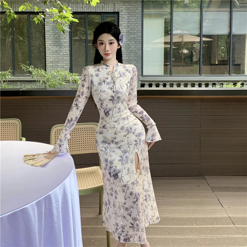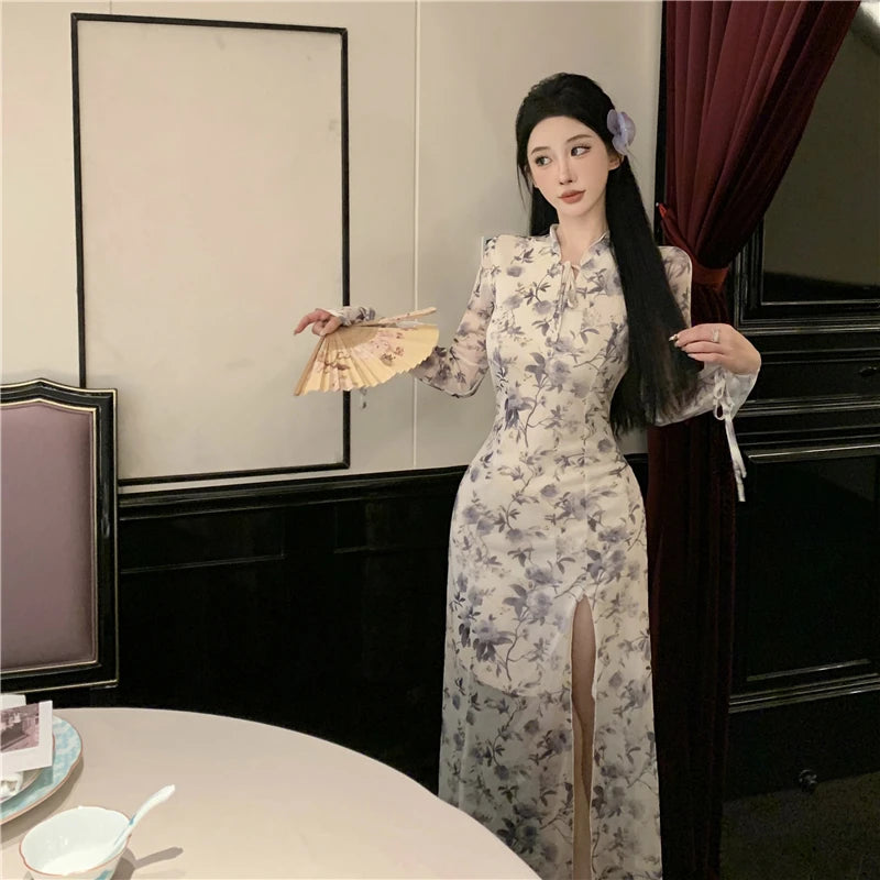 DAIIIBABYYY  -  Autumn Floral Mesh Long Sleeve Chic Bow Collar Long Dress Women Elegant Bodycon Slit Dress 2025 Korean Fashion Party Night Dress
