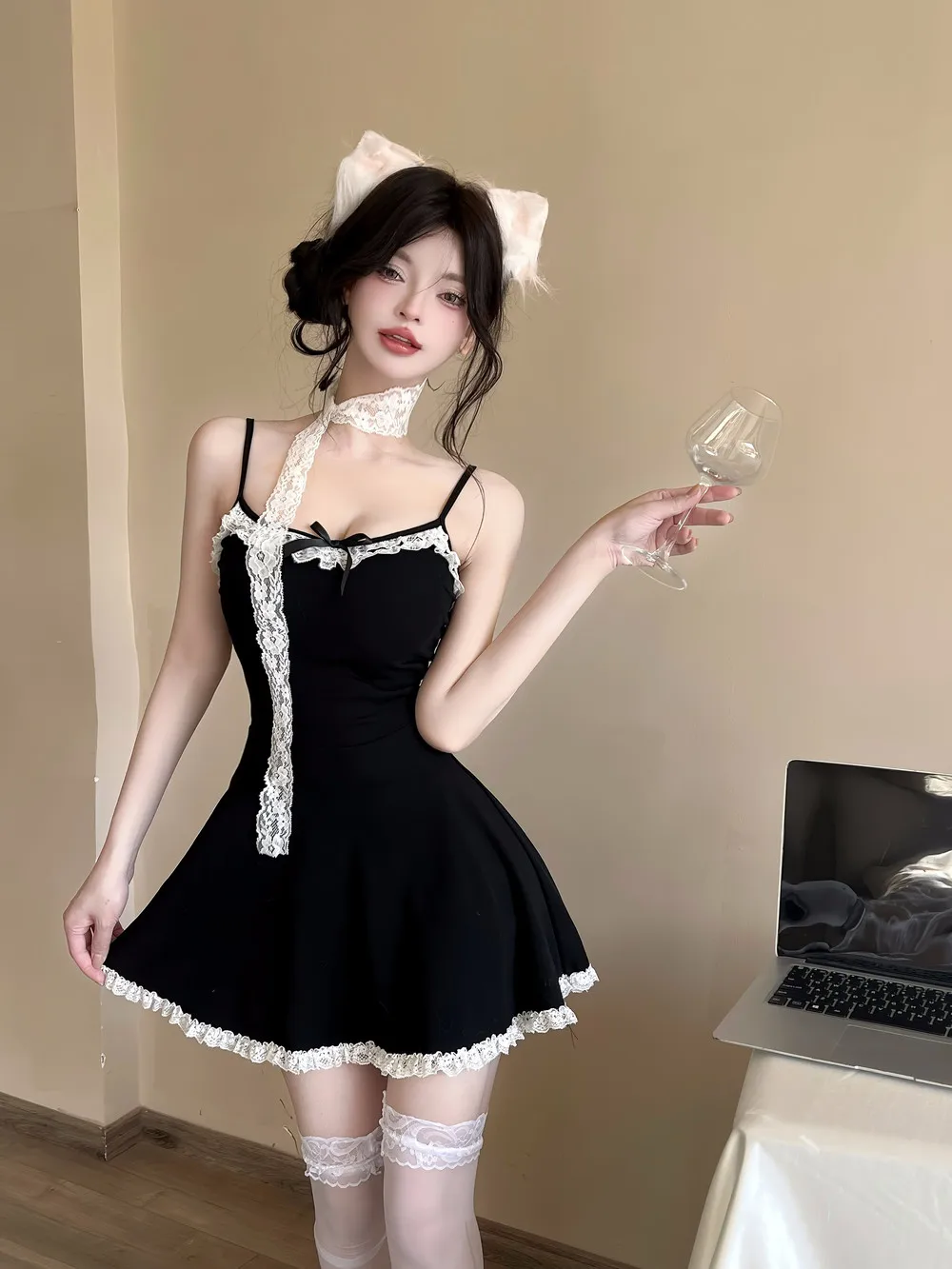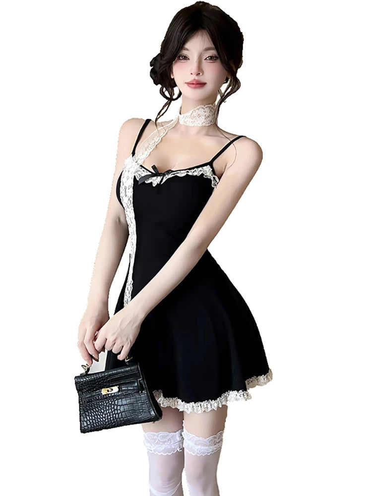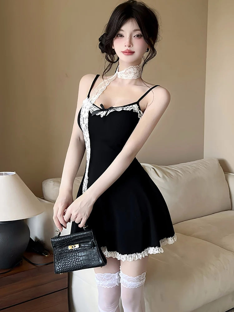 DAIIIBABYYY - Black Patchwork Lace Bow Sling Sexy Mini Dresss Women Elegant Casual Y2k Dress Summer Korean Fashion Bodycon Evening Dress