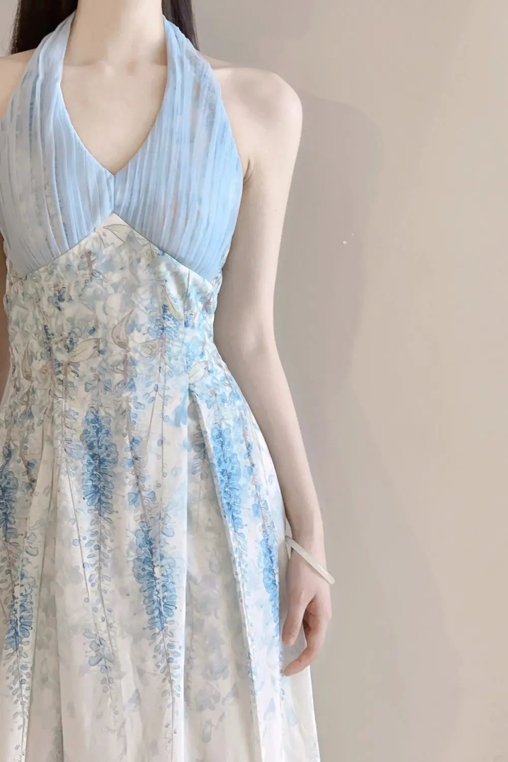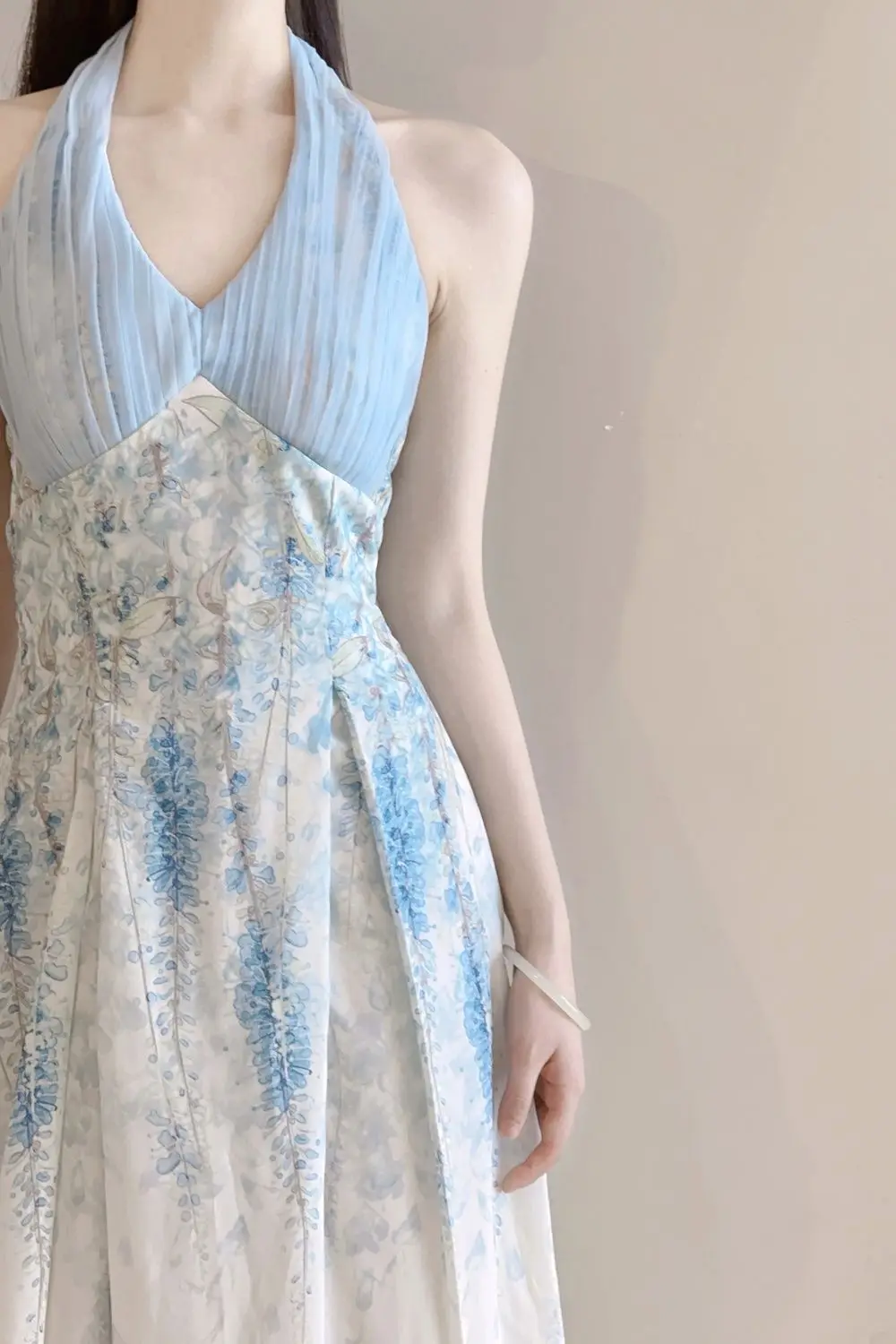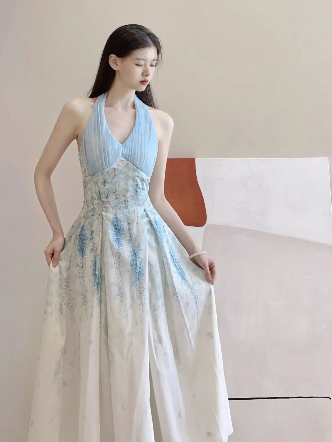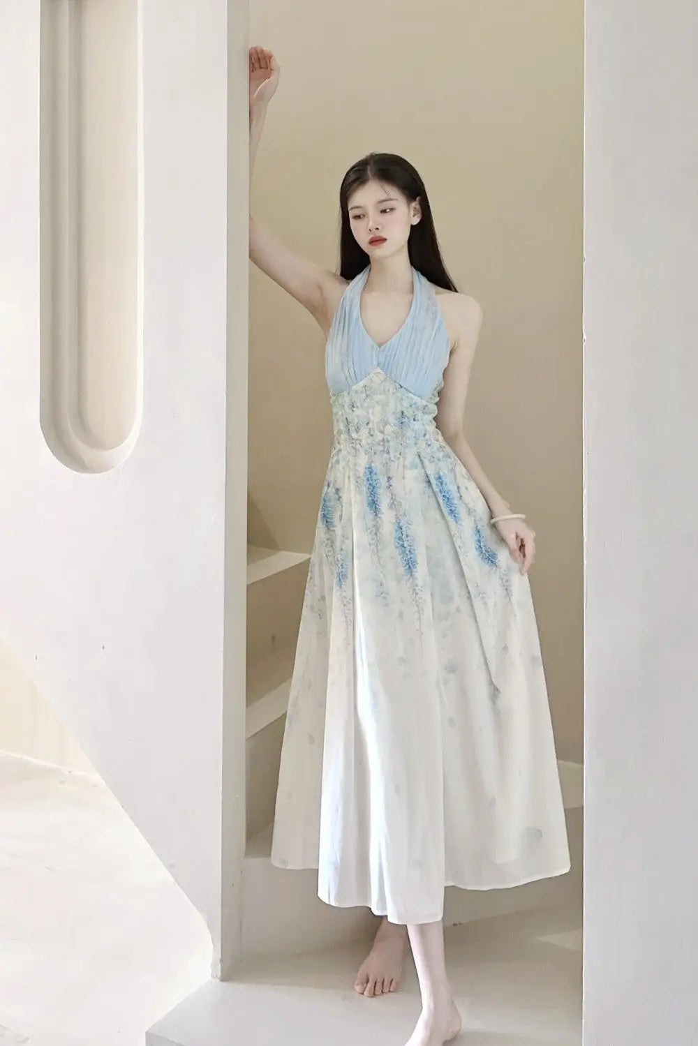 DAIIIBABYYY - Blue Neck Cinched Waist Slimming Floral Dress Women Summer New Style Fresh Sweet Super Fairy Temperament Long Dresses