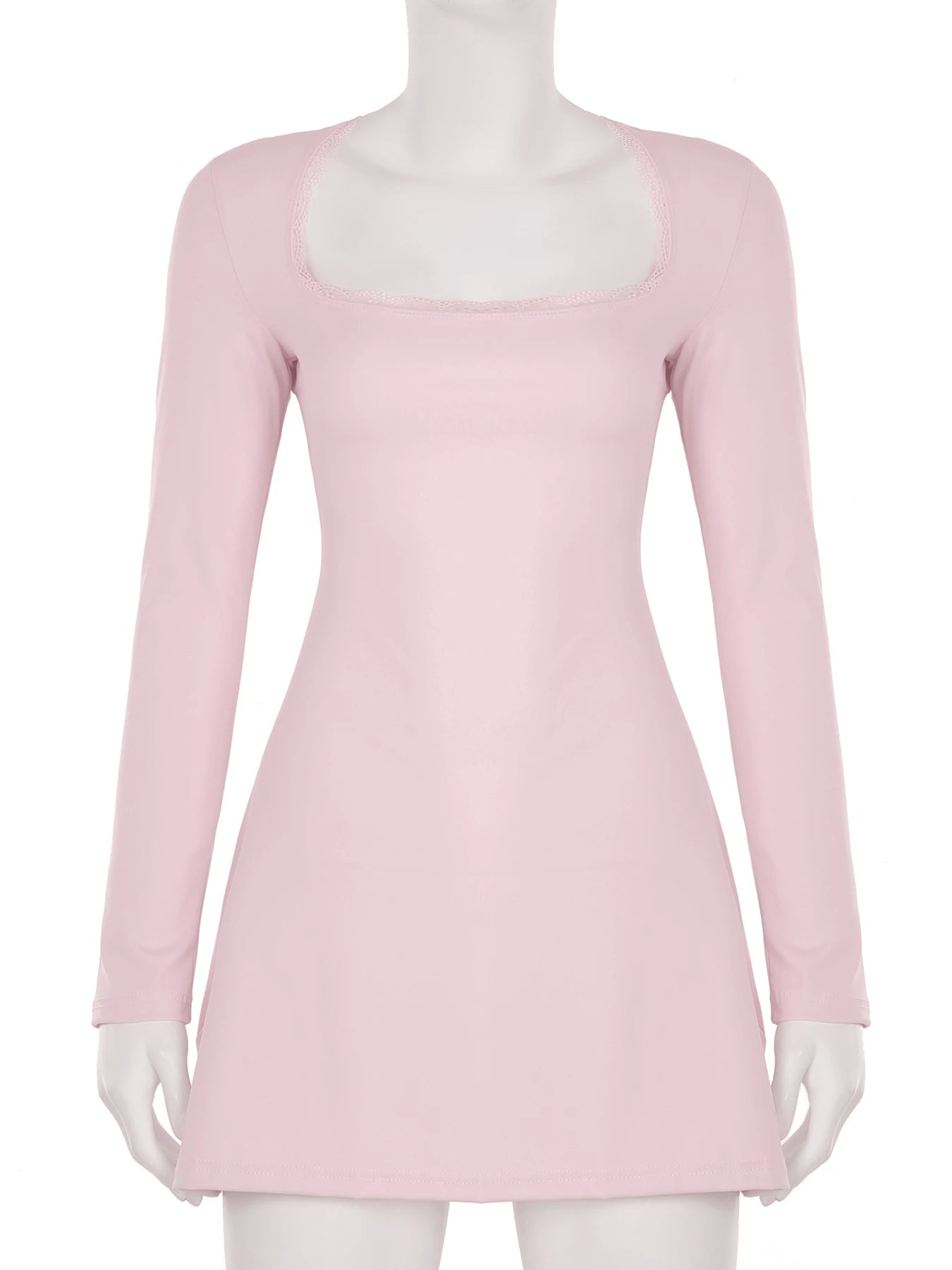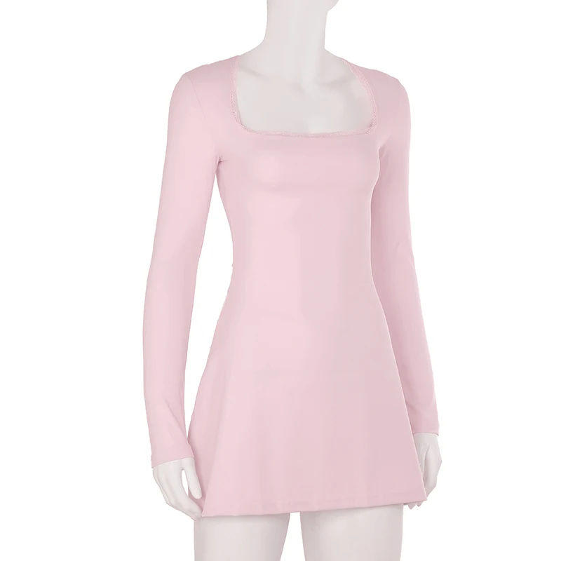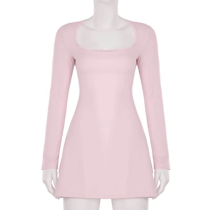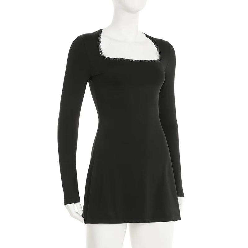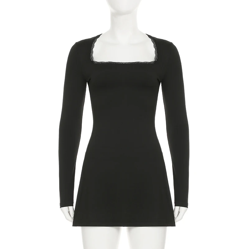 DAIIIBABYYY - Casual Solid Lace Trim Bodycon Dress Slim Square Collar Long Sleeve Mini Dresses For Women 2025 Spring Autumn Streetwear