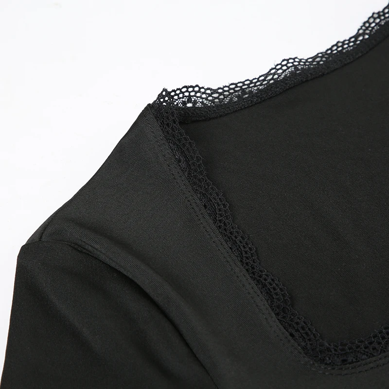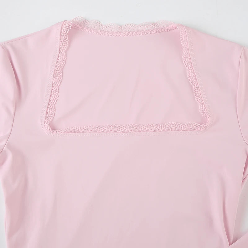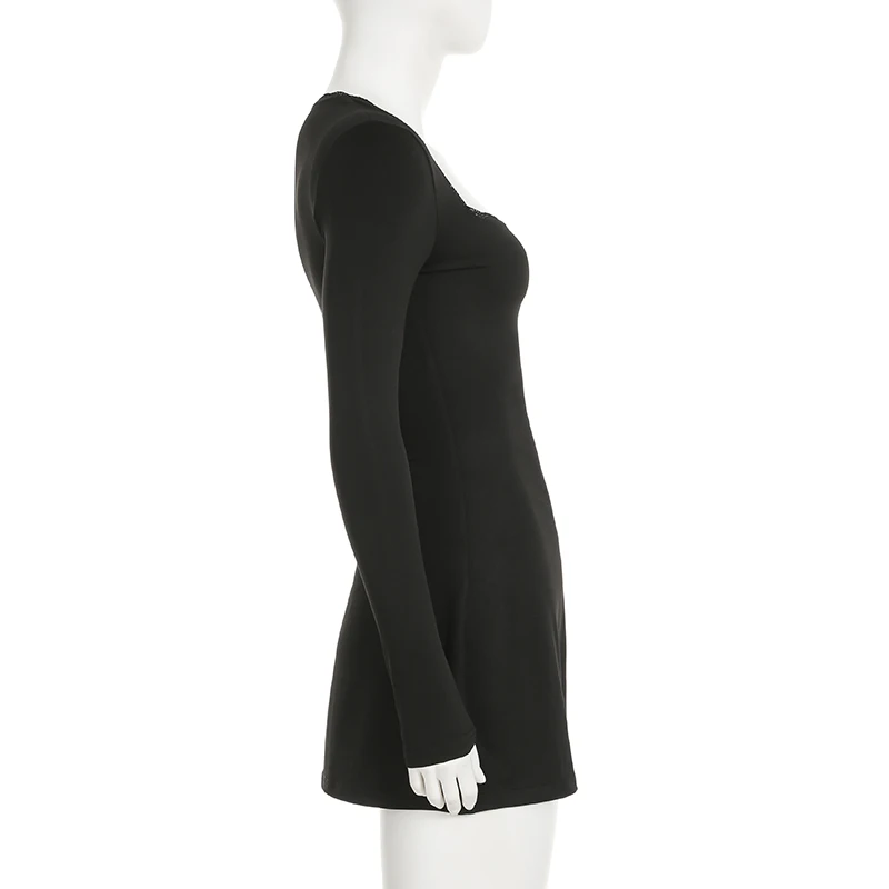 DAIIIBABYYY  -  Casual Solid Lace Trim Bodycon Dress Slim Square Collar Long Sleeve Mini Dresses For Women 2025 Spring Autumn Streetwear