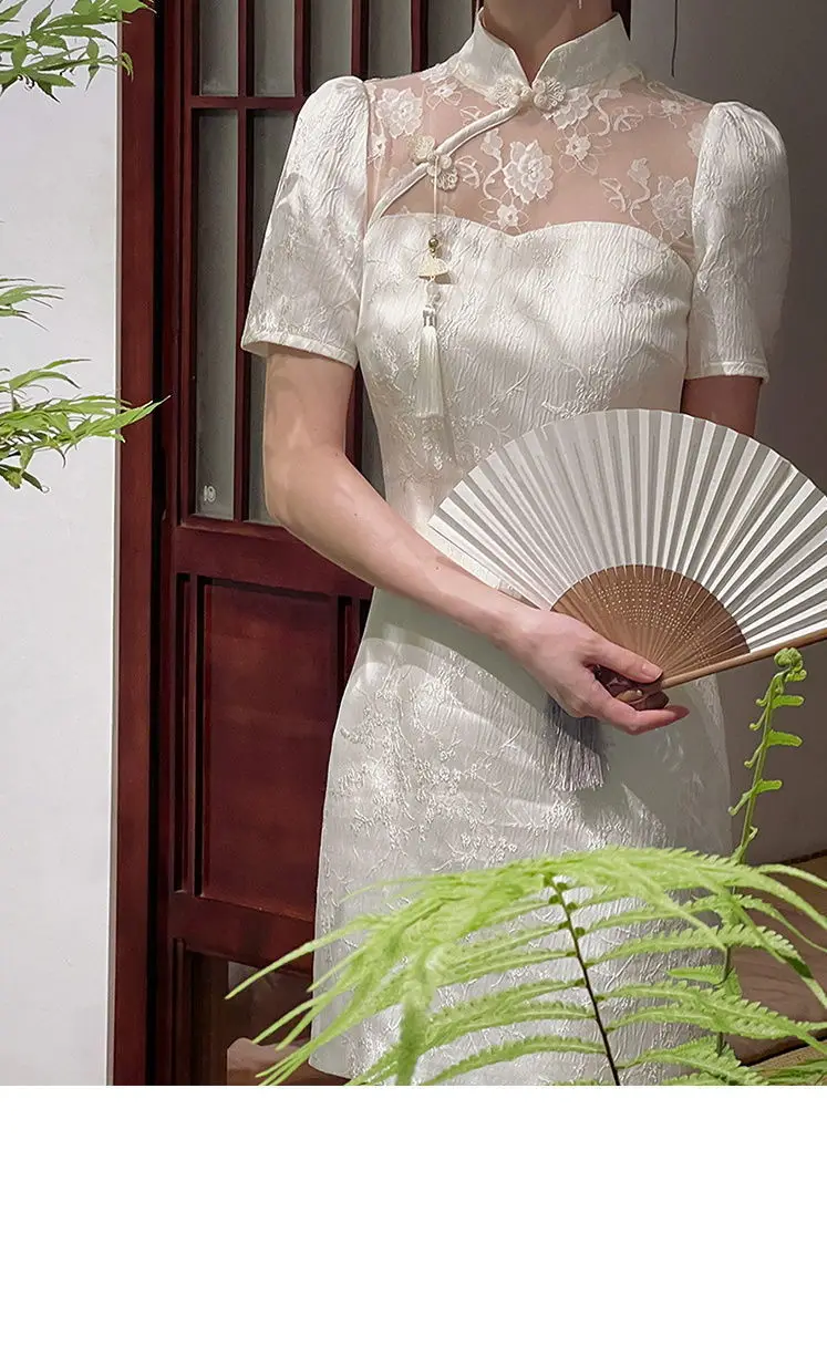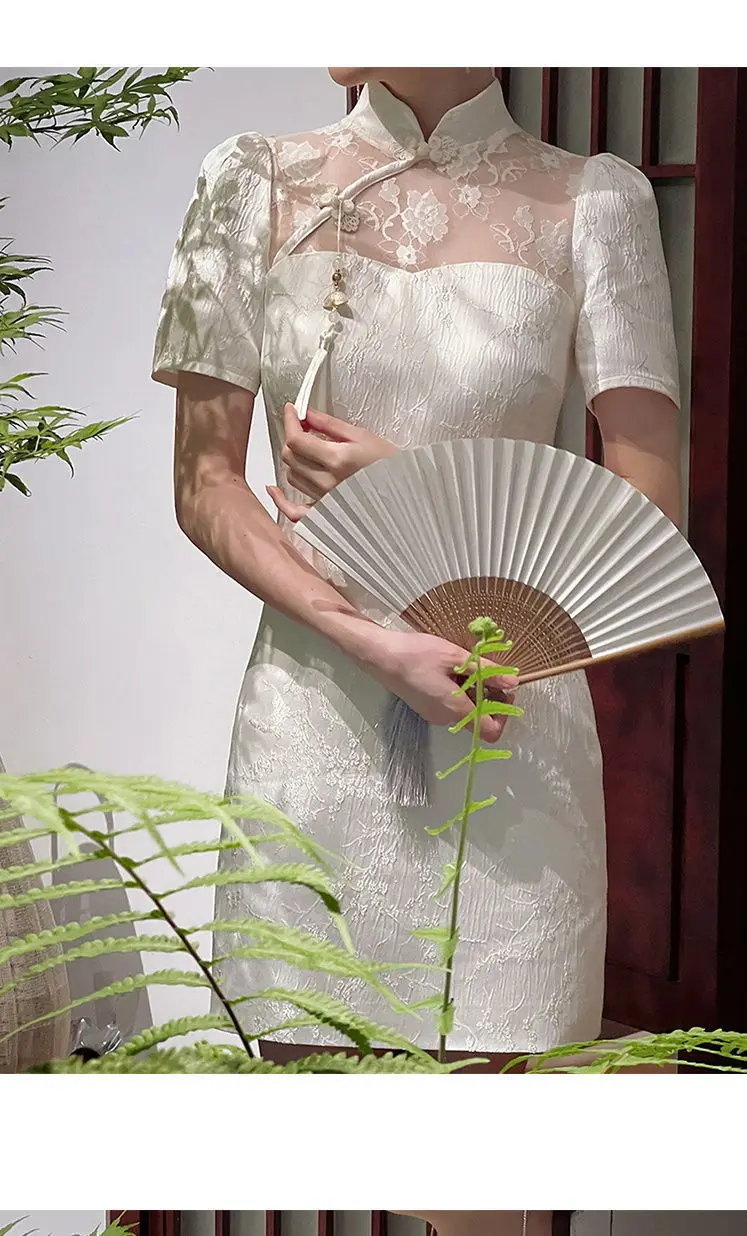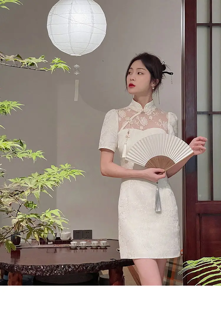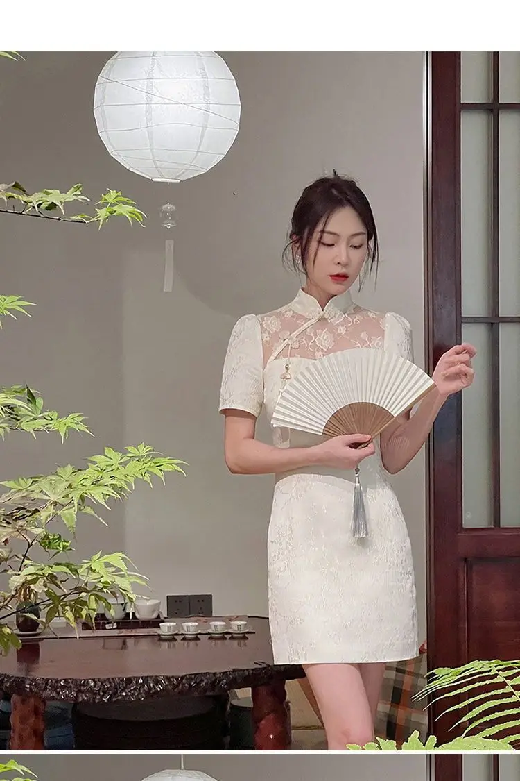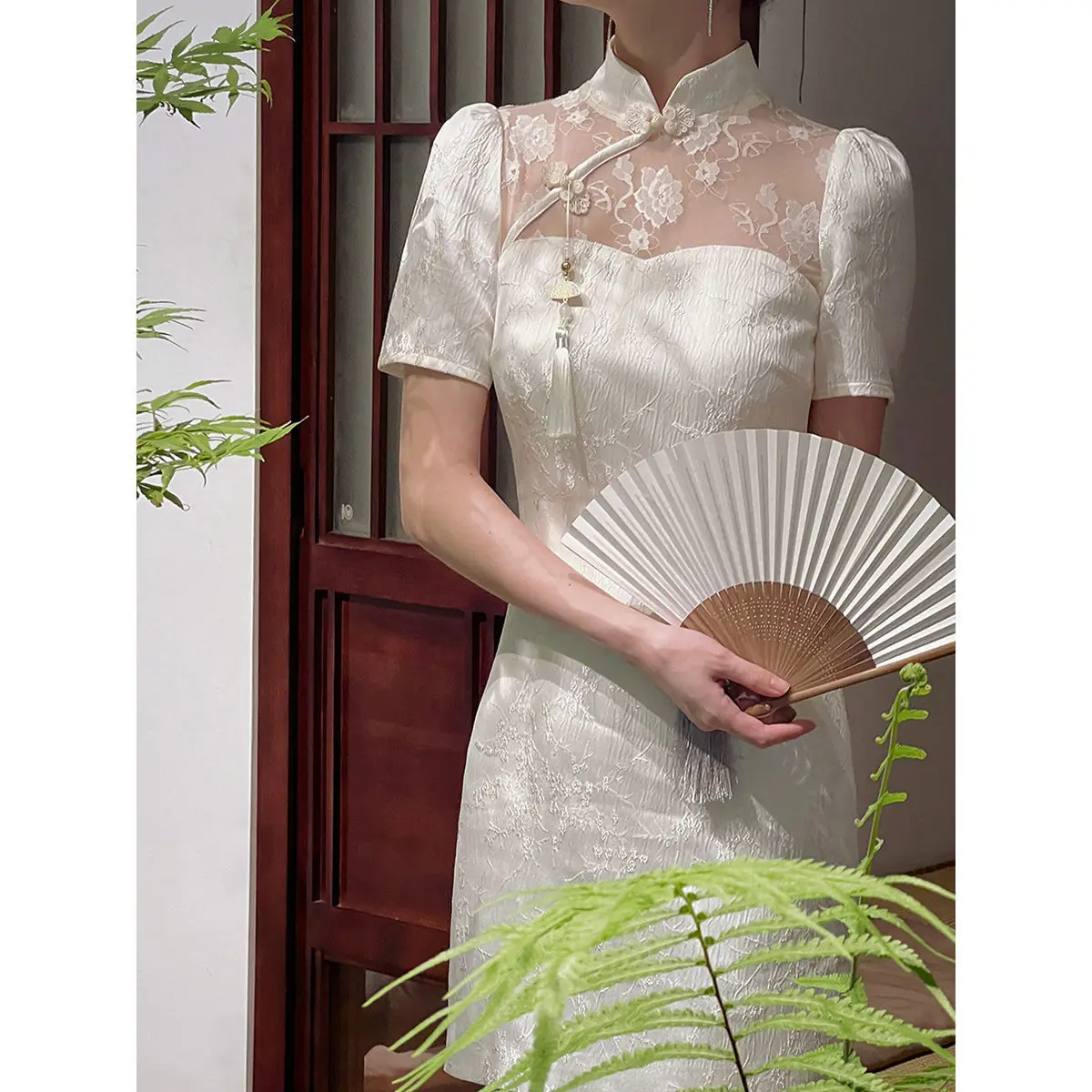 DAIIIBABYYY  -  Chinese Qipao Summer White Rose Improved Cheongsam Elegant Women Jacquard High Waist Daily Qipao Party Dress Women