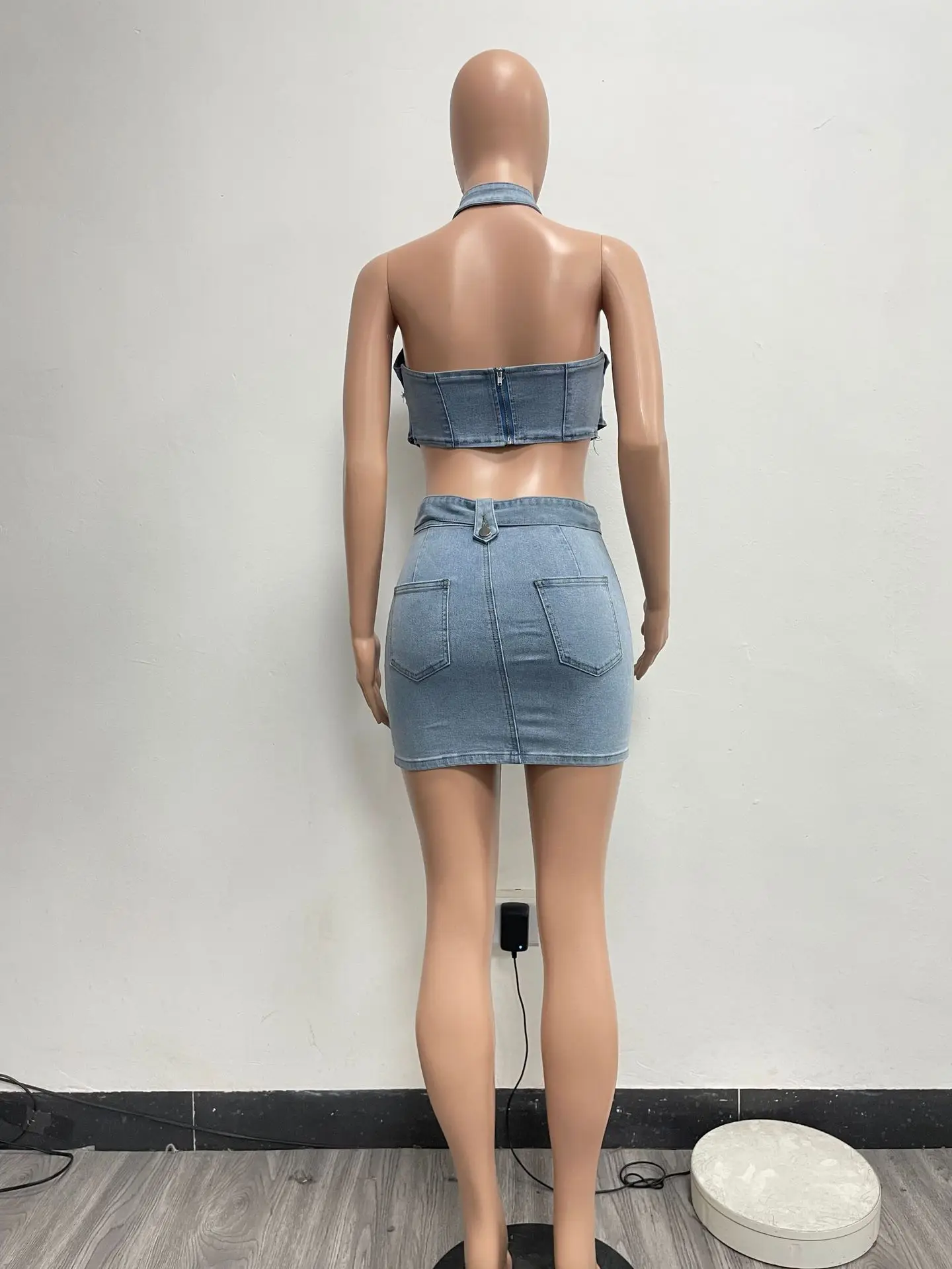 DAIIIBABYYY - Denim Crop Tops Dress 2 Piece Mini Skirt Sets Women Sexy Cargo Dress Y2K Denim Jean Two Piece Sets Summer Outfits Clothes