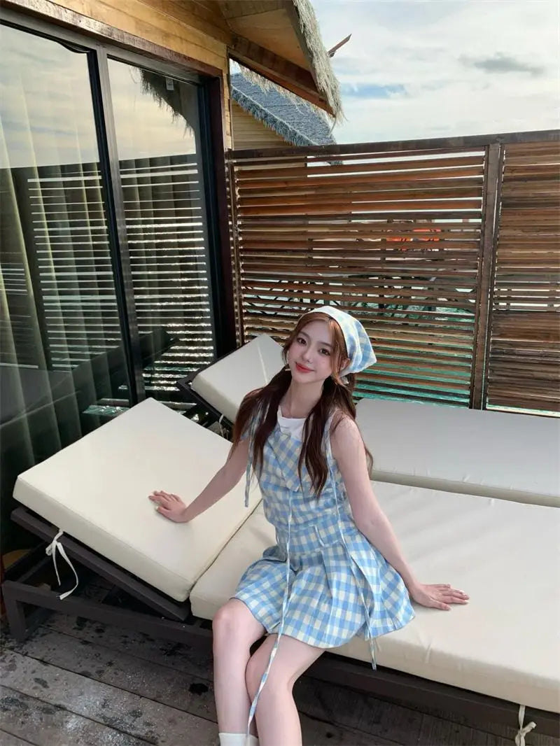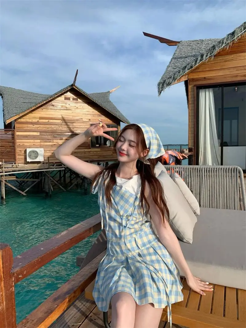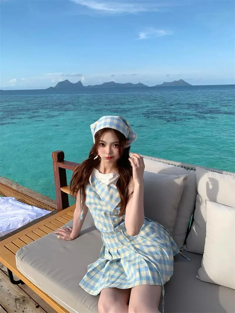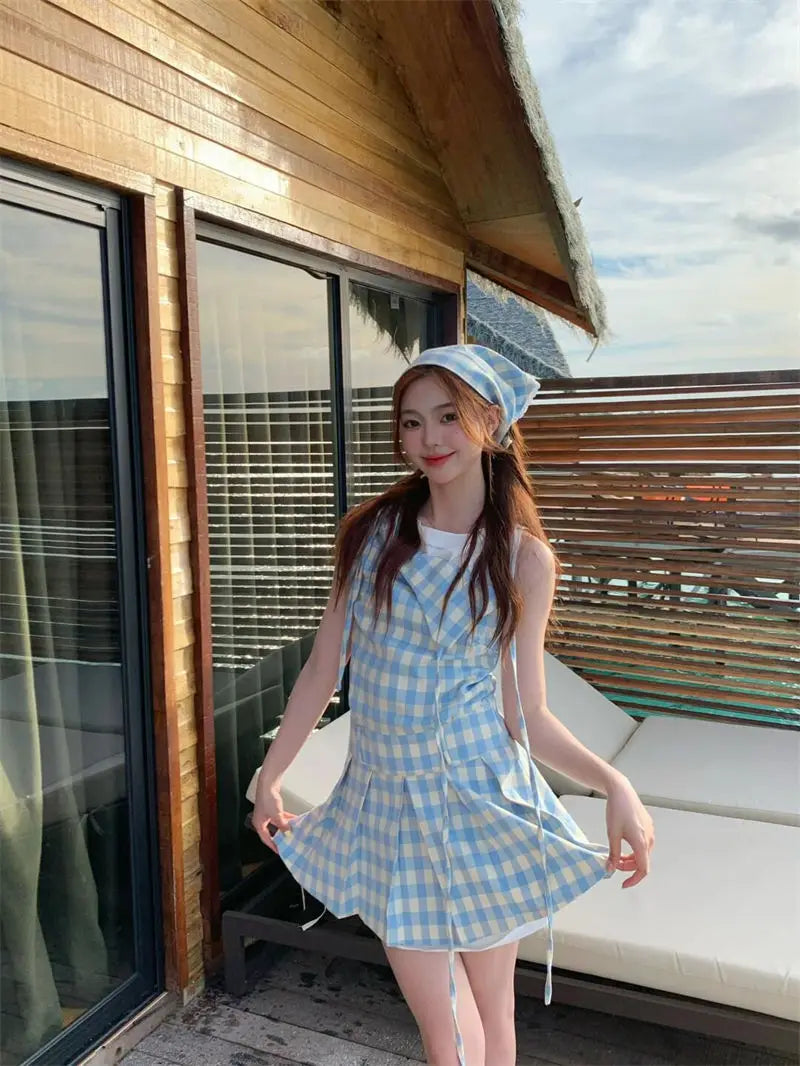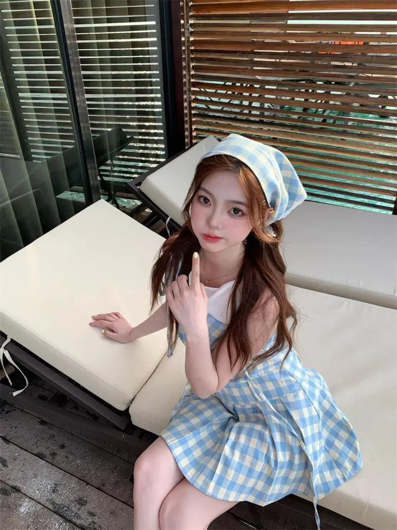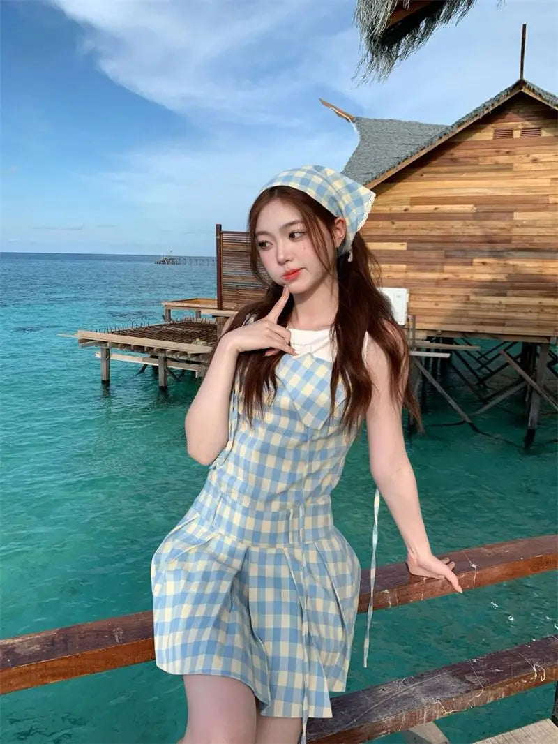 DAIIIBABYYY - Design Sense Niche Girl Sleeveless Short Style Small Fresh Blue Checkered Headband 2025 New Women Summer Slimming Dress