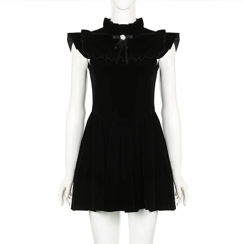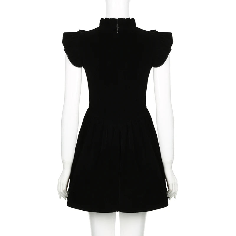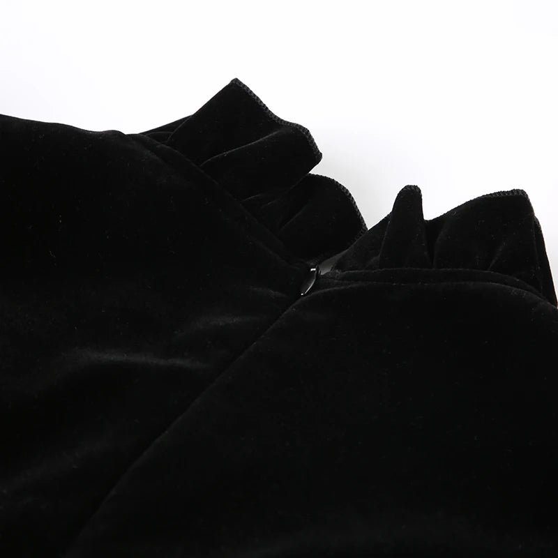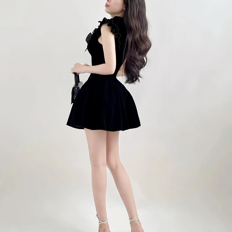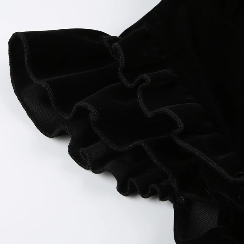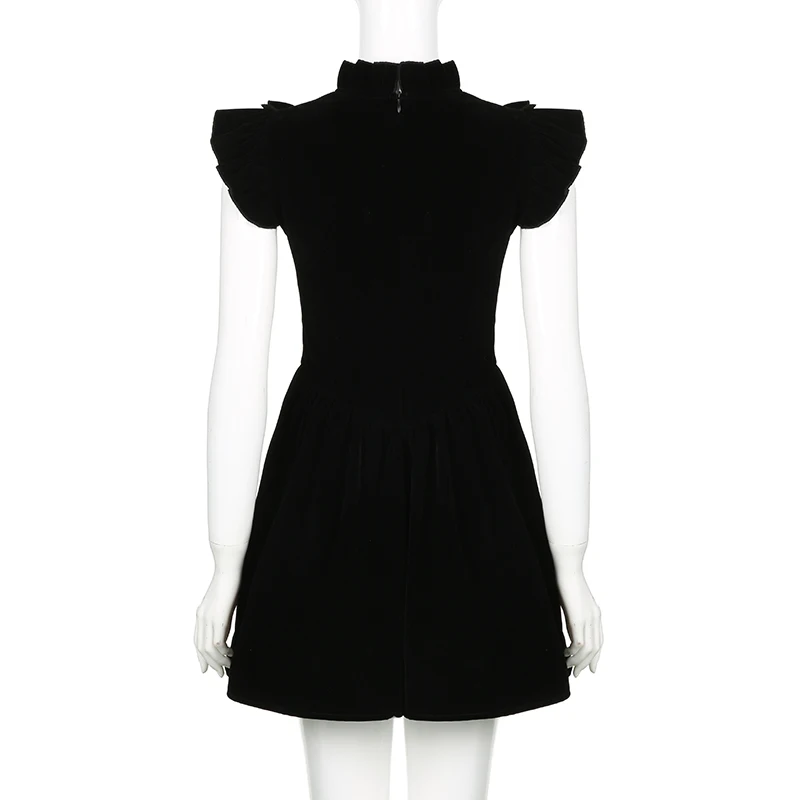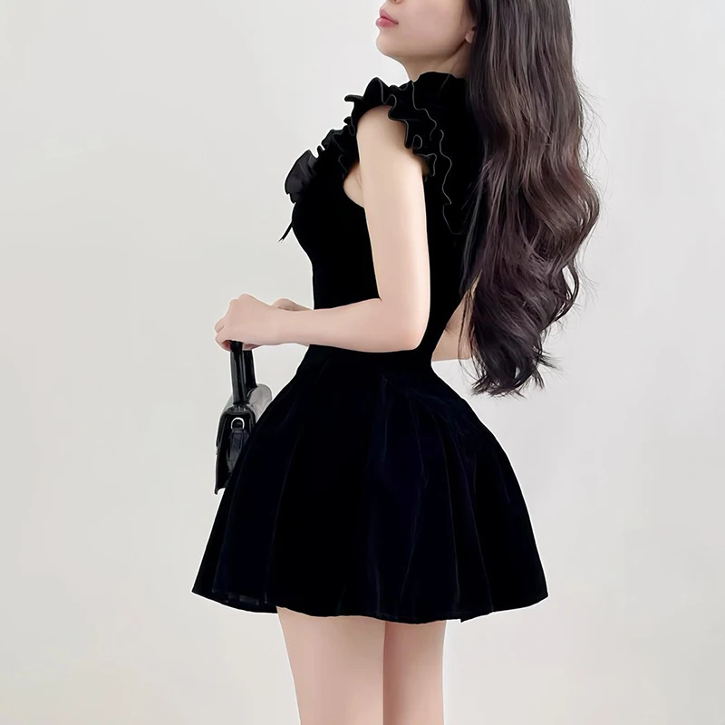 DAIIIBABYYY - Elegant Black Velvet Dress Retro 2000s Ruched Patchwork Short Sleeve Party Dresses for Women Japanese y2k Ladies Outfits
