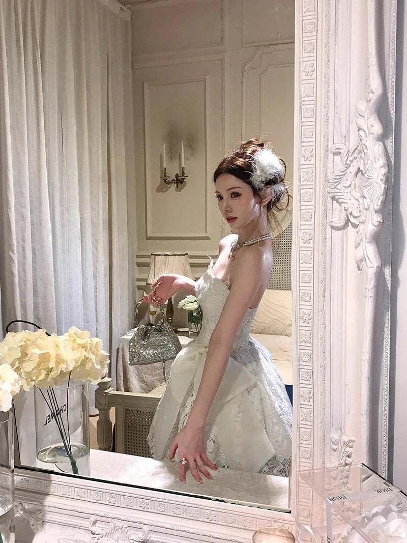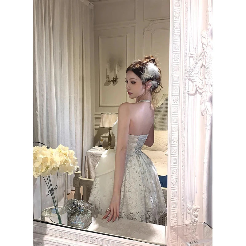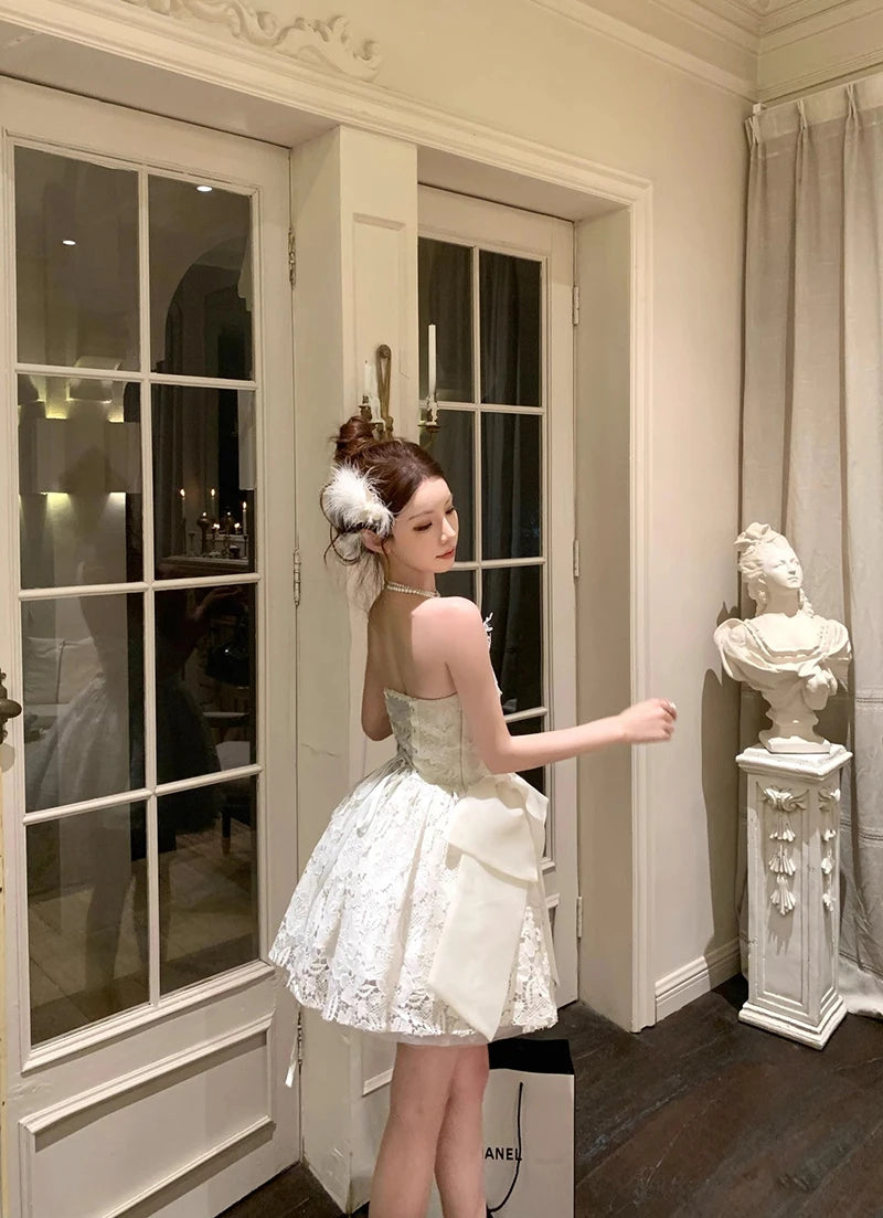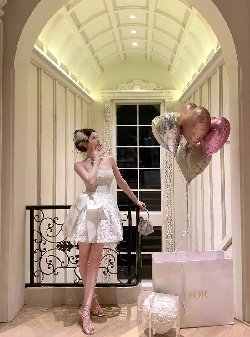 DAIIIBABYYY - Elegant Bow Mini Dress Women Fairy Party Prom Lace Strapless Dresses Summer Korean Sexy Backless Bodycon A Line Vestidos