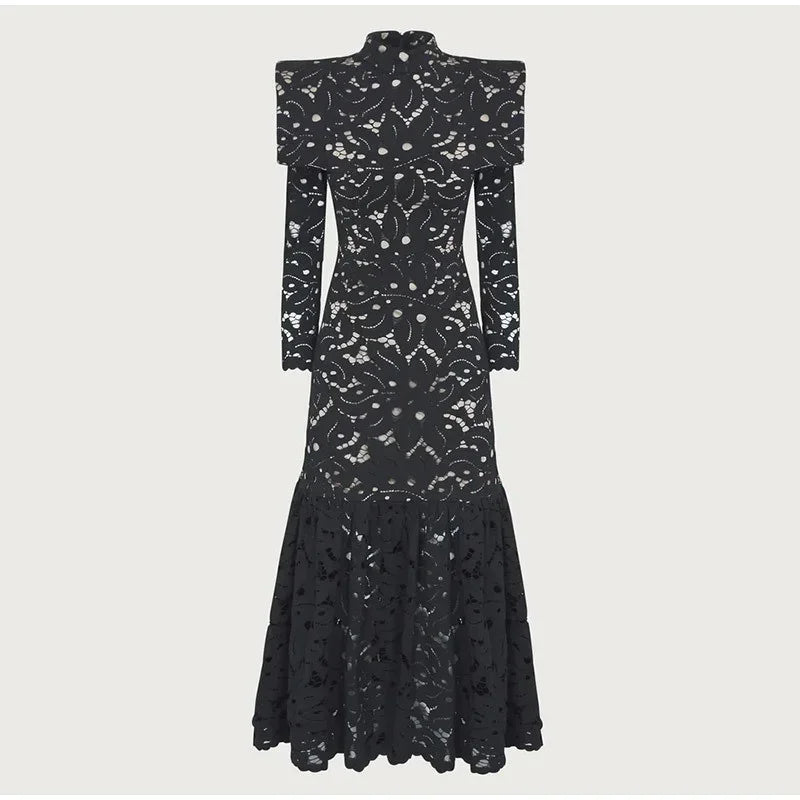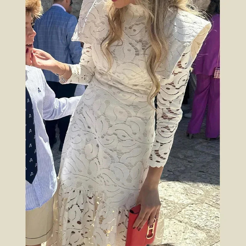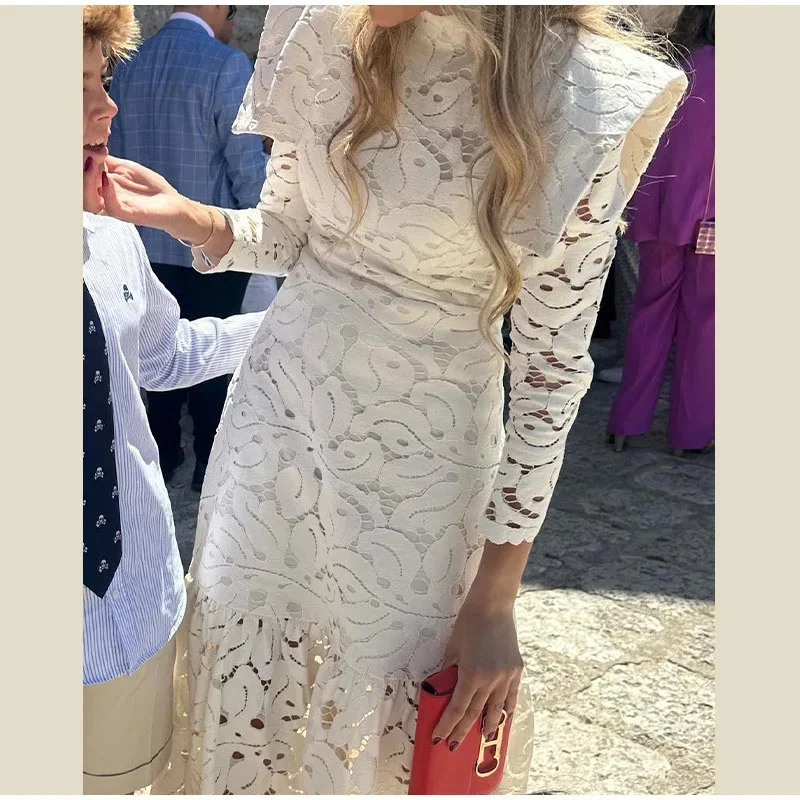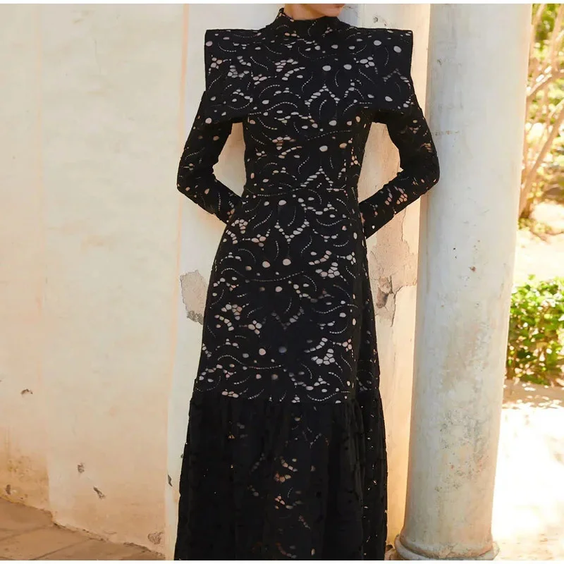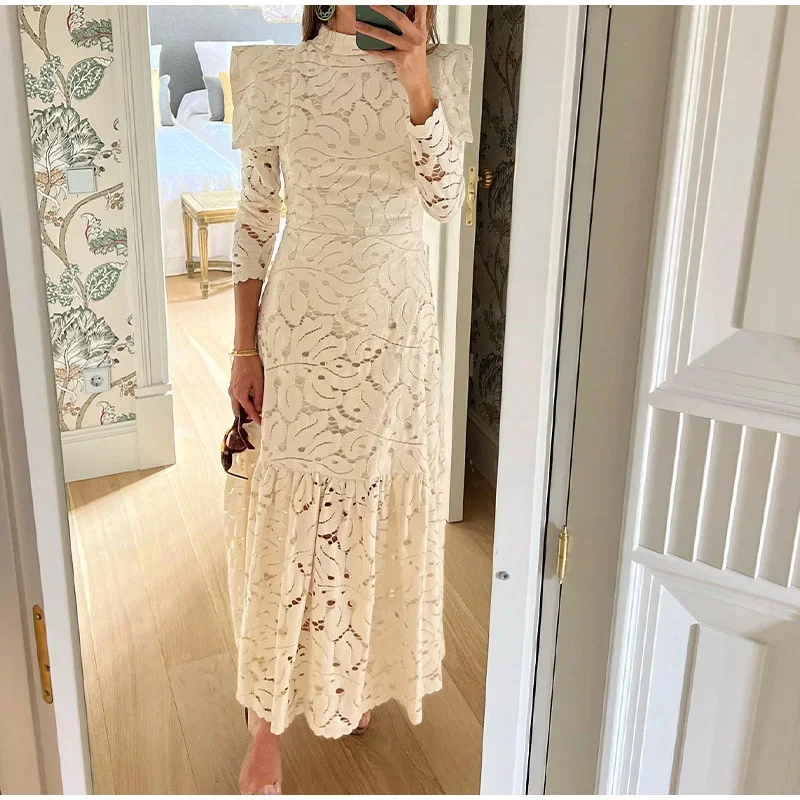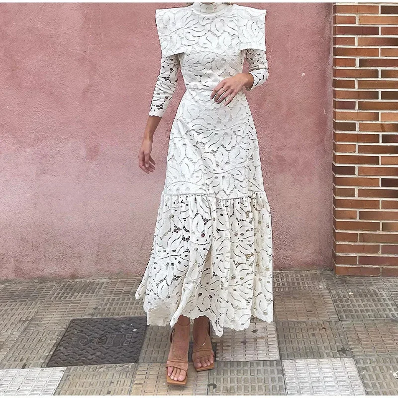 DAIIIBABYYY - Elegant Hollow Out Lace Maxi White Dress Women's Fashion Mock Neck Long Sleeved Shoulder Padded Robe Evening Females Wear