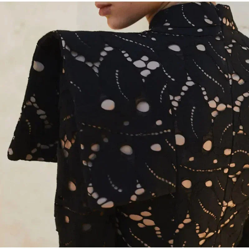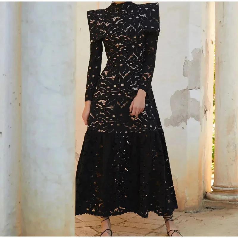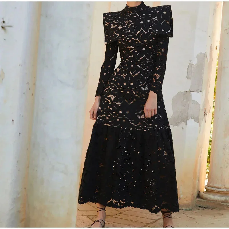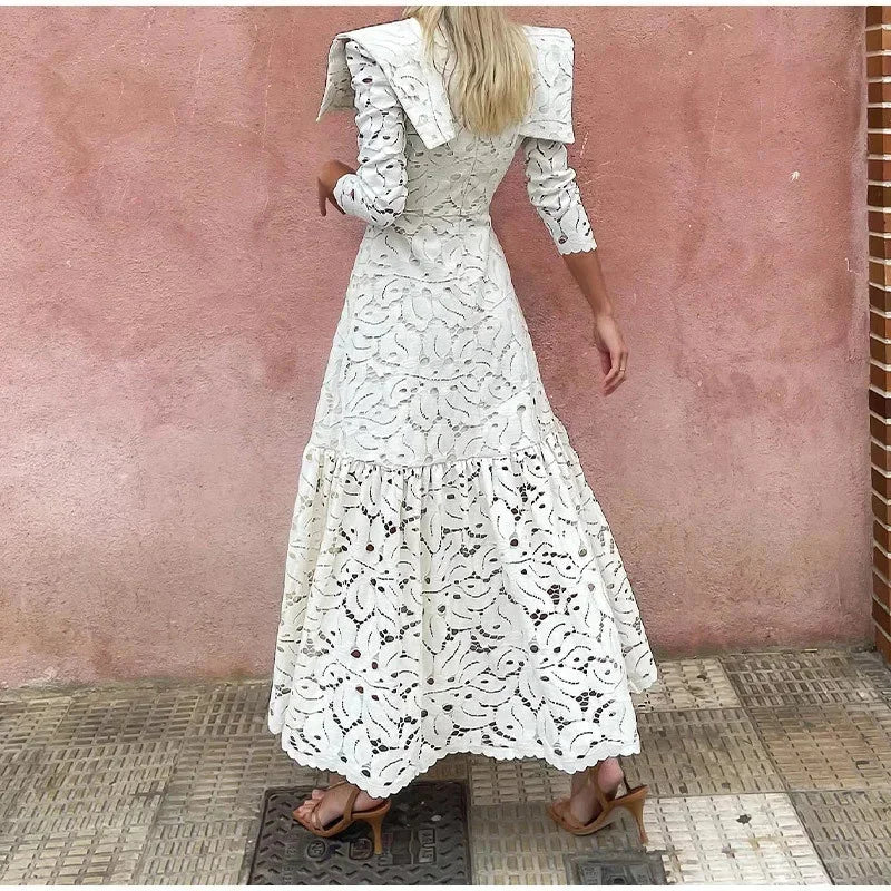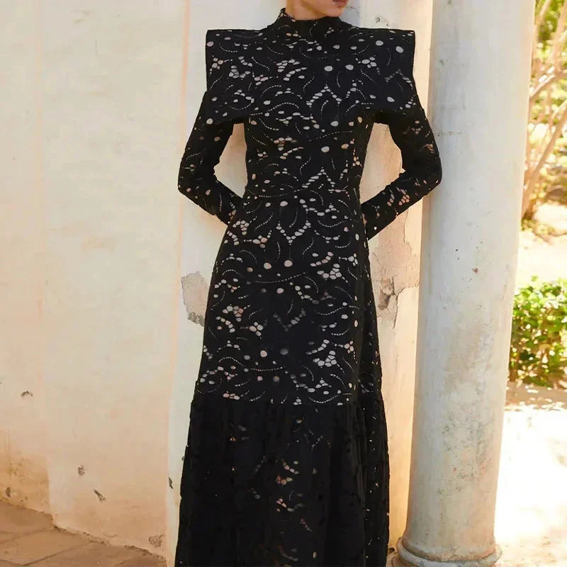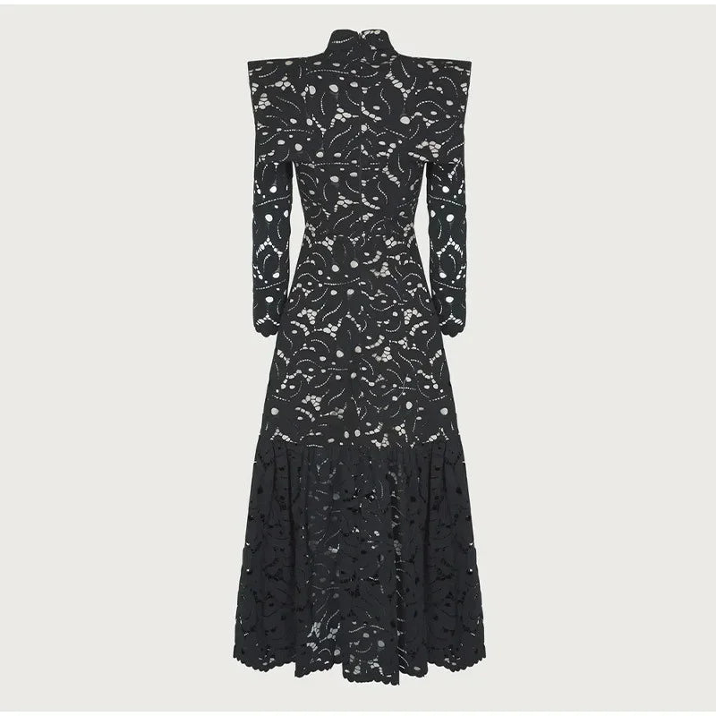 DAIIIBABYYY - Elegant Hollow Out Lace Maxi White Dress Women's Fashion Mock Neck Long Sleeved Shoulder Padded Robe Evening Females Wear