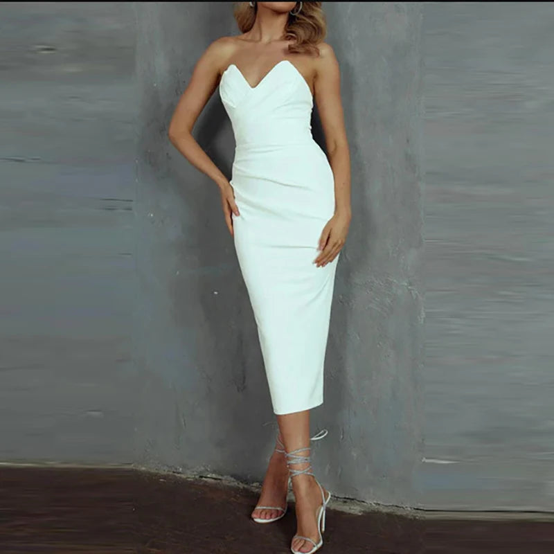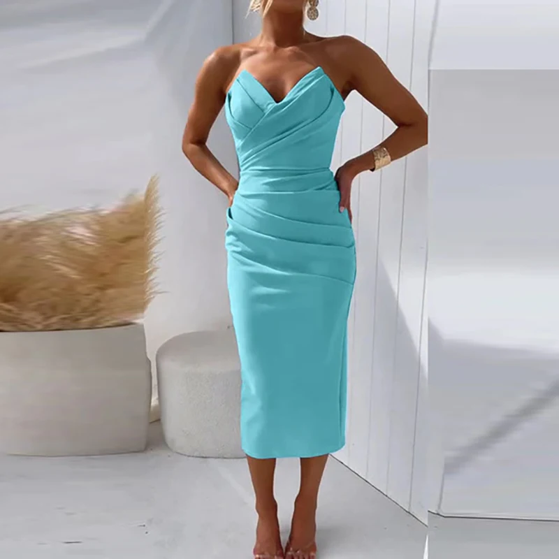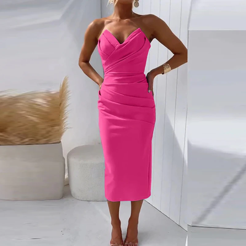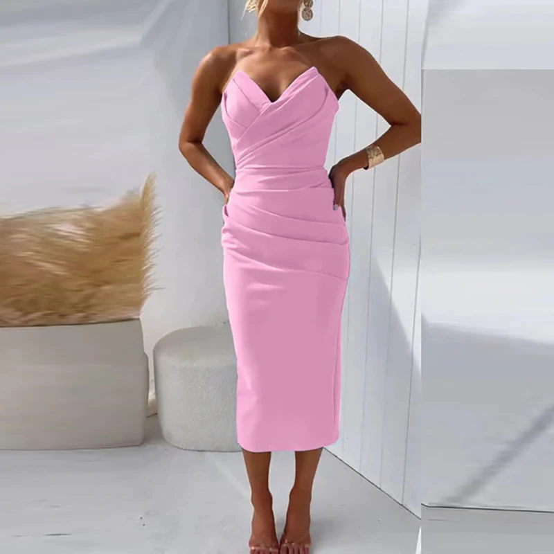 Daiiibabyyy Elegant Strapless Draped Sheath Long Dress Women Sexy Backless Solid Slim Fit Party Dress Fashion Sleeveless Waist Evening Dress