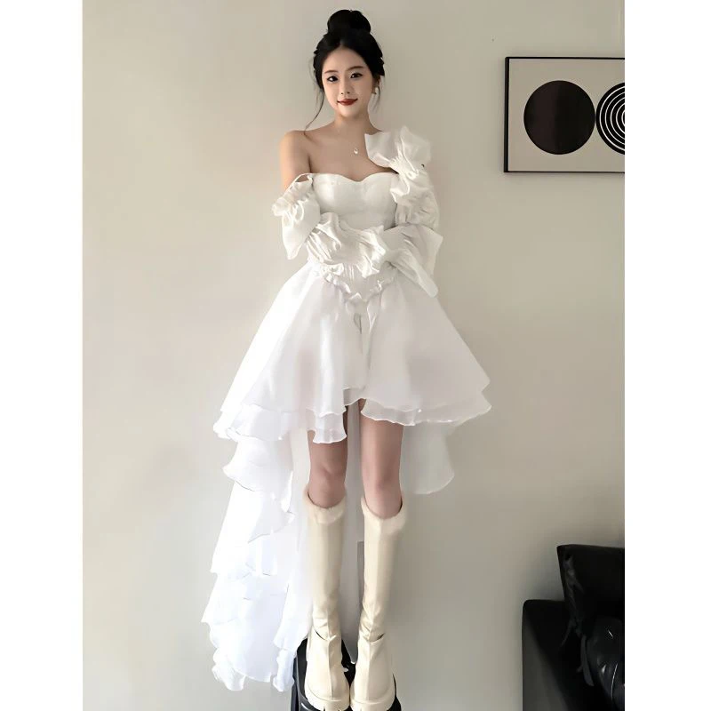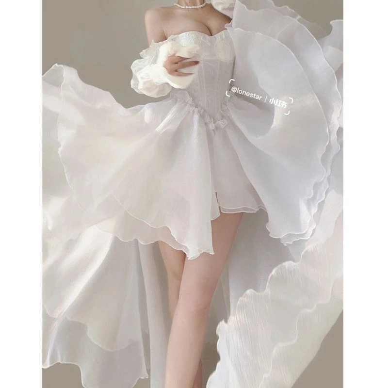 DAIIIBABYYY - Fairy White Midi Dress Women Evening Party Prom Slash Neck Irregular Dresses Summer Korean Long Sleeve Bodycon Vestidos