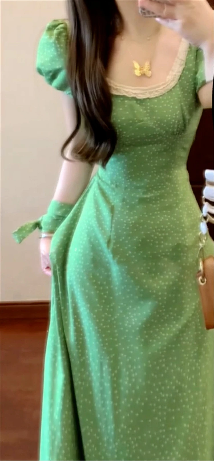 DAIIIBABYYY - French Bubble Sleeve Wave Point Green Dress For Women Summer New Seaside Vacation High Waist Temperament Long Style Dresses