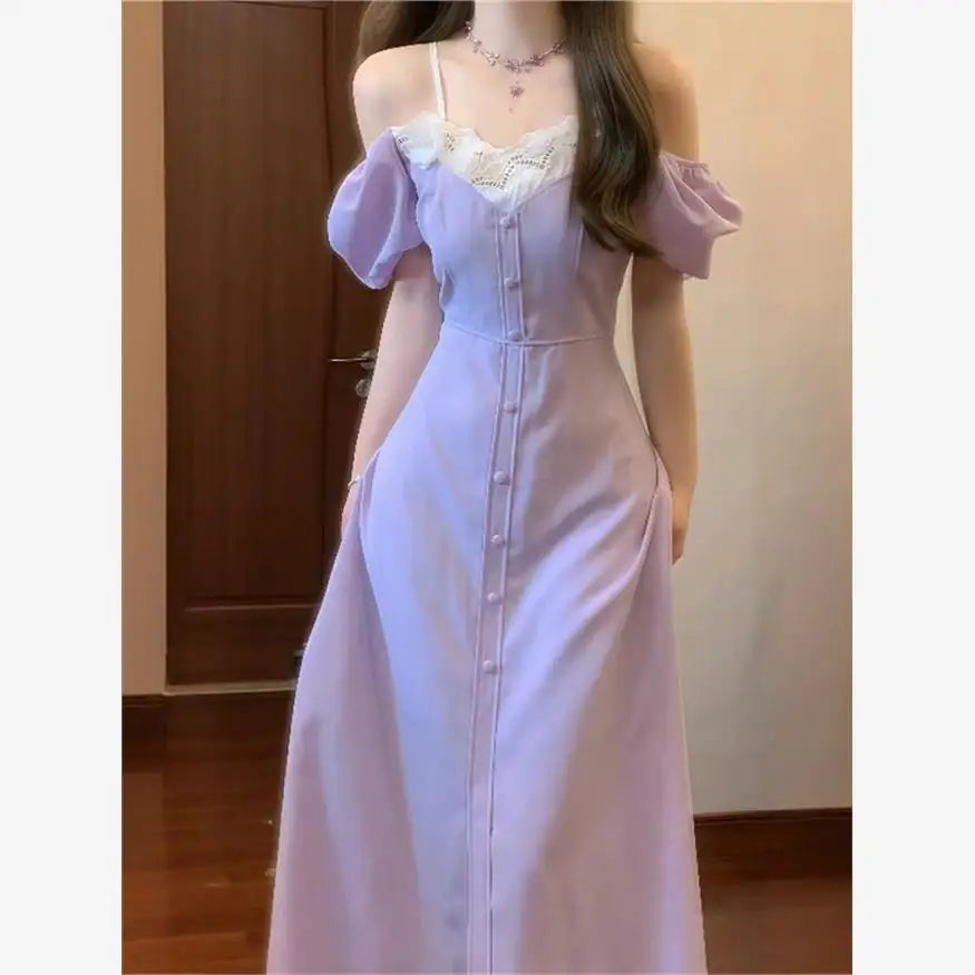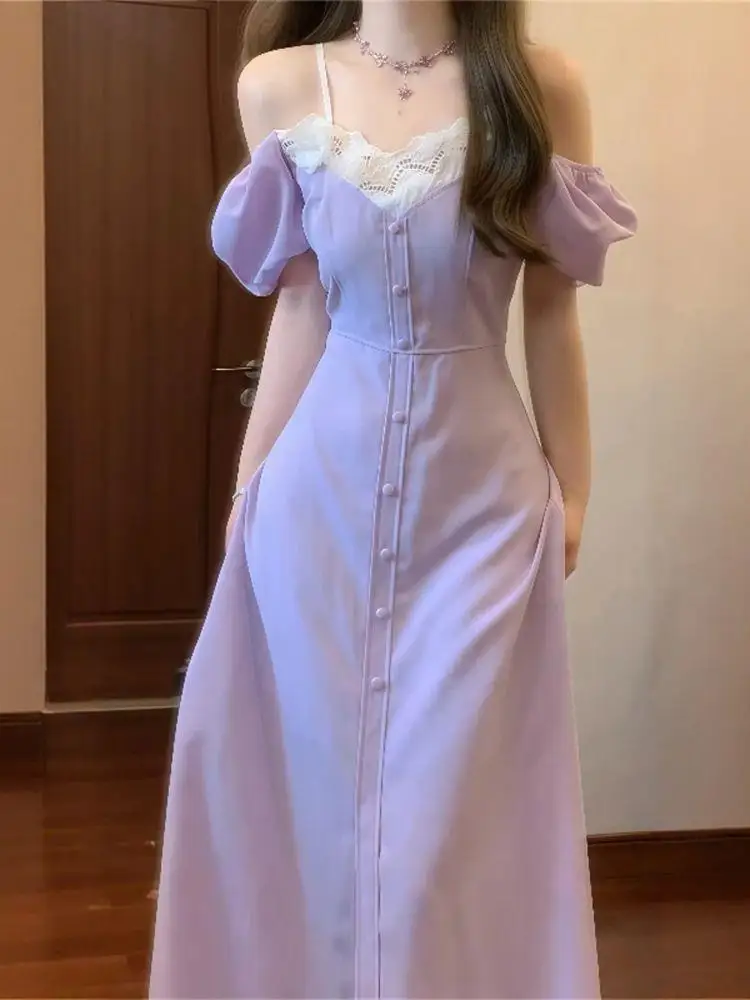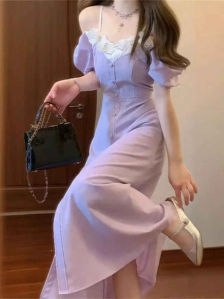 DAIIIBABYYY - French Gentle Splicing Lace Purple Bubble Sleeve Dress For Women Summer New Style High End Concealed Waist Elegant Long Dresses