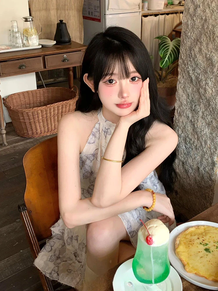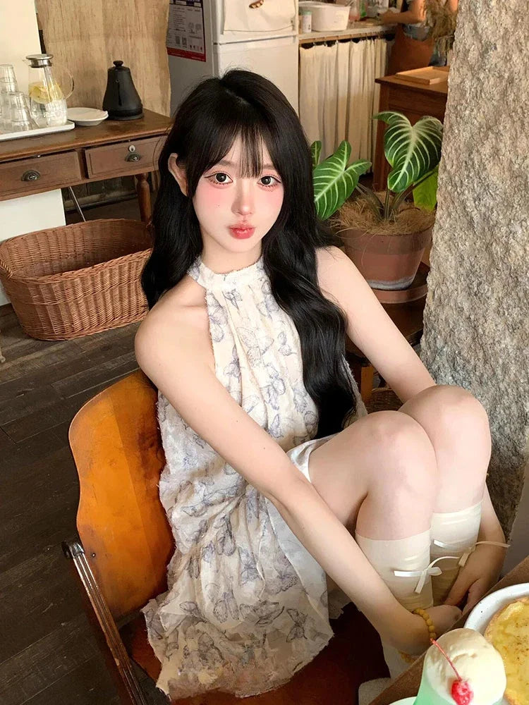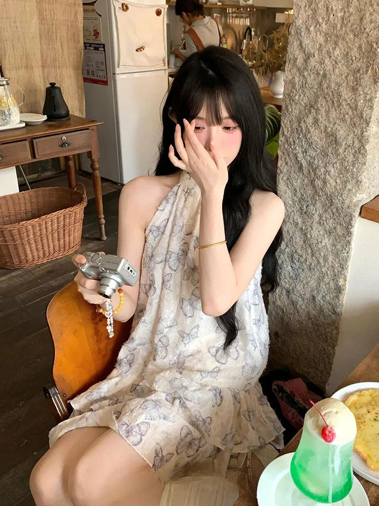 DAIIIBABYYY  -  French Halter Neck Sleeveless Dresses Women's Summer Seaside Resort Style Loose Butterfly Printed Short Dress Female Clothing