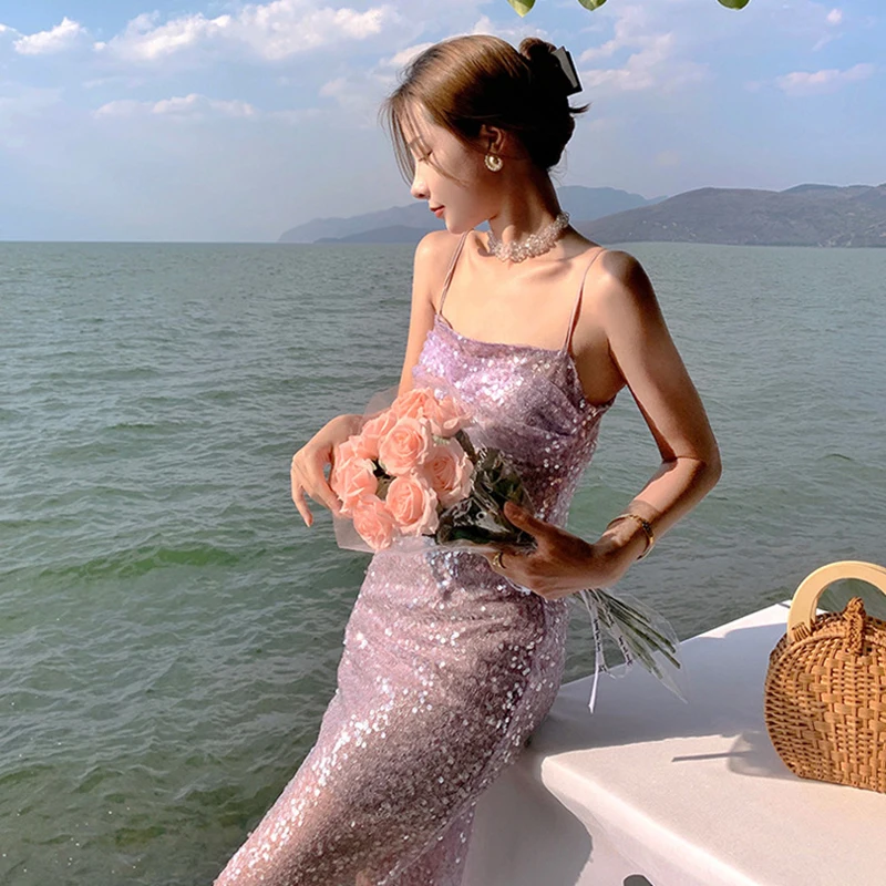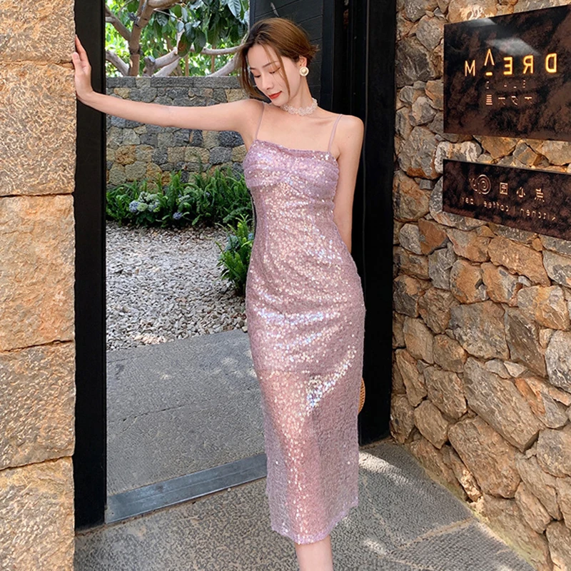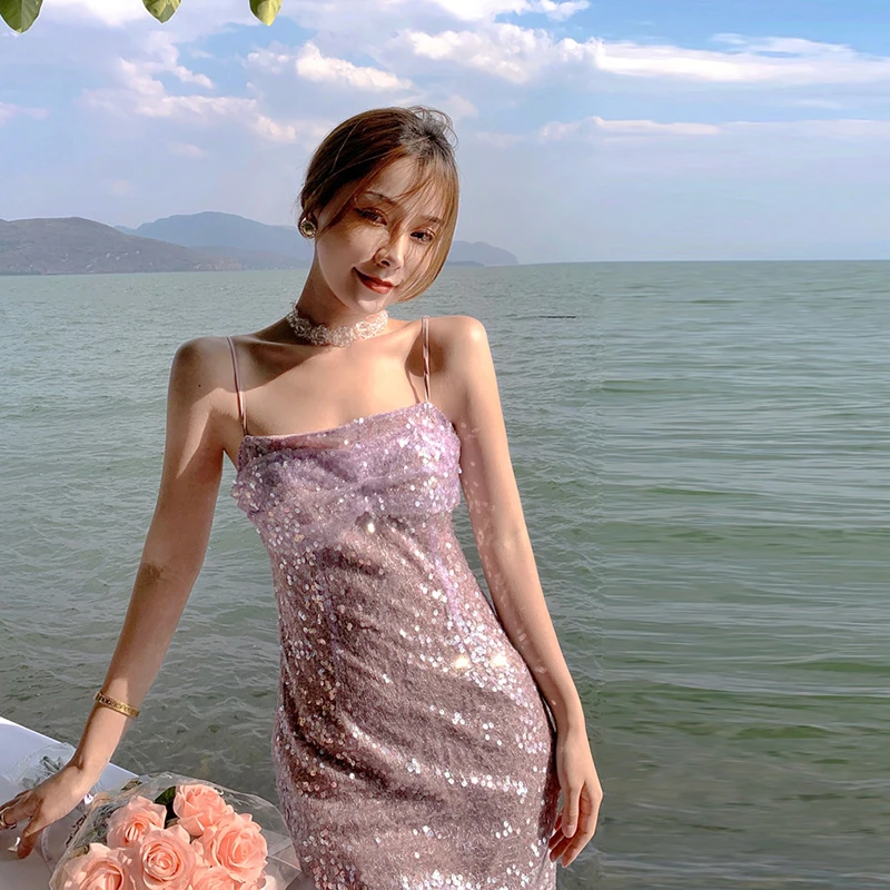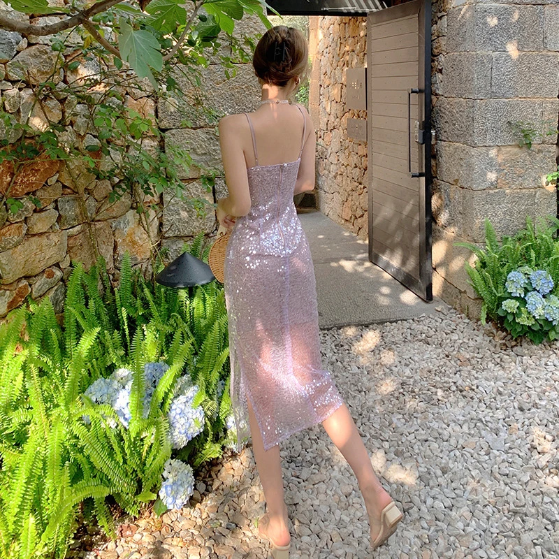 Daiiibabyyy French Sexy Sequins Backless Sling Shiny Dress Women Summer Midi Sheath Party Nightclub Purple Dress New