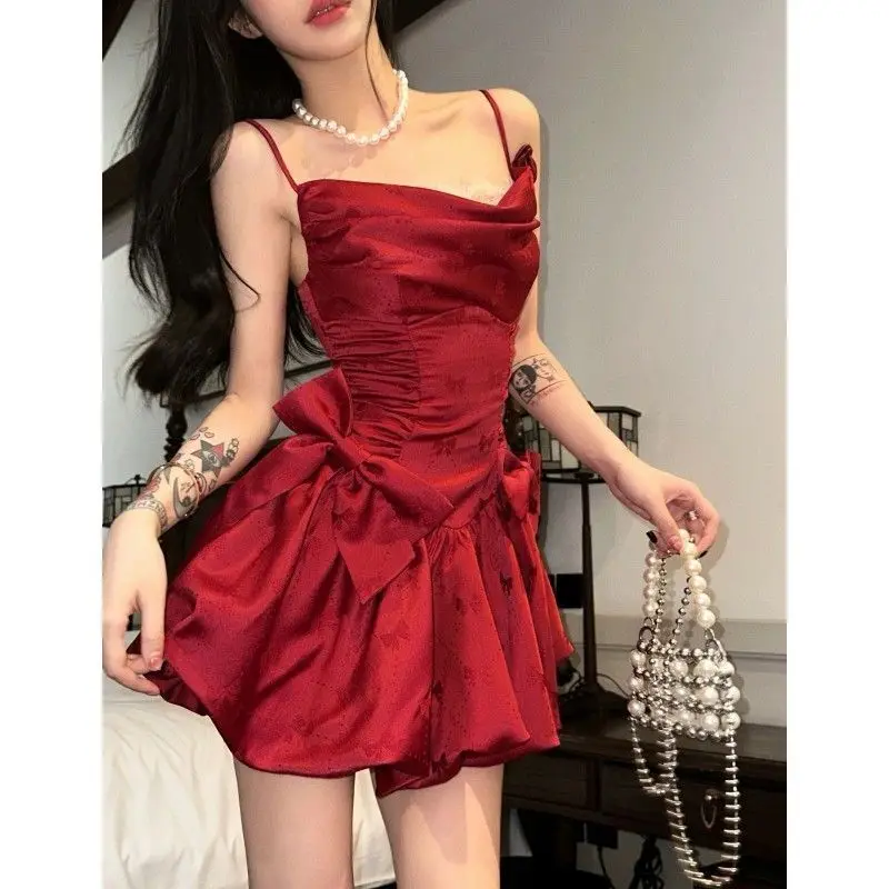 DAIIIBABYYY  -  French Spicy Girl Sexy Red Sleeveless Short Dresses for Women New Retro Ruffle Edge Bow Sweet Waist Slim A-line Sling Dress