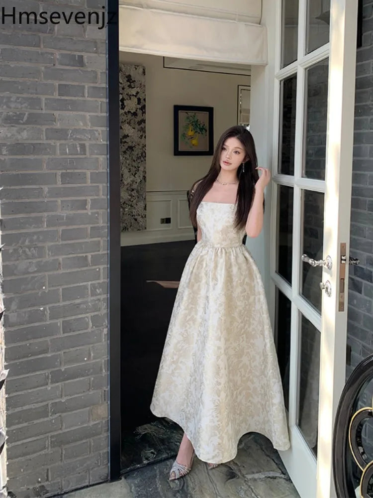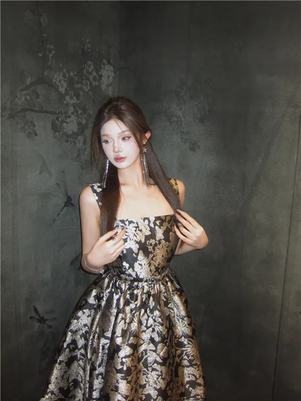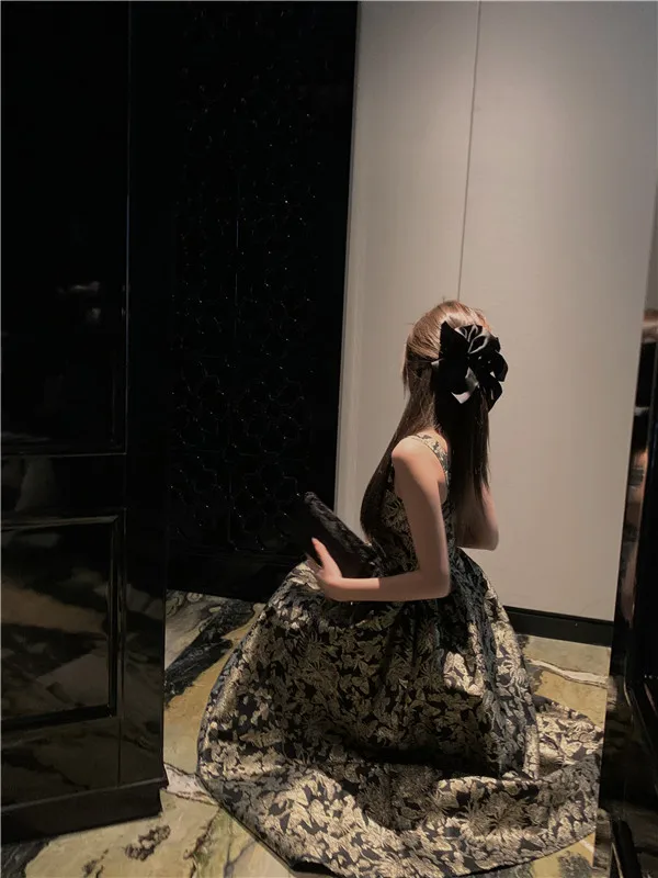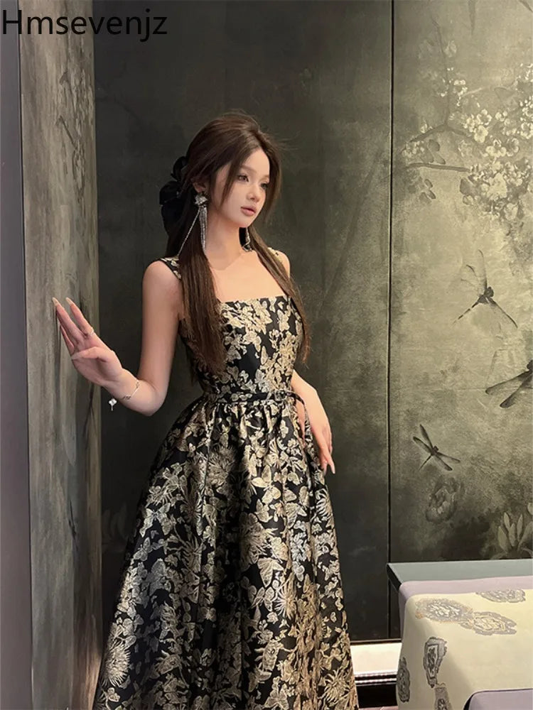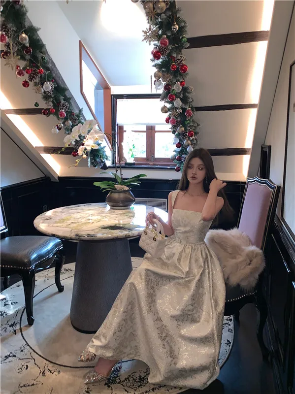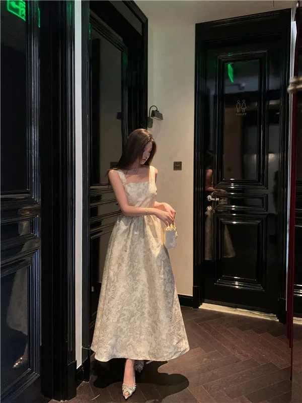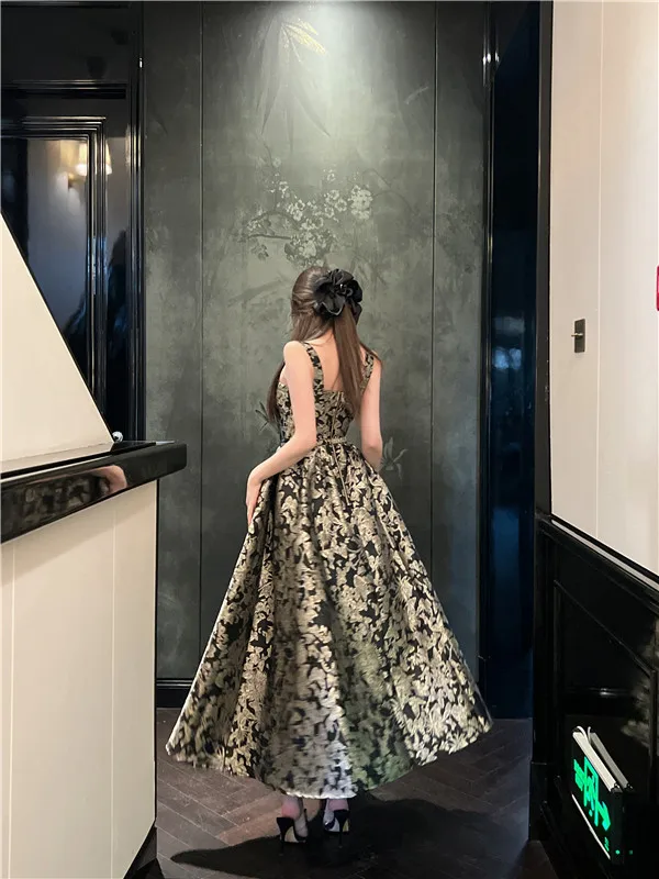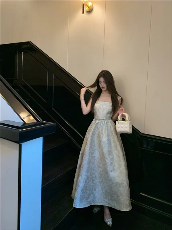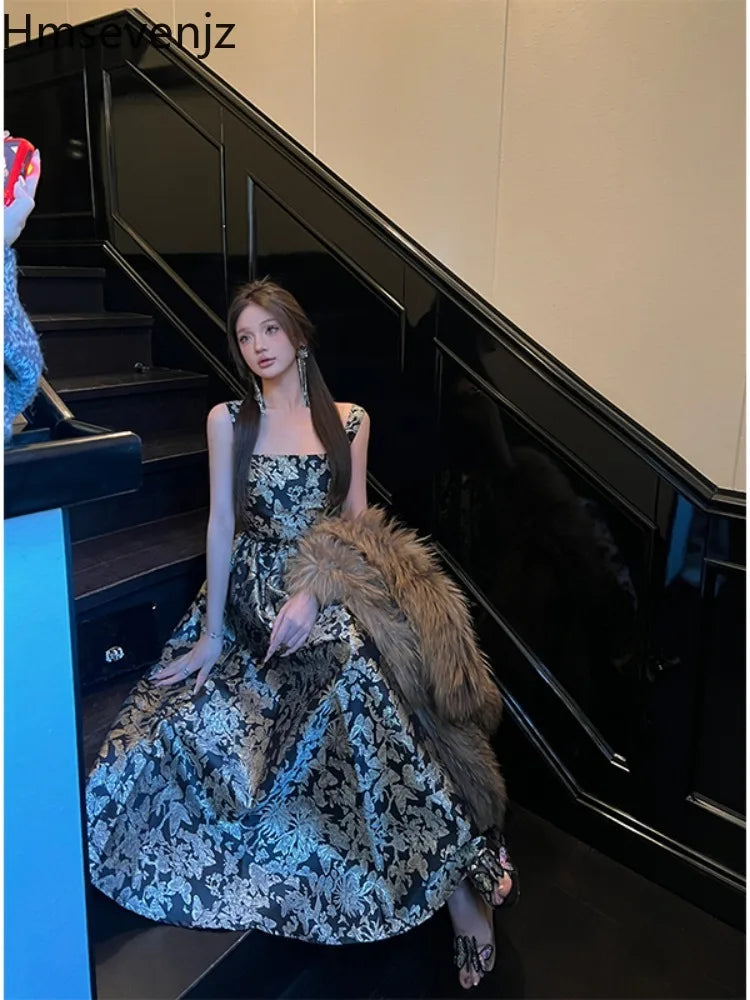 DAIIIBABYYY - French Style Butterfly Slim Sling Evening Dress for Women Autumn/Winter New Fashion Waist Slim Embroidery Jacquard Long Dress