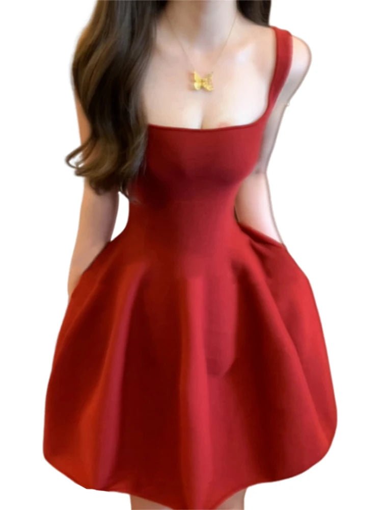 DAIIIBABYYY - French Style Hot Girl Red Halter Neck Dress Women's Spring Pure Sexy Slim-fit Square Collar A-line Dress Fashion Female Clothes