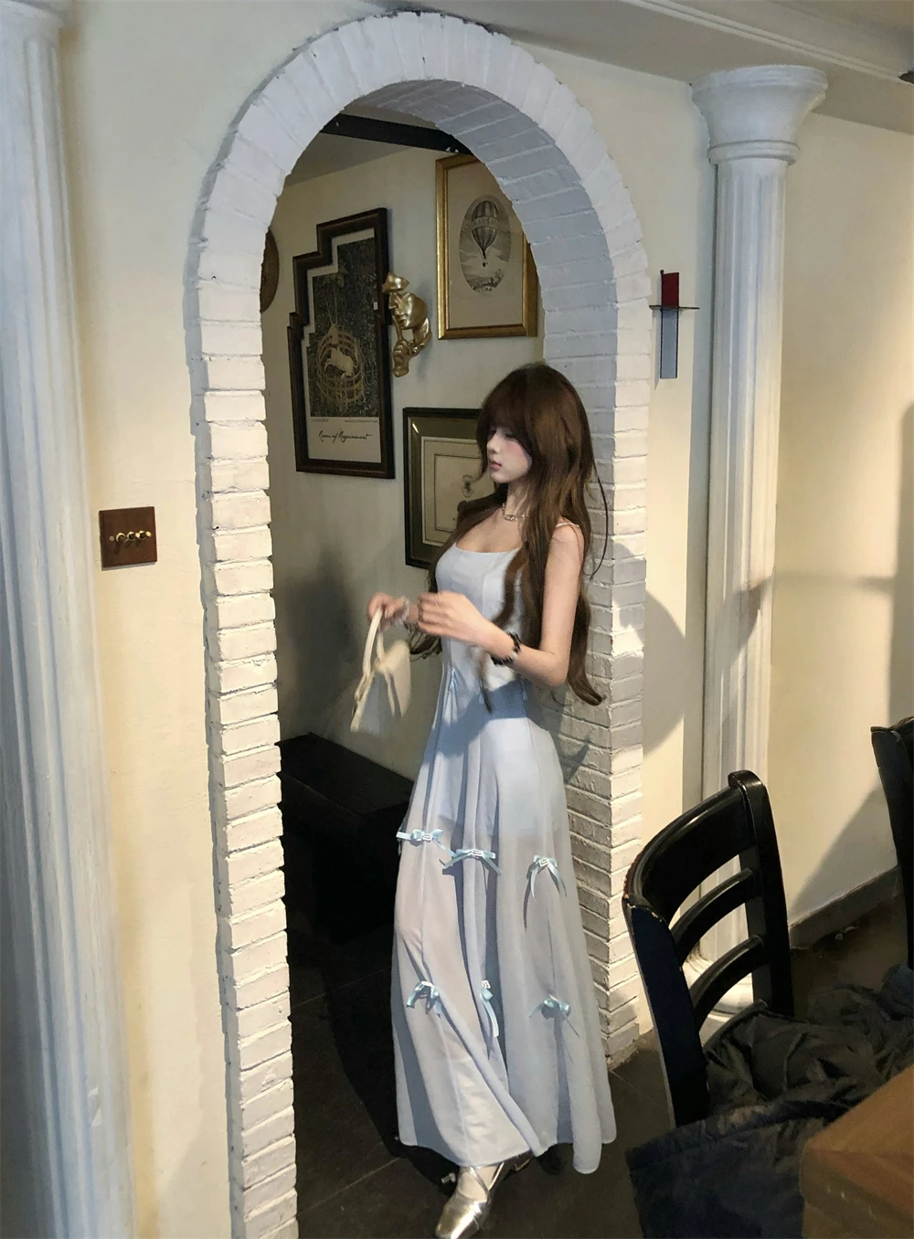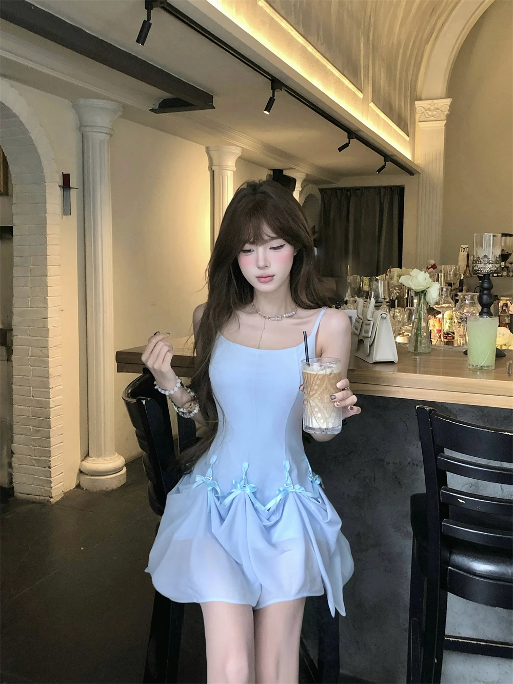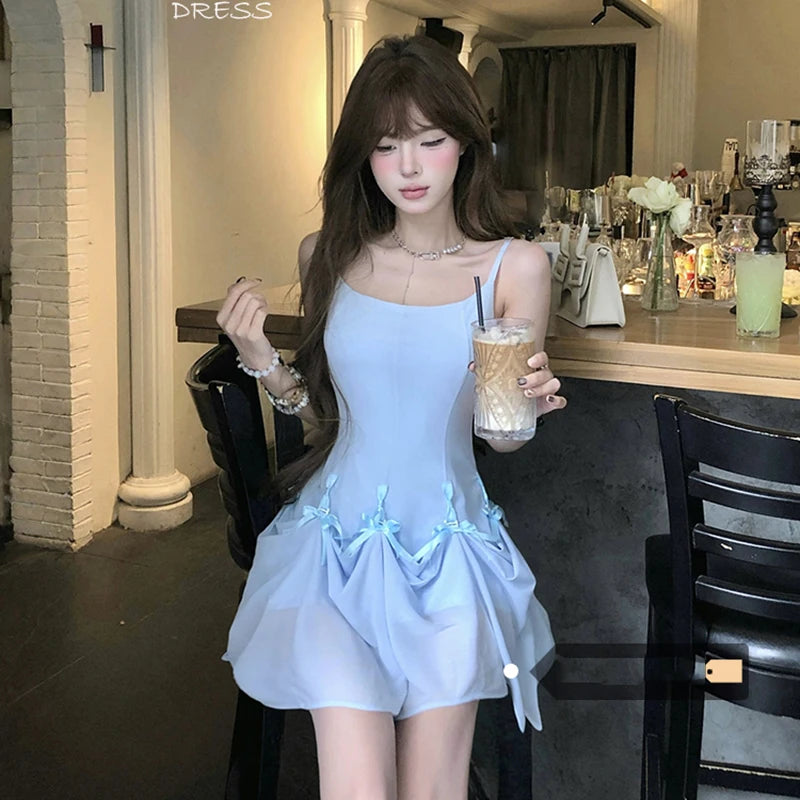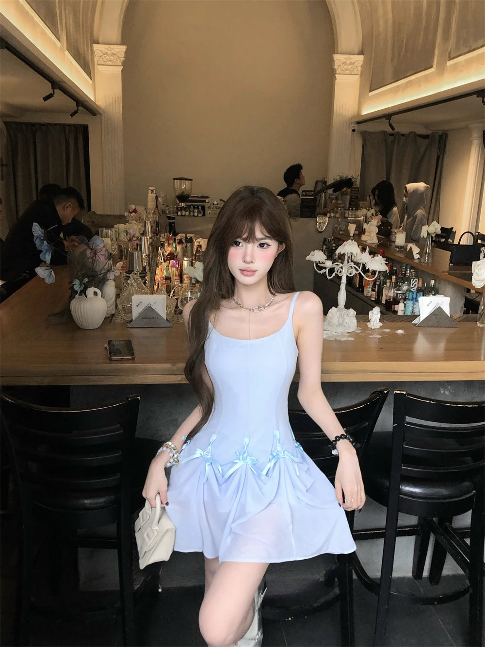 DAIIIBABYYY - French Sweet Girl Style Bow Sling Dress For Women Summer Design Sense One And More Wearing A-line Blue Short Strap Dresses
