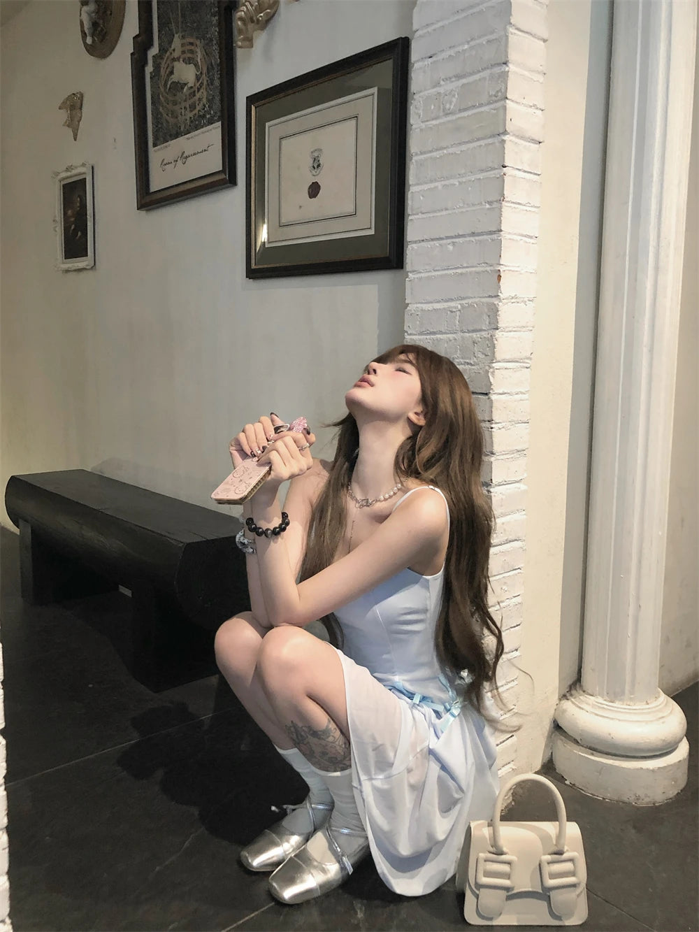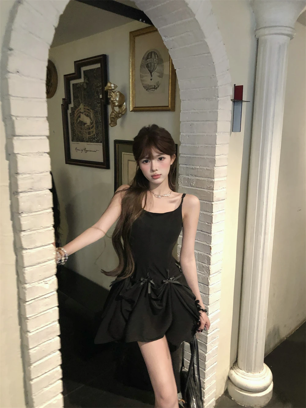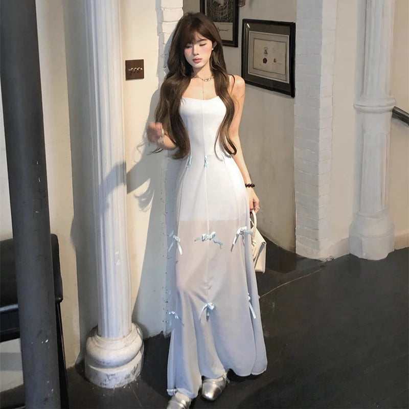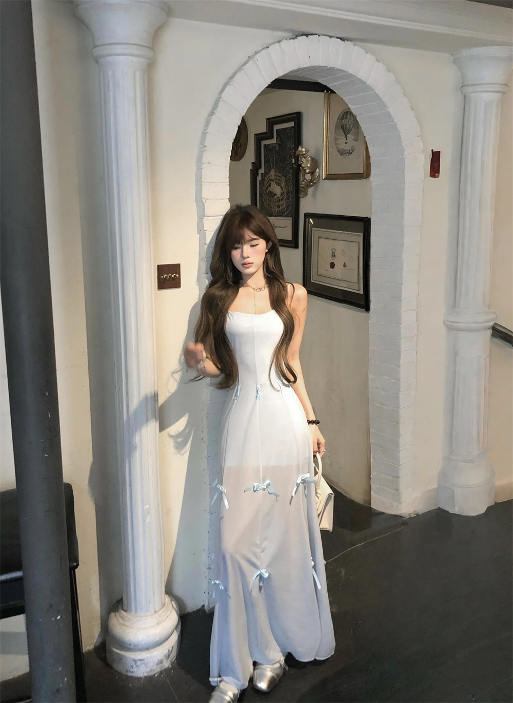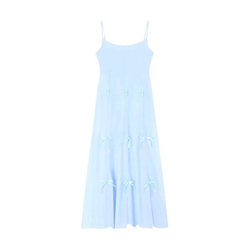 DAIIIBABYYY - French Sweet Girl Style Bow Sling Dress For Women Summer Design Sense One And More Wearing A-line Blue Short Strap Dresses