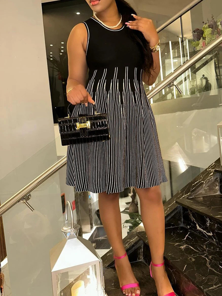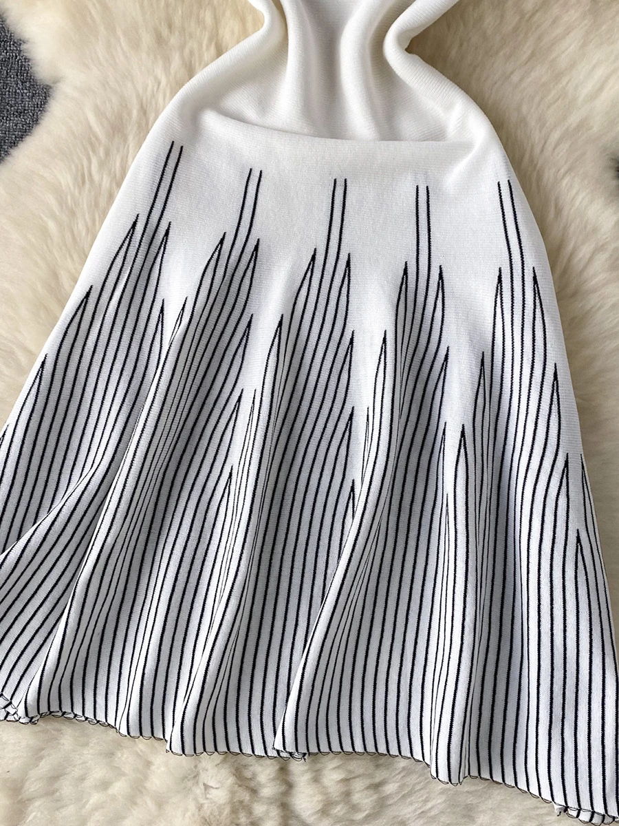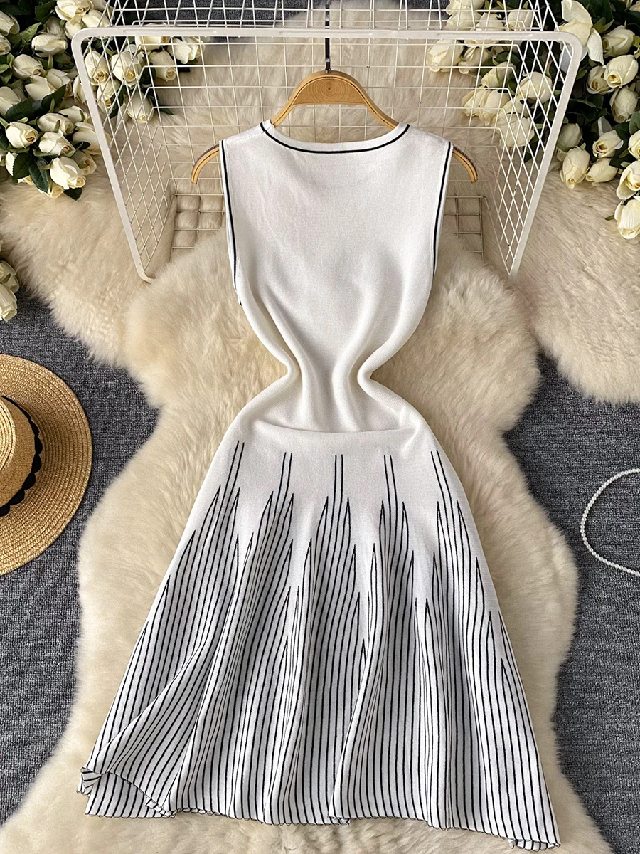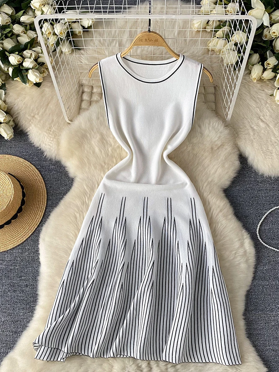 DAIIIBABYYY - Hit Color Stripe Knitting Tunic Dresses For Women Round Neck Sleeveless High Waist Temperament Dress Female Fshion Style