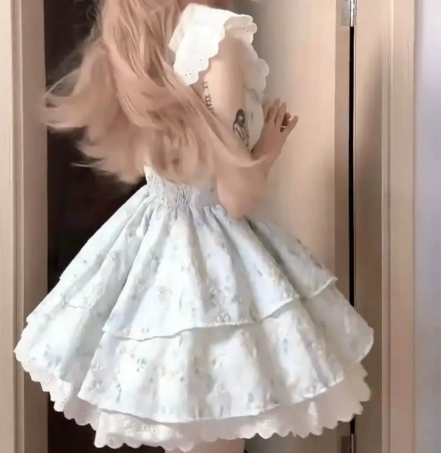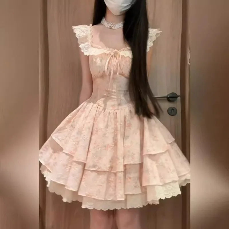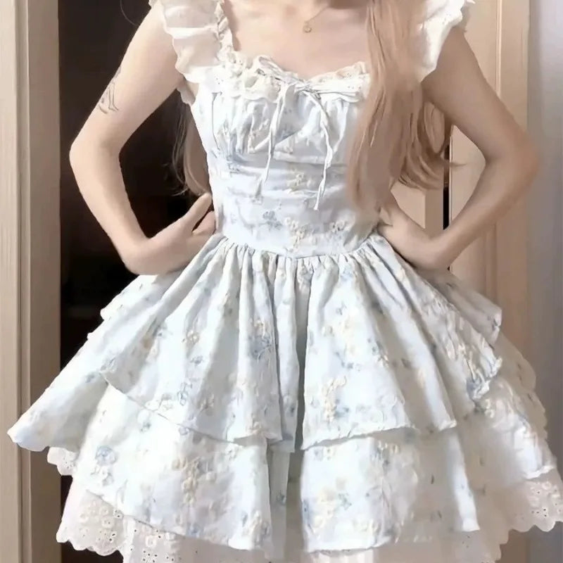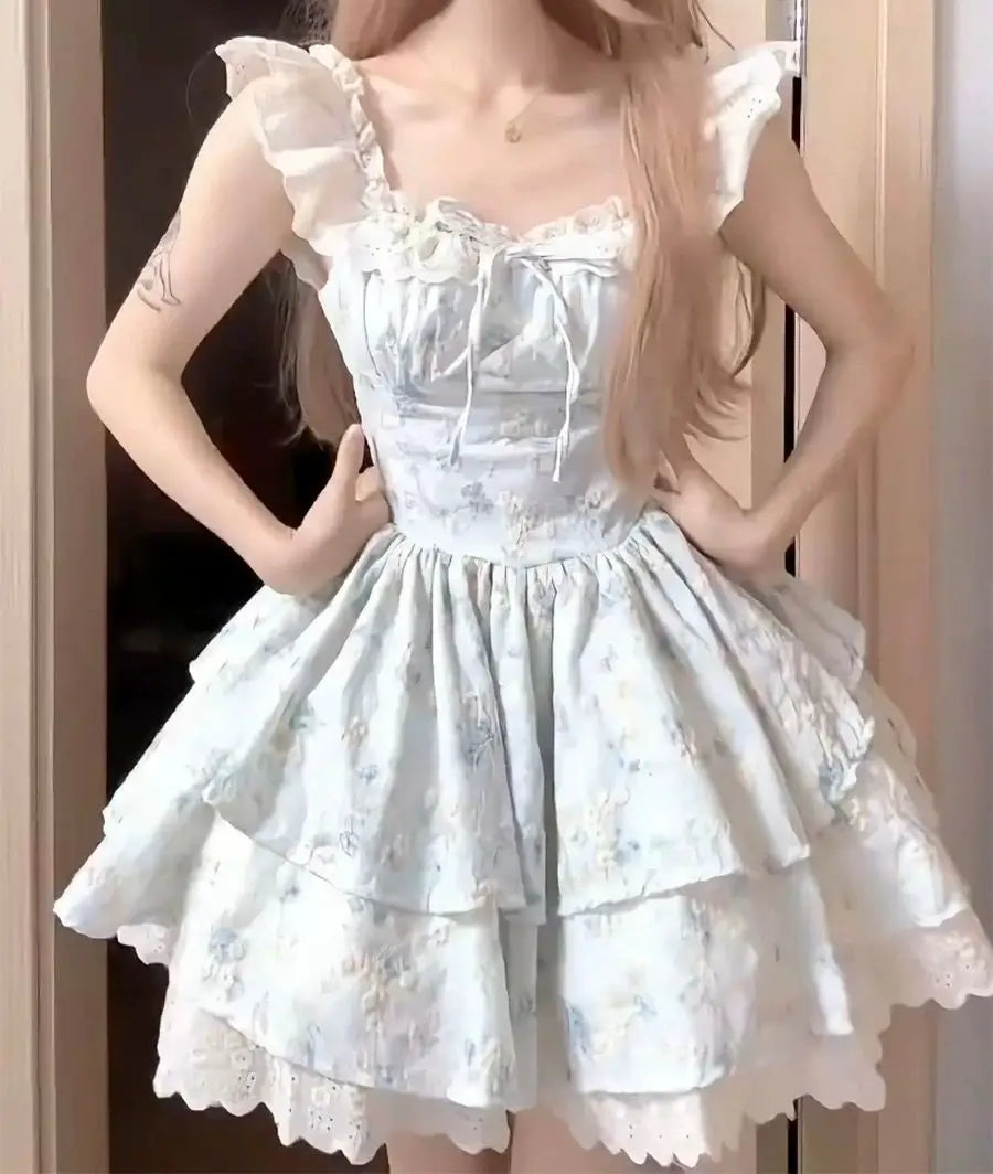 DAIIIBABYYY - Hot Girl Lace Flying Sleeve Floral Dress for Women's Summer Slim Fit Square Collar A-line Short Dress Fashion Female Clothes