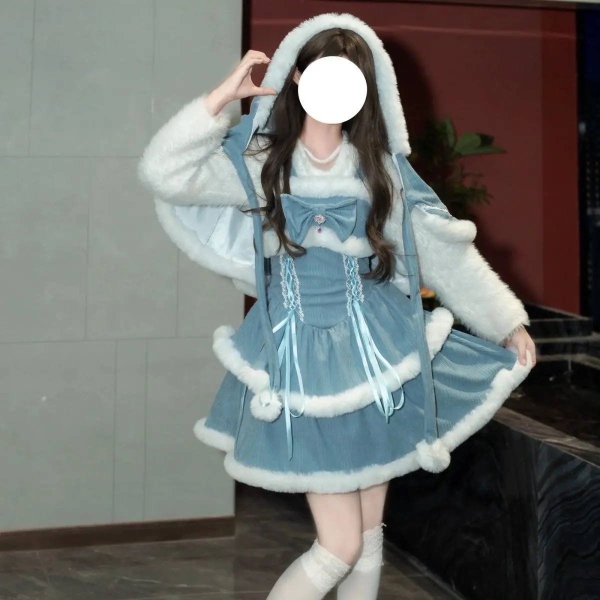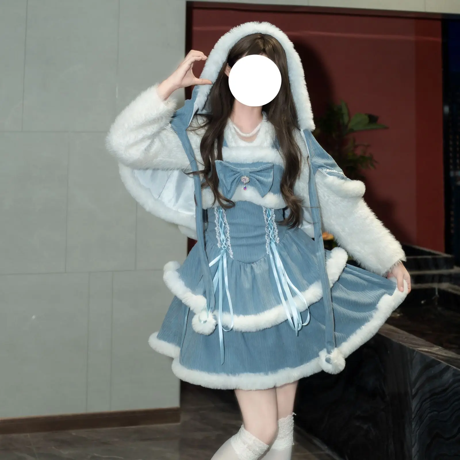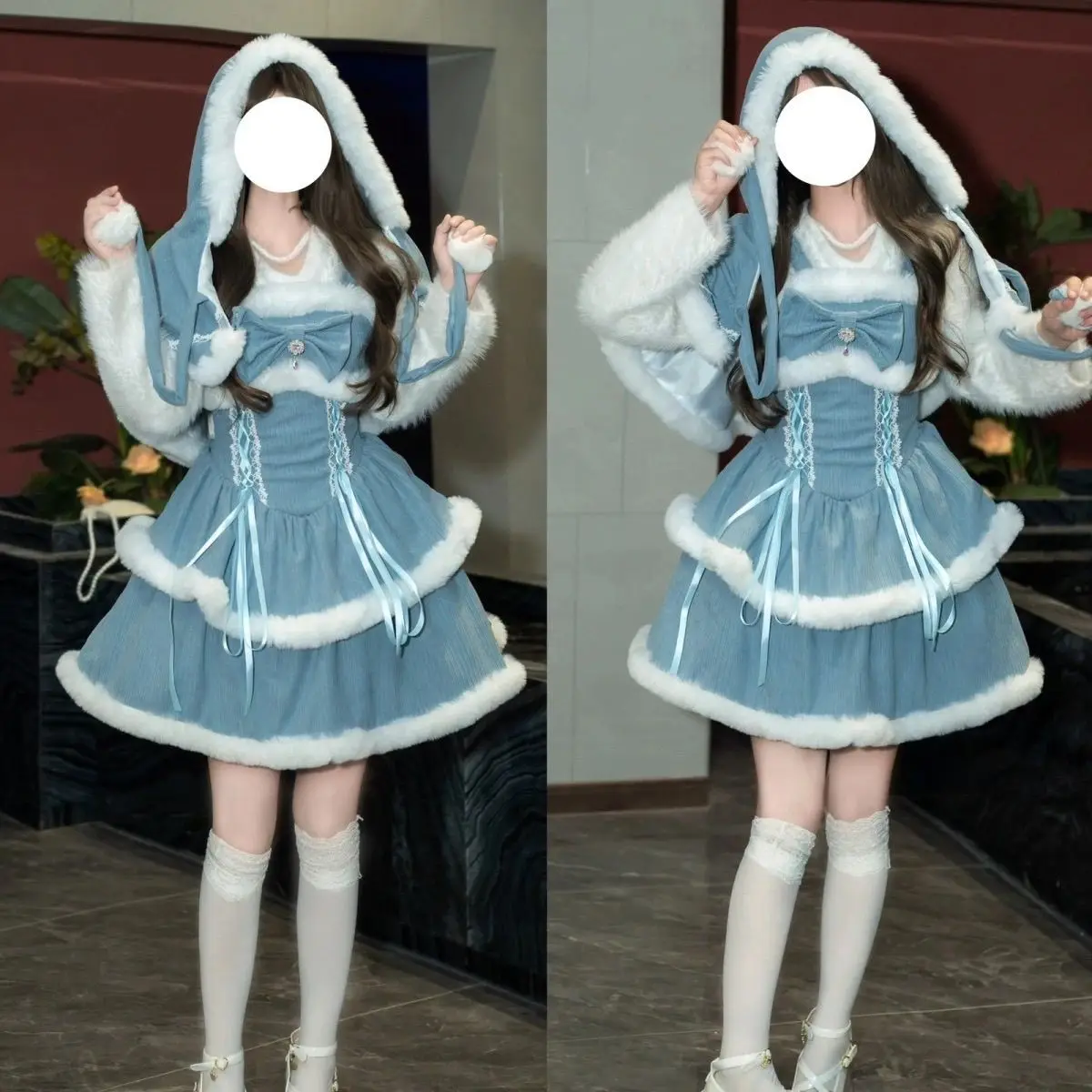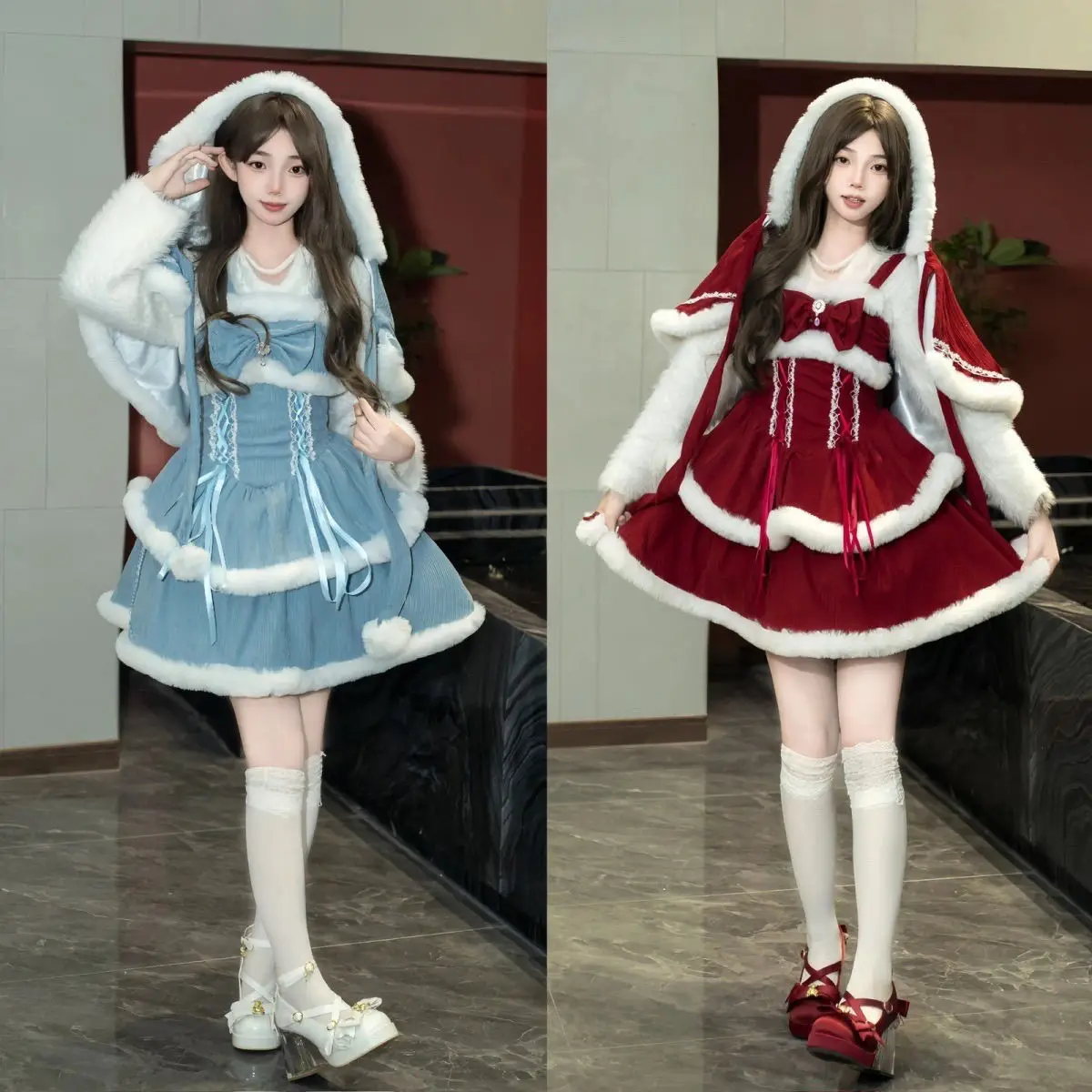 DAIIIBABYYY  -  Japan Kawaii Lolita Dress Sets Women Hooded Shawl Short Jackets Bow Mini Skirt Korean Style Sweet Red Christmas New Year Suit