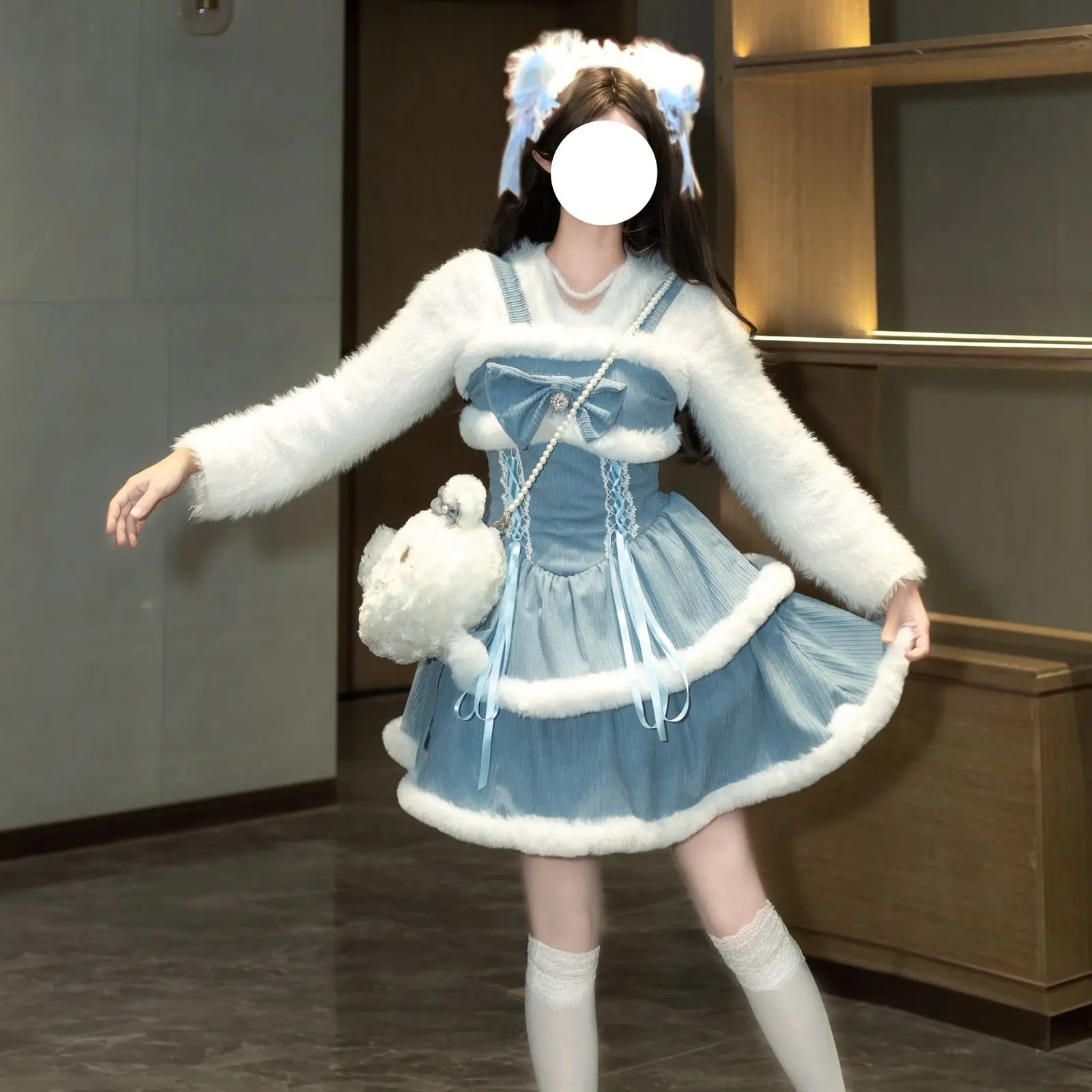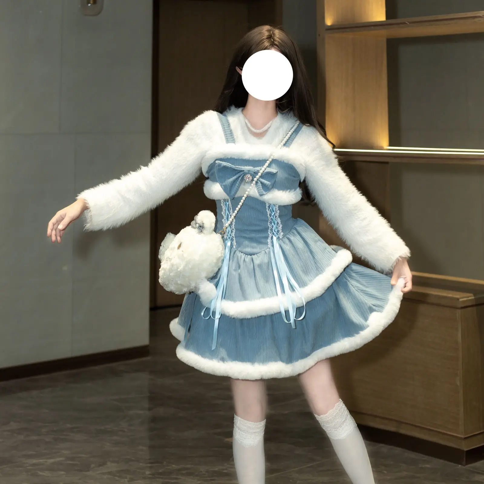 DAIIIBABYYY - Japan Kawaii Lolita Dress Sets Women Hooded Shawl Short Jackets Bow Mini Skirt Korean Style Sweet Red Christmas New Year Suit