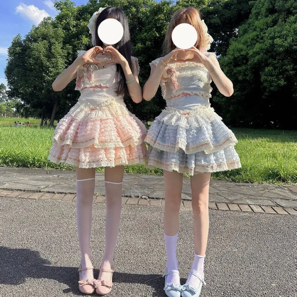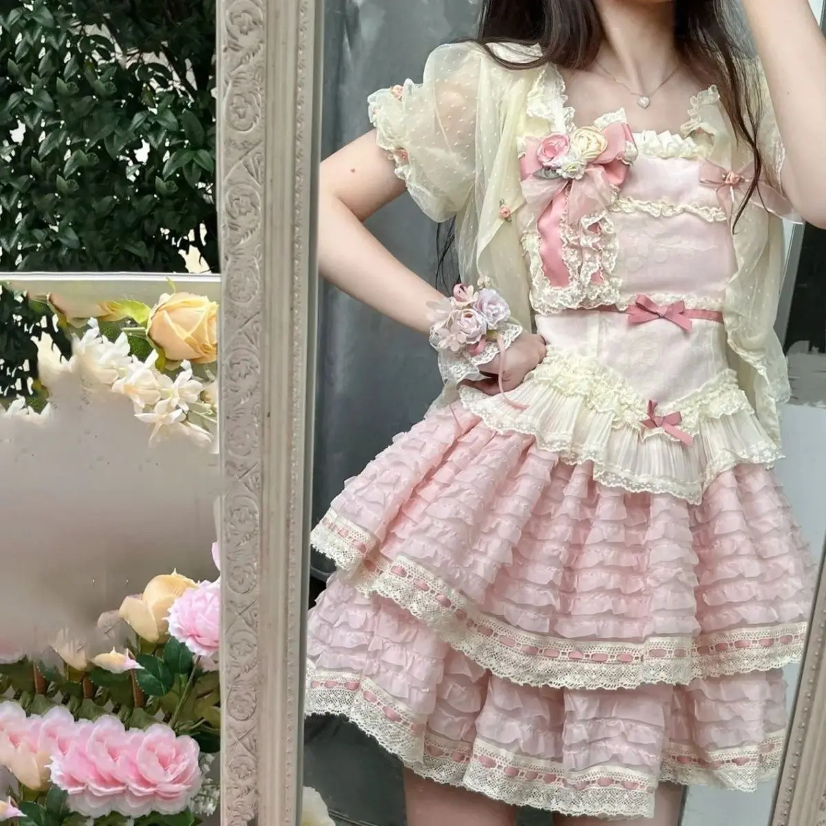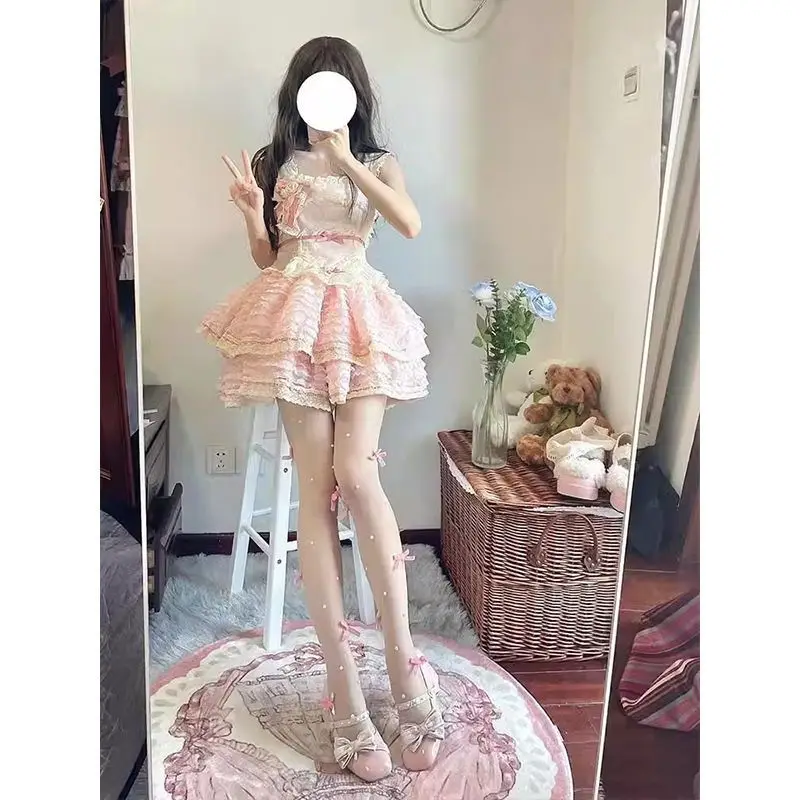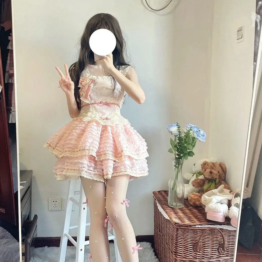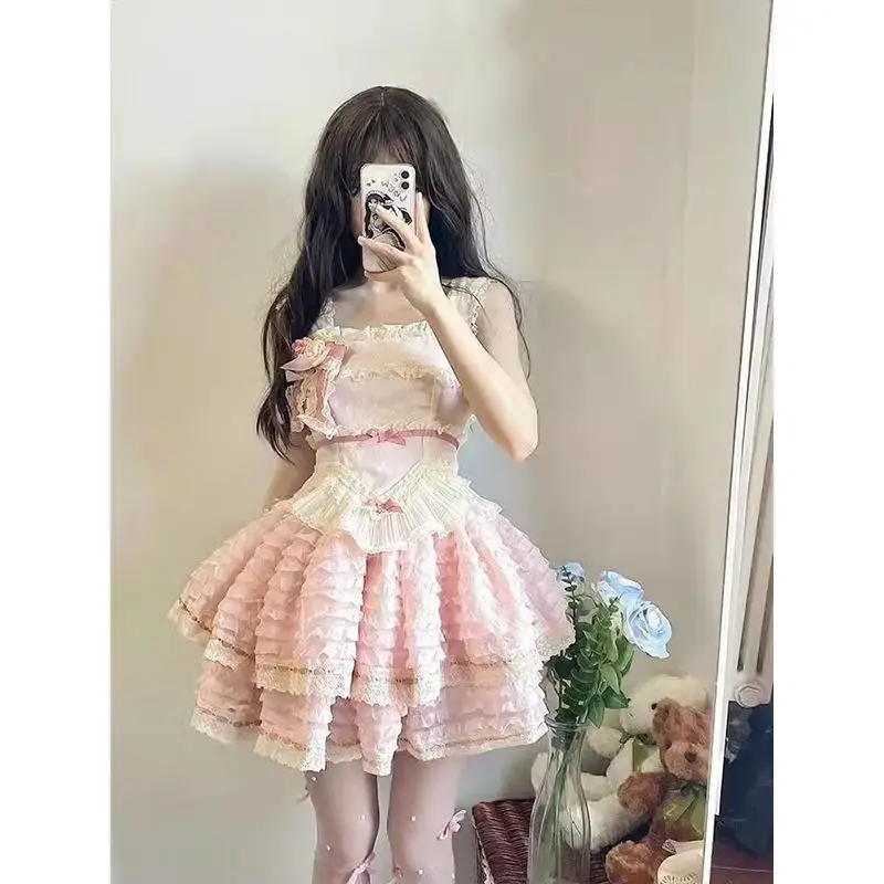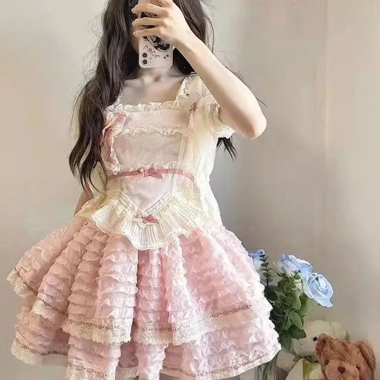 Daiiibabyyy Japan Lolita Cake Princess Dress Pink Sweet Girl Small French Heavy Work Puffy Dress Cosplay Costumes Women Mini strap Dress