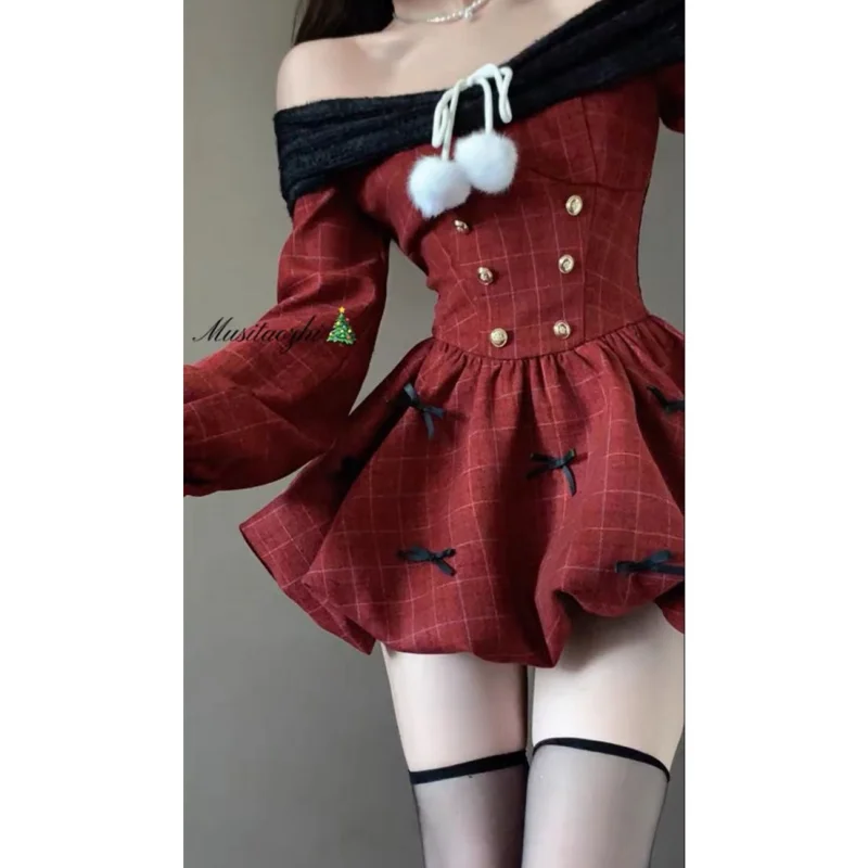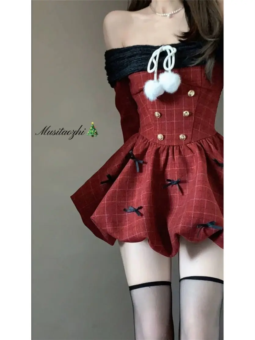 DAIIIBABYYY  -  Japan Year Sweet Christmas Dress Women Off Shoulder Sexy Bow Kawaii Dresses Famale Korean Fashion Plaid Casual Clothes Winter