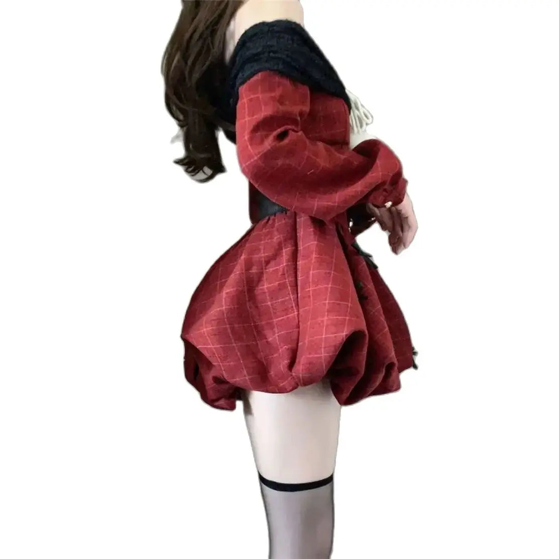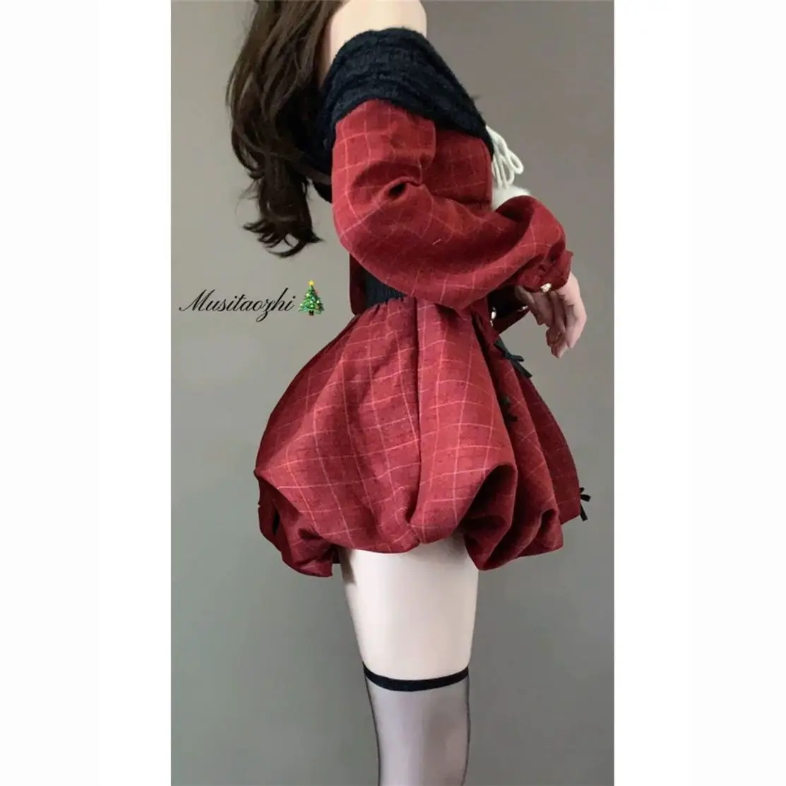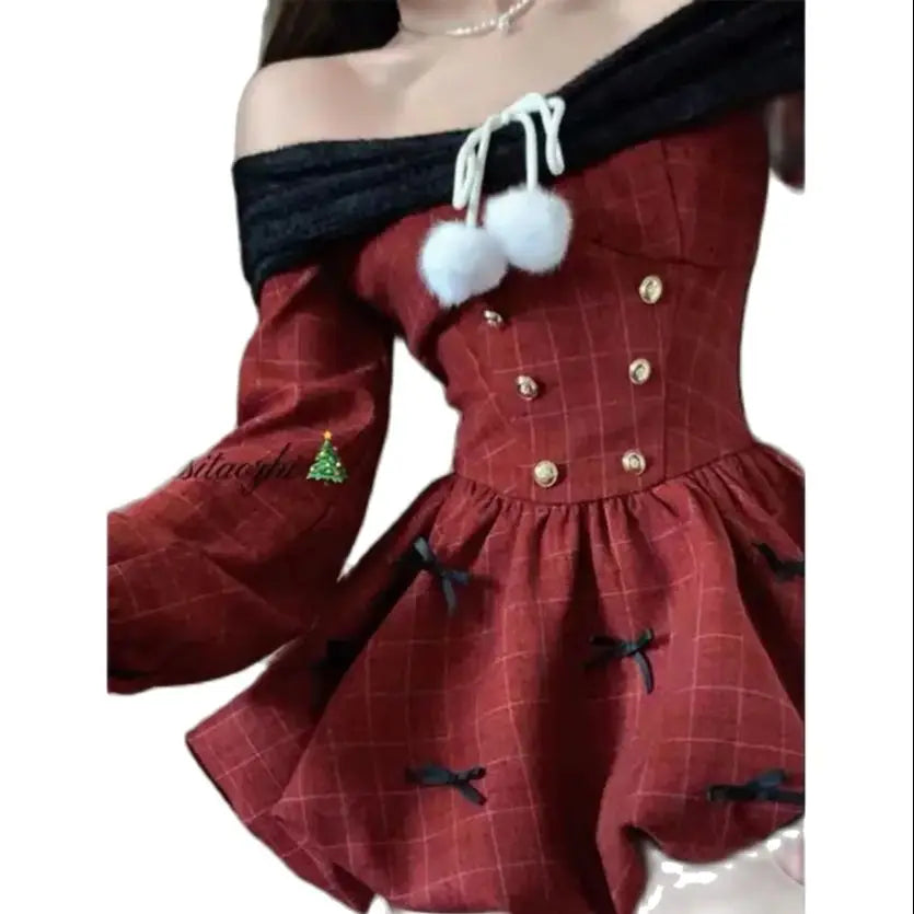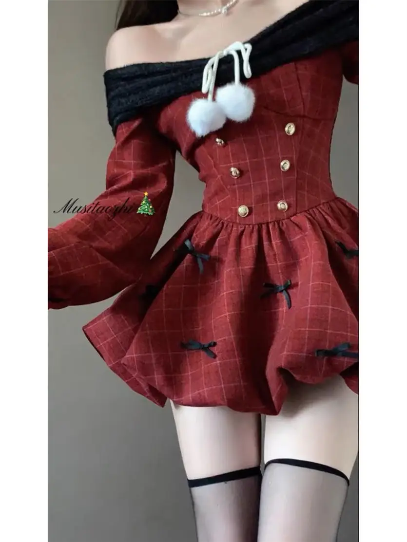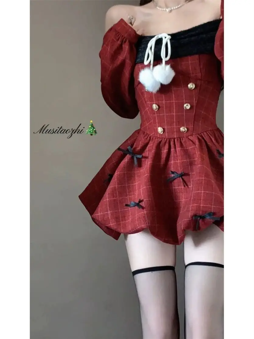 DAIIIBABYYY - Japan Year Sweet Christmas Dress Women Off Shoulder Sexy Bow Kawaii Dresses Famale Korean Fashion Plaid Casual Clothes Winter
