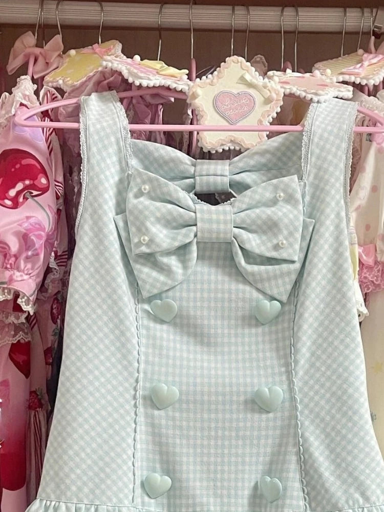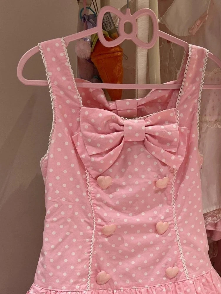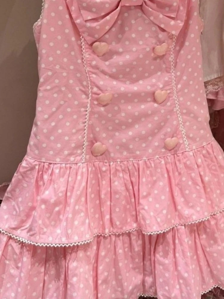 DAIIIBABYYY - Japanese Sweet Cute Wave Point Bow Dresses Y2k Aesthetic Women Ruffled Pleated Grunge Dress Harajuku Mini Love Button Vestidos