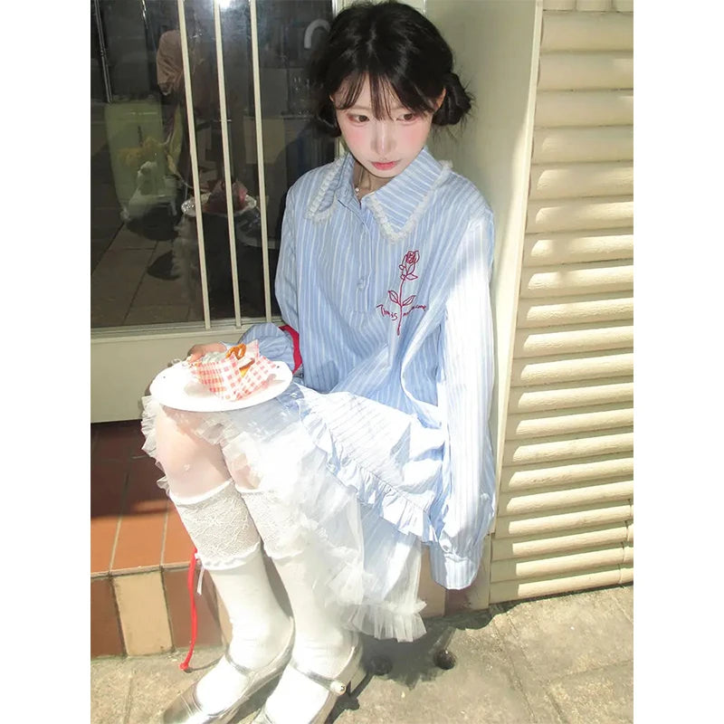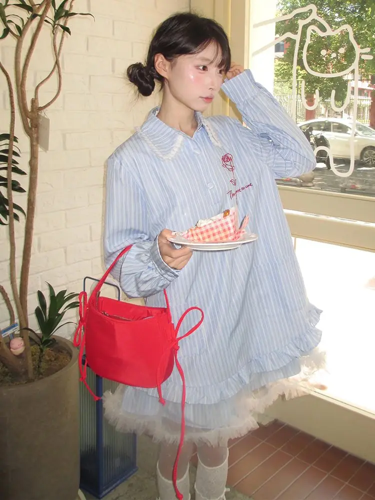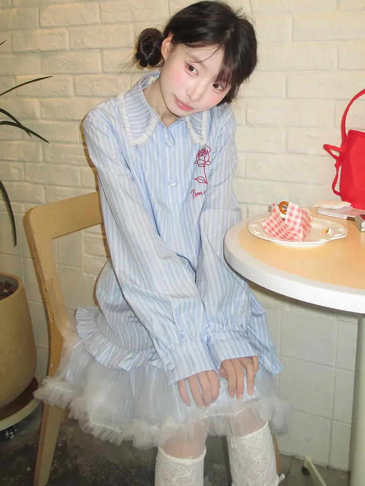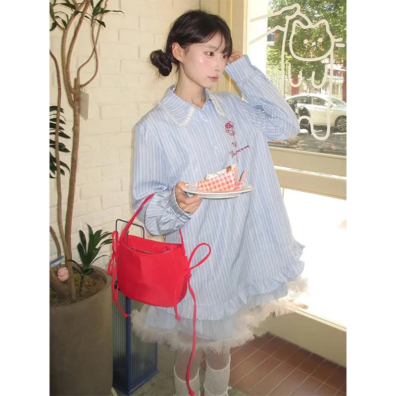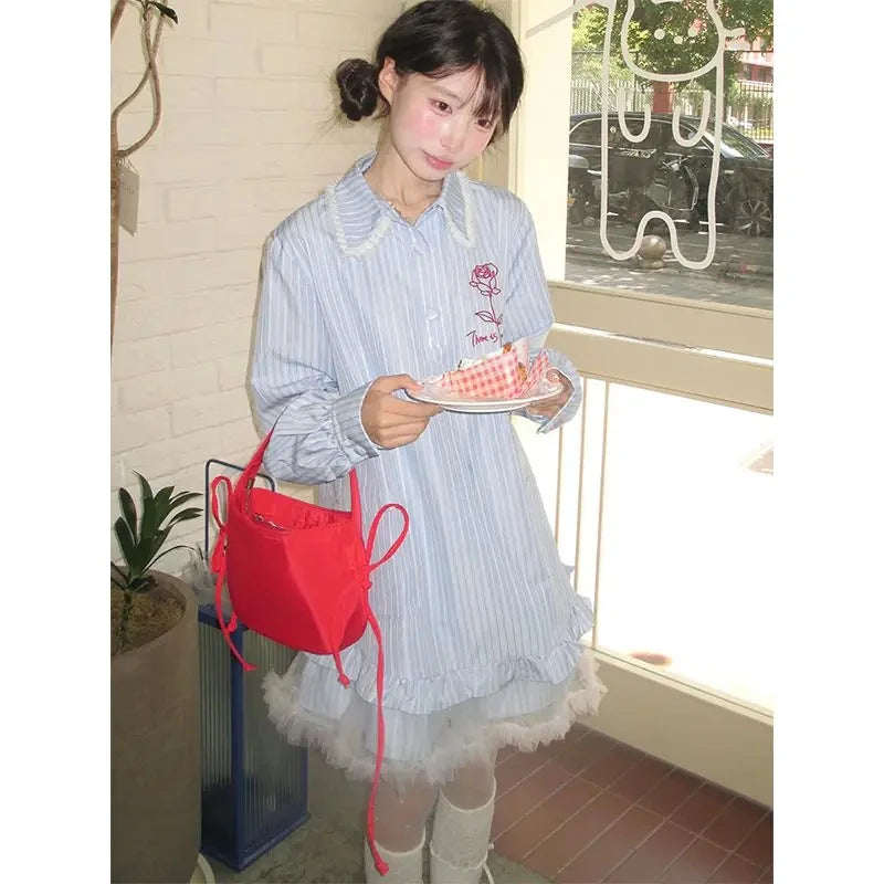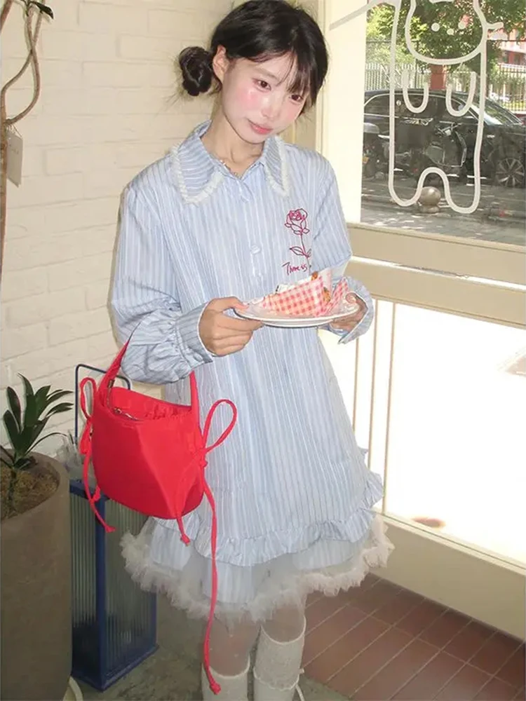 DAIIIBABYYY - Kawaii Cute Striped Mini Dress Women Japanese Ruffles Mesh Patchwork Dresses Korean Fashion Long Sleeve Design Vestidos