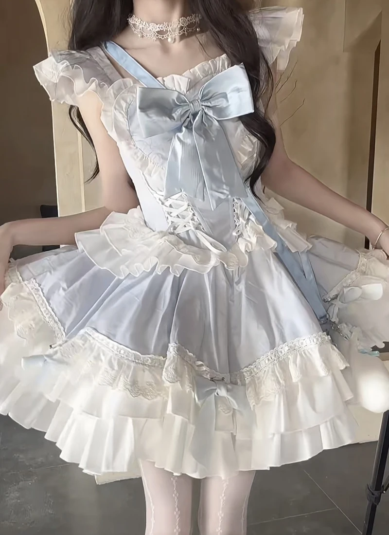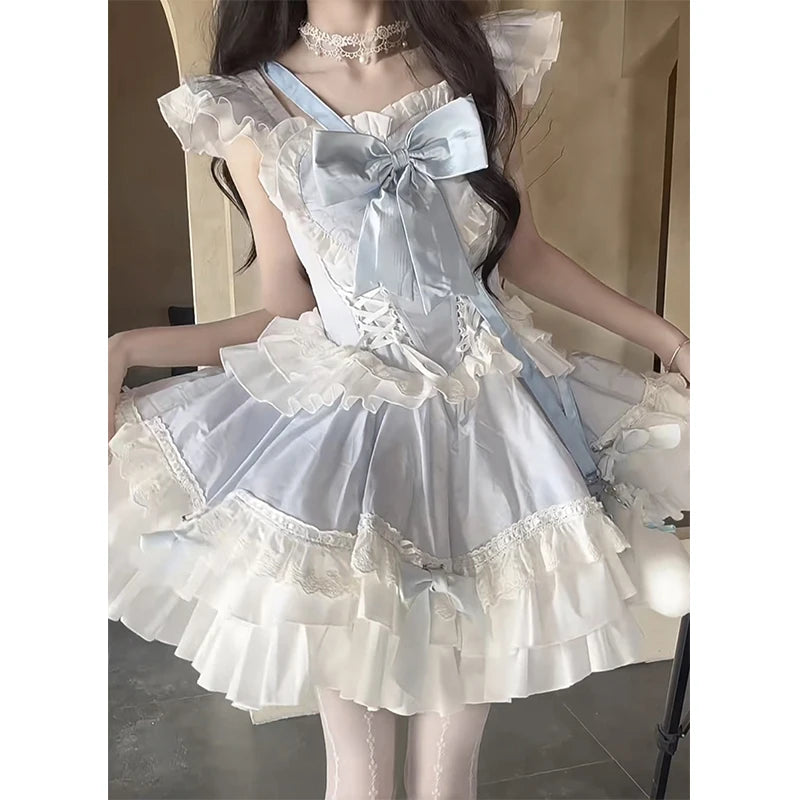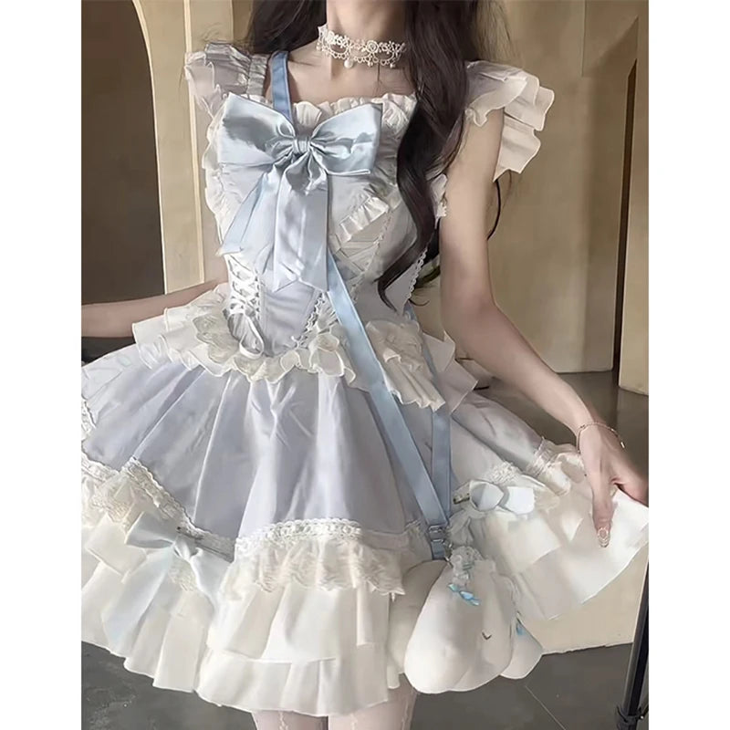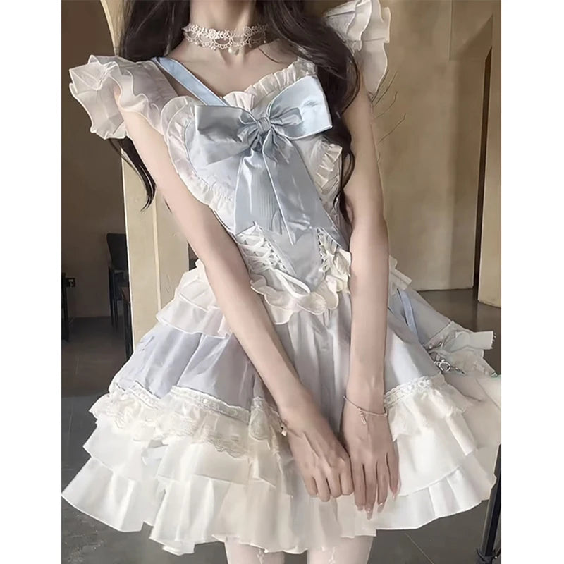 DAIIIBABYYY - Kawaii Lolita Bow Mini Dress Women Japanese Lace Ruffles Patchwork Dresses Summer Cute Flying Sleeve Bodycon Vestidos New