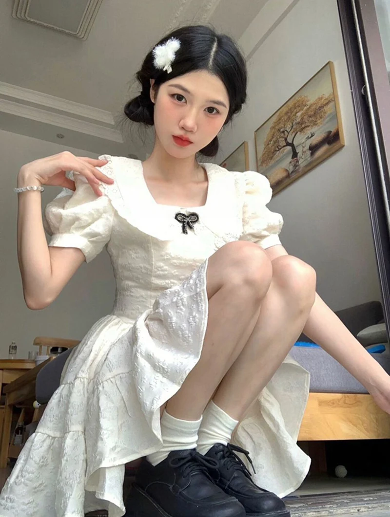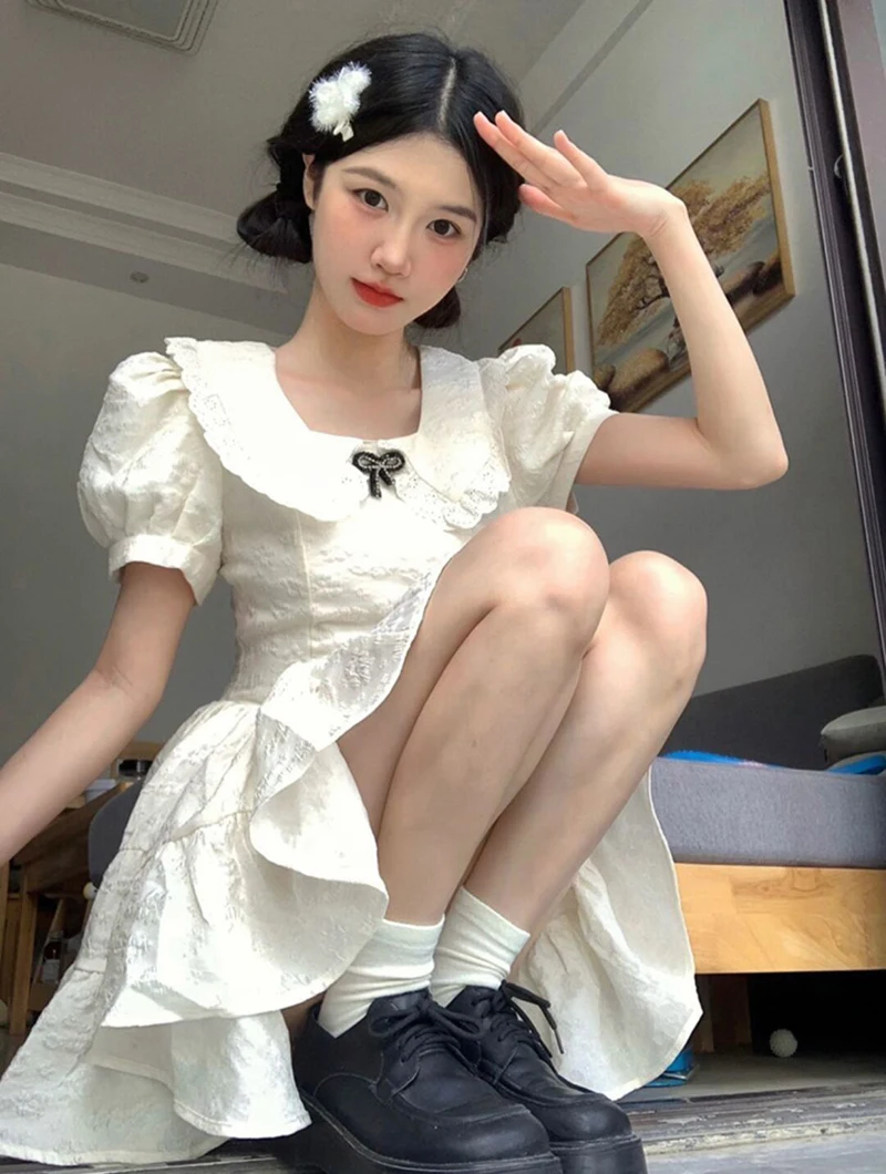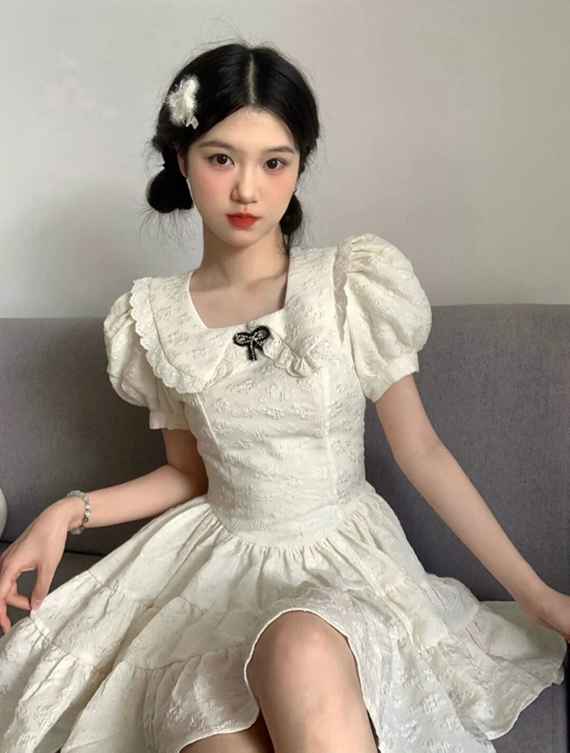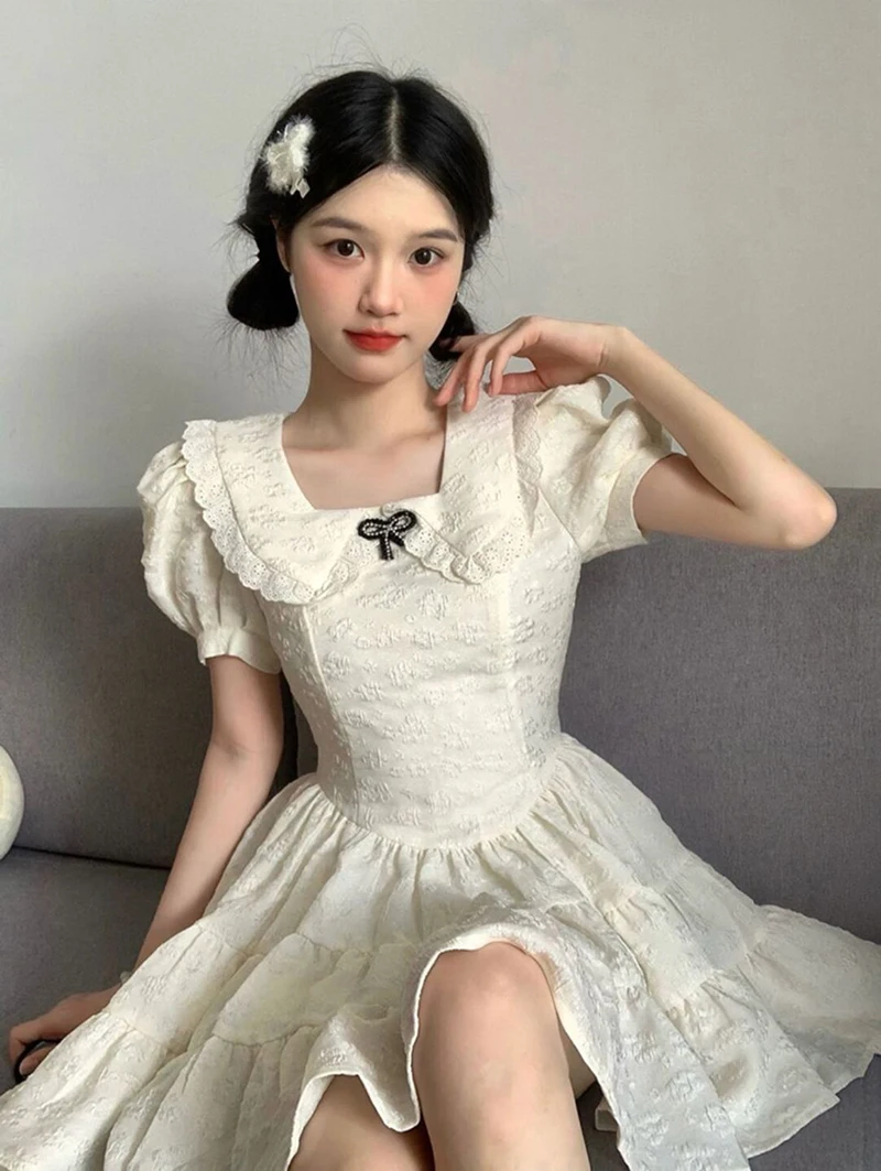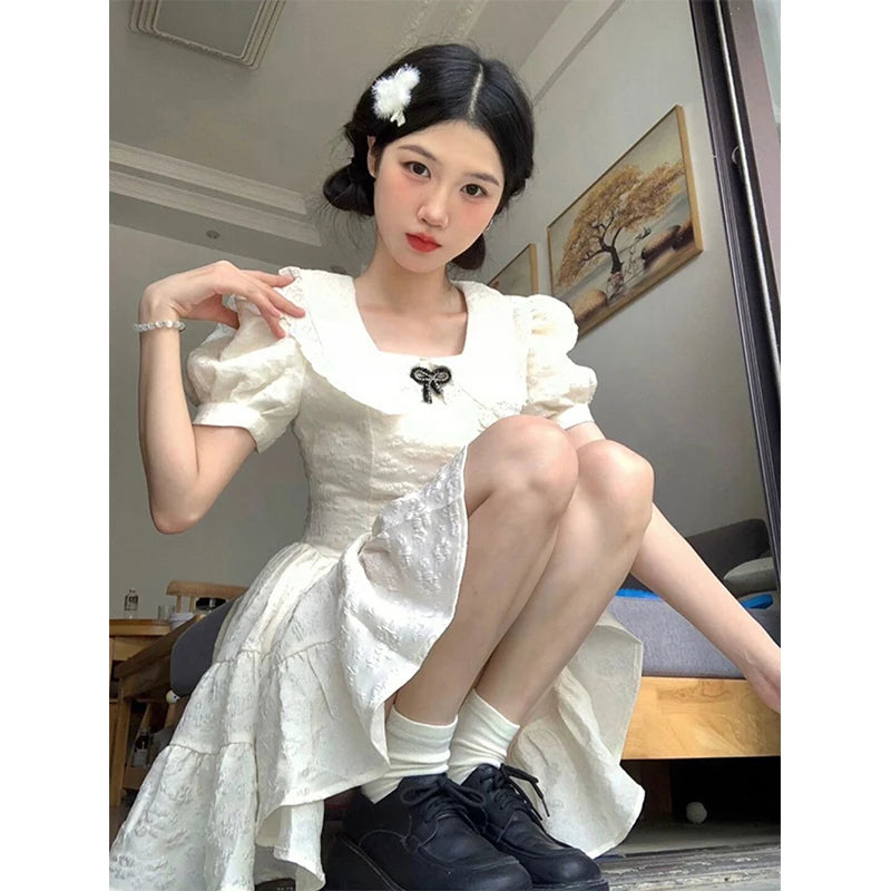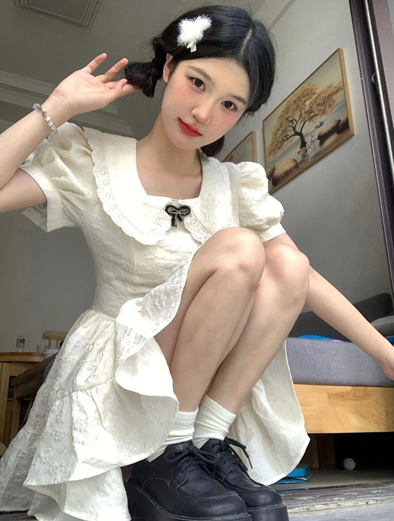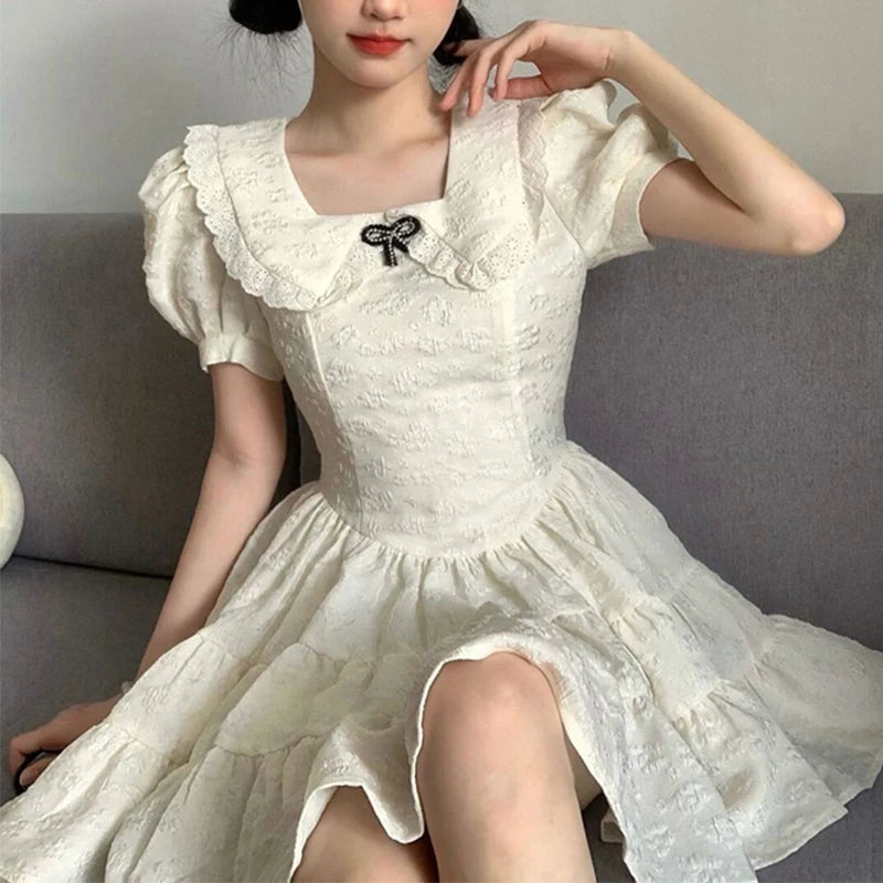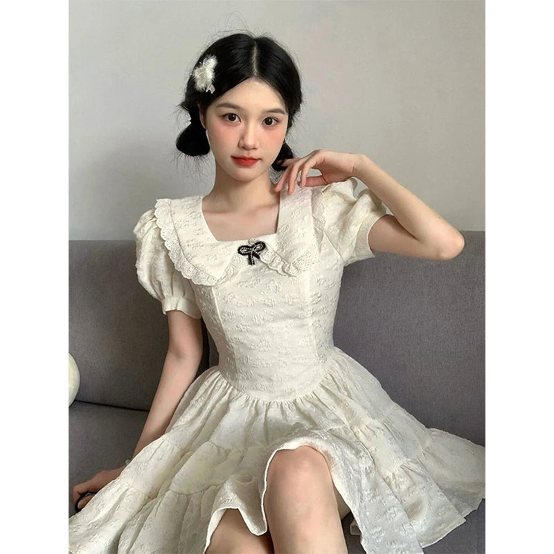DAIIIBABYYY - Kawaii Mini Dress Women Japanese Lolita Bow Lace Patchwork Dresses Summer Party Puff Short Sleeve Bodycon A Line Vestidos