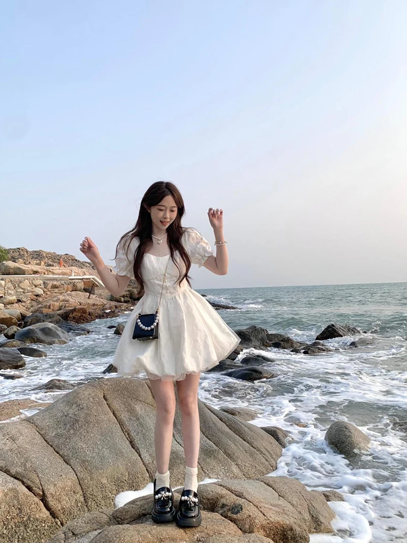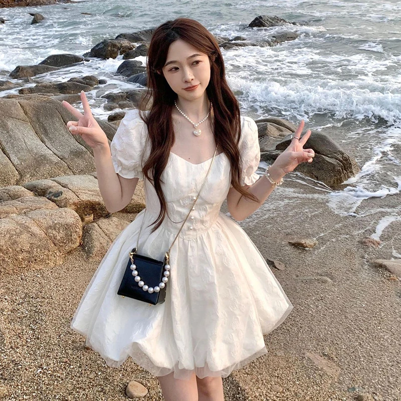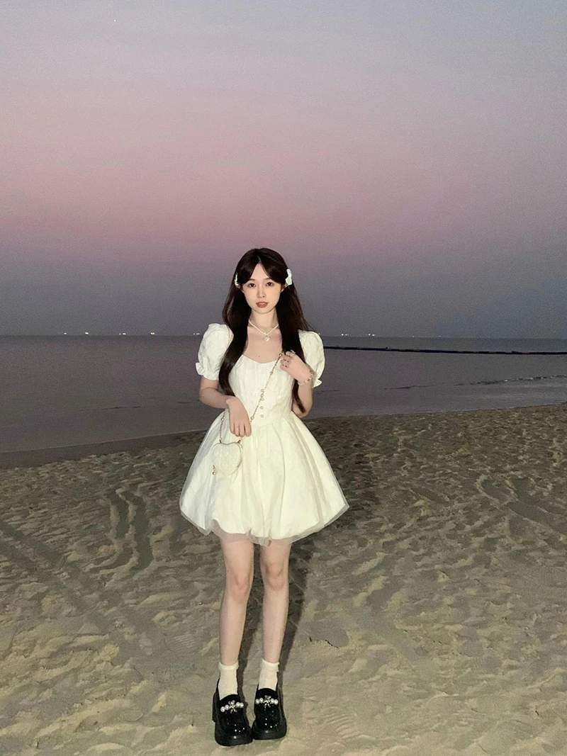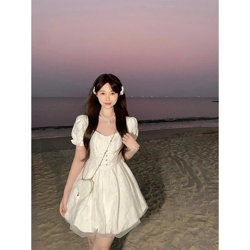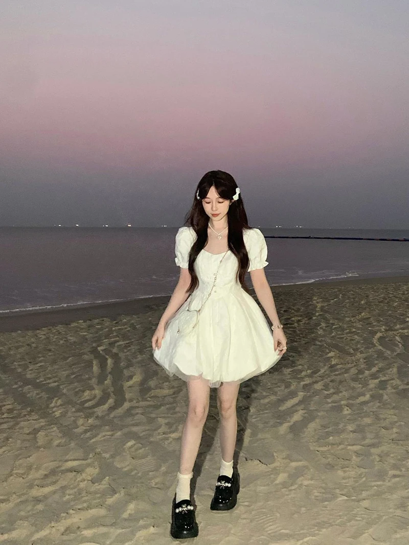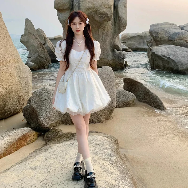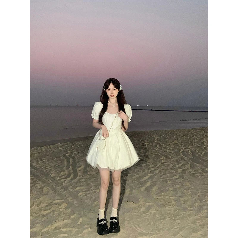 DAIIIBABYYY - Kawaii White Mini Dress Women Fairy Party Puff Short Sleeve Ball Gown Dresses Summer Korean Cute Bodycon A Line Vestidos
