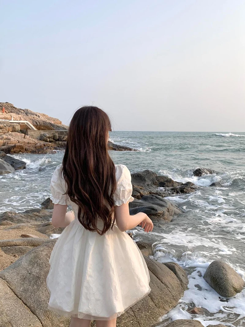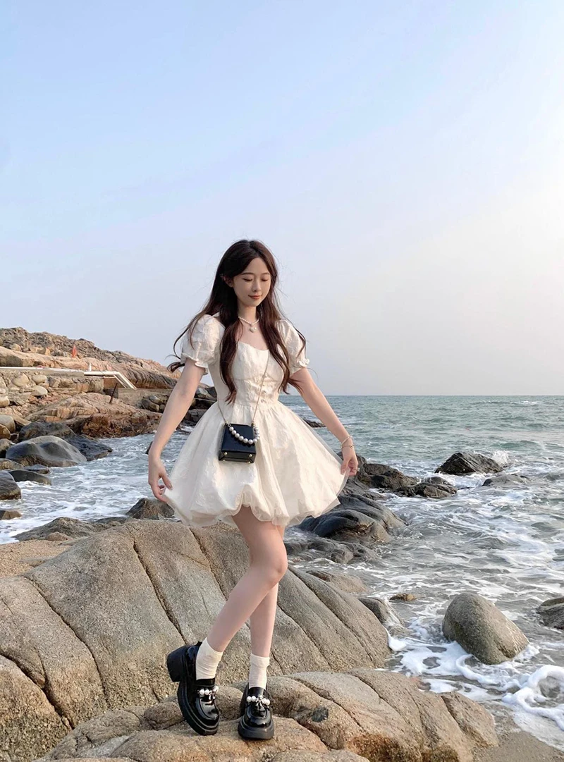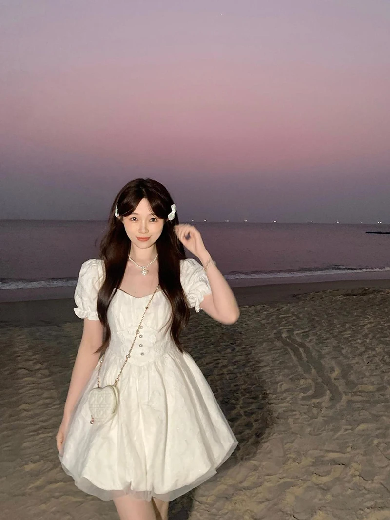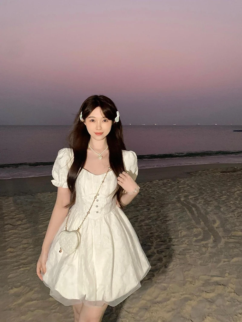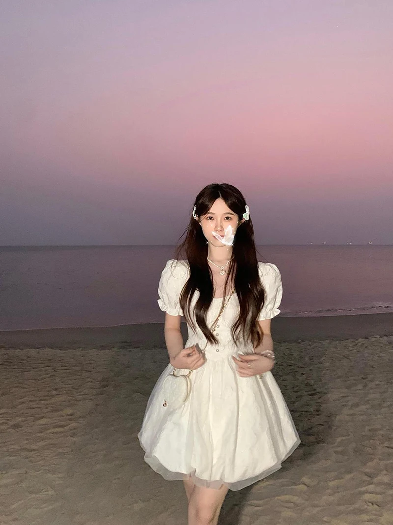 DAIIIBABYYY - Kawaii White Mini Dress Women Fairy Party Puff Short Sleeve Ball Gown Dresses Summer Korean Cute Bodycon A Line Vestidos