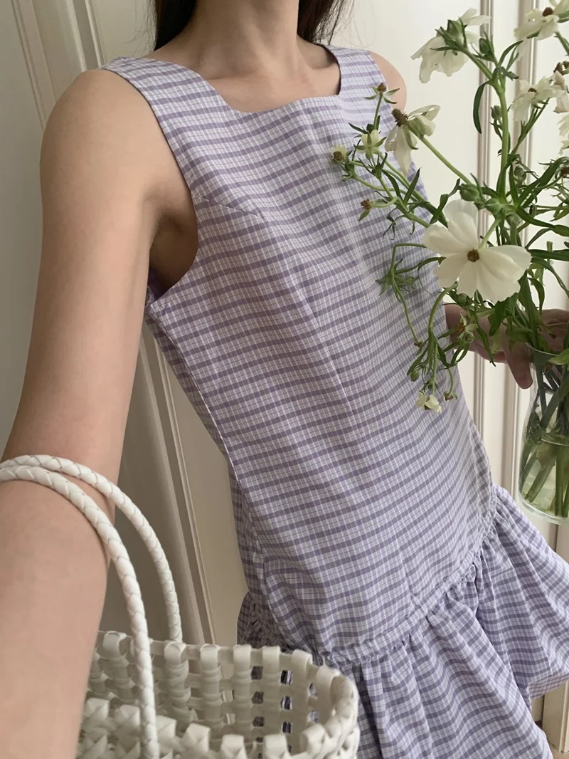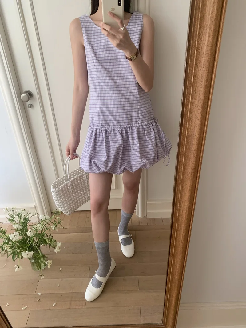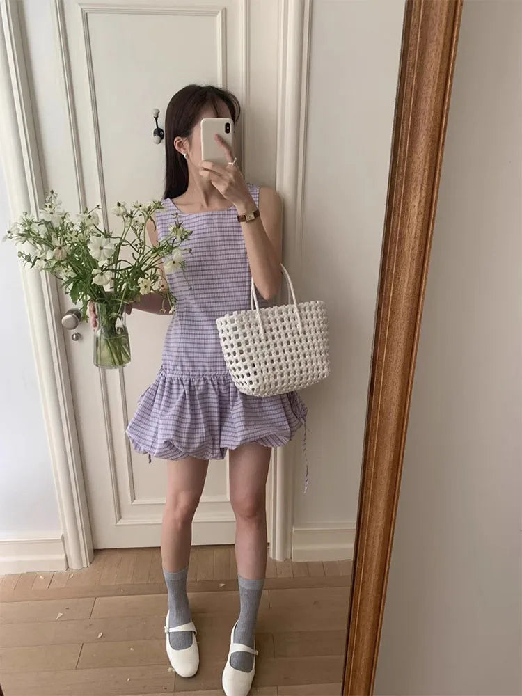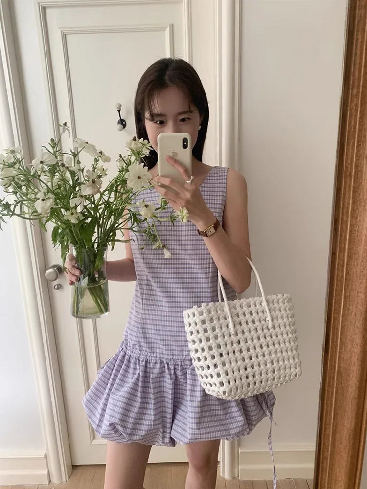 DAIIIBABYYY - Korean 2025 Retro Plaid Vest Dress Women Summer New Design Sense Drawstring Tied Flower Bud Short A-line Vestidos