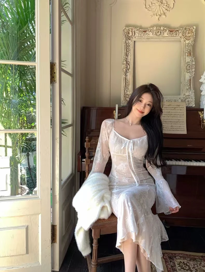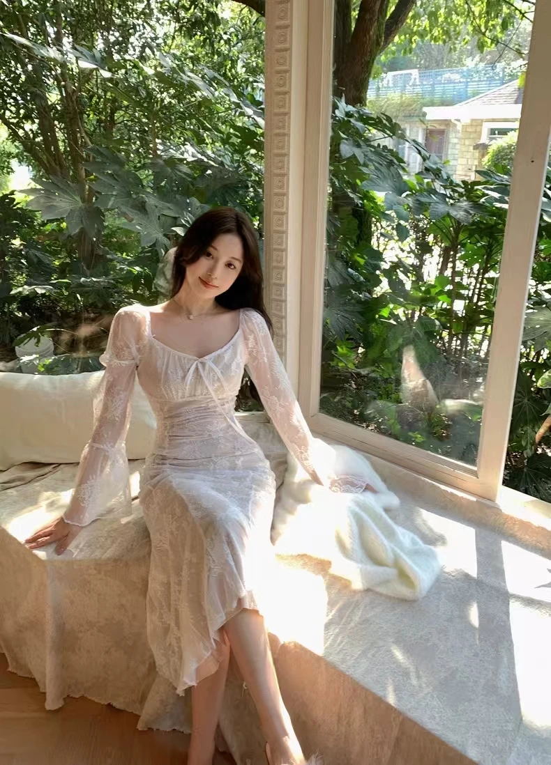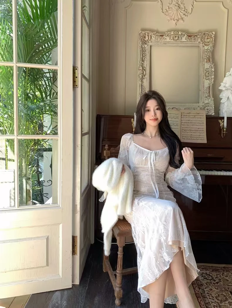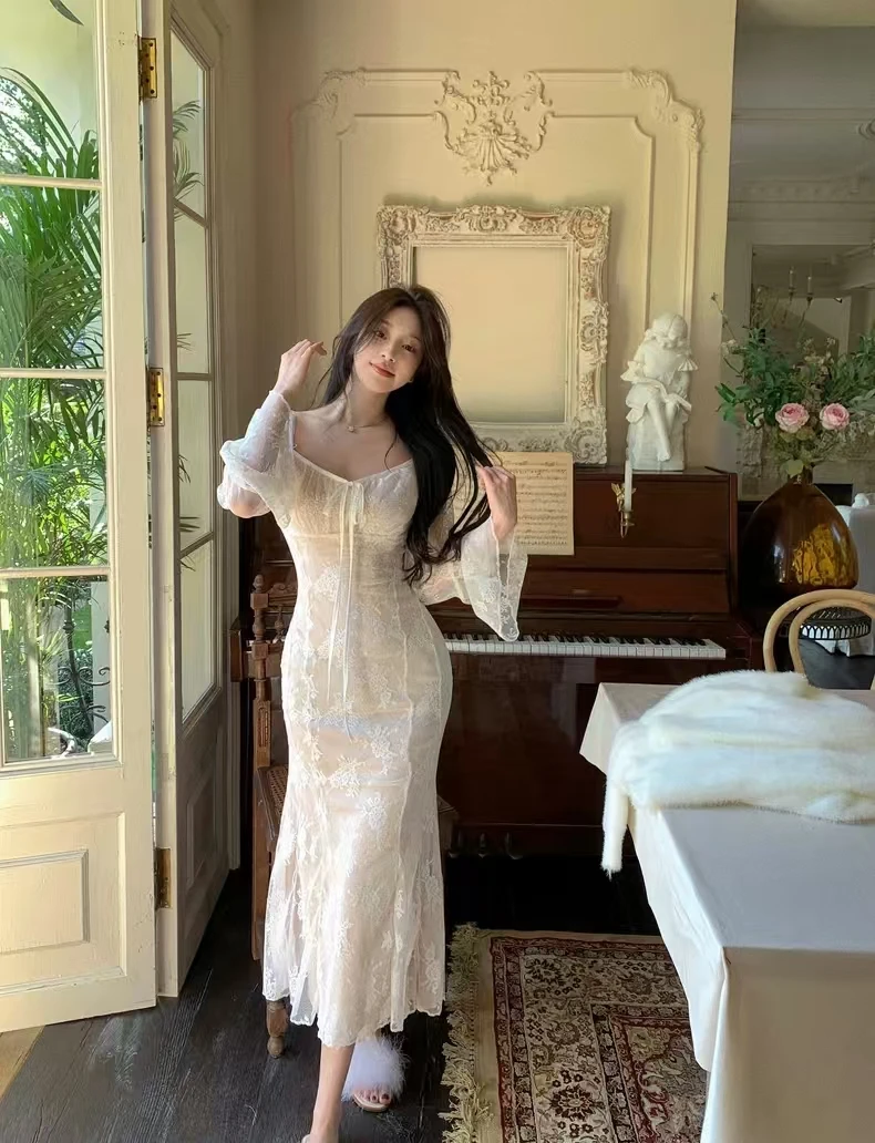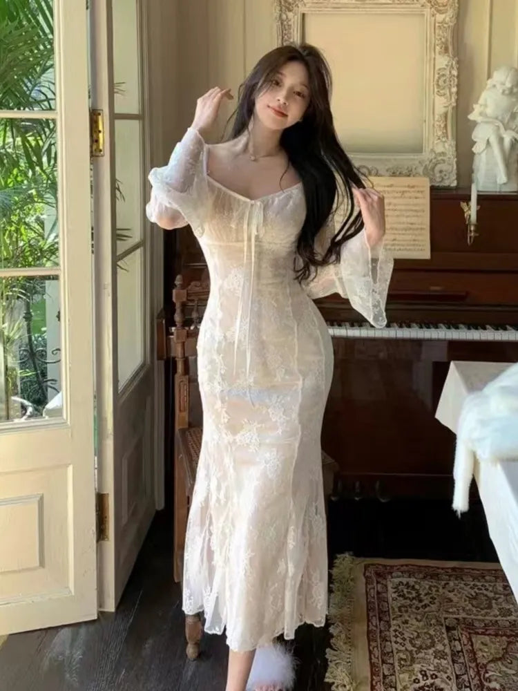 DAIIIBABYYY - Korean Elegant Mermaid Dress for Women Autumn Long Flare Sleeve Square Collar Lace-up Slim Lace Vestidos Fashion Chic Long Robe