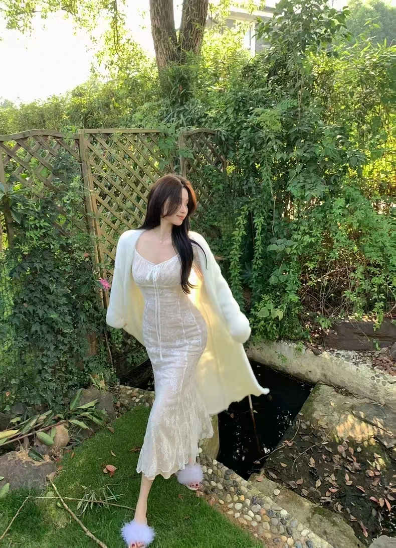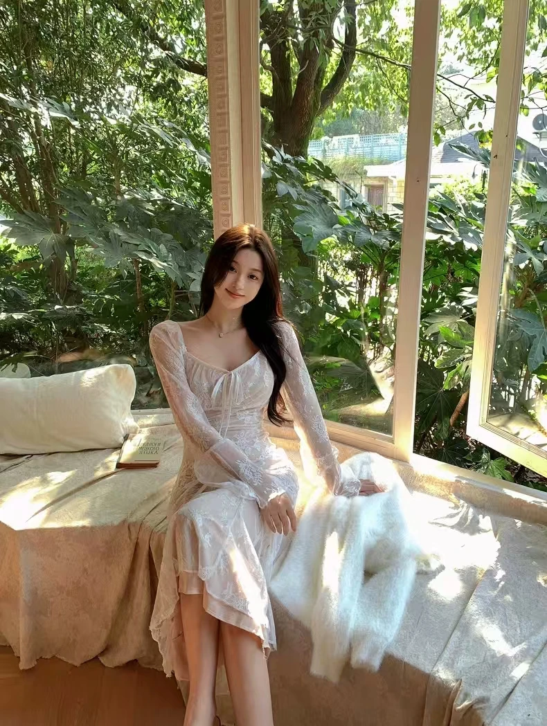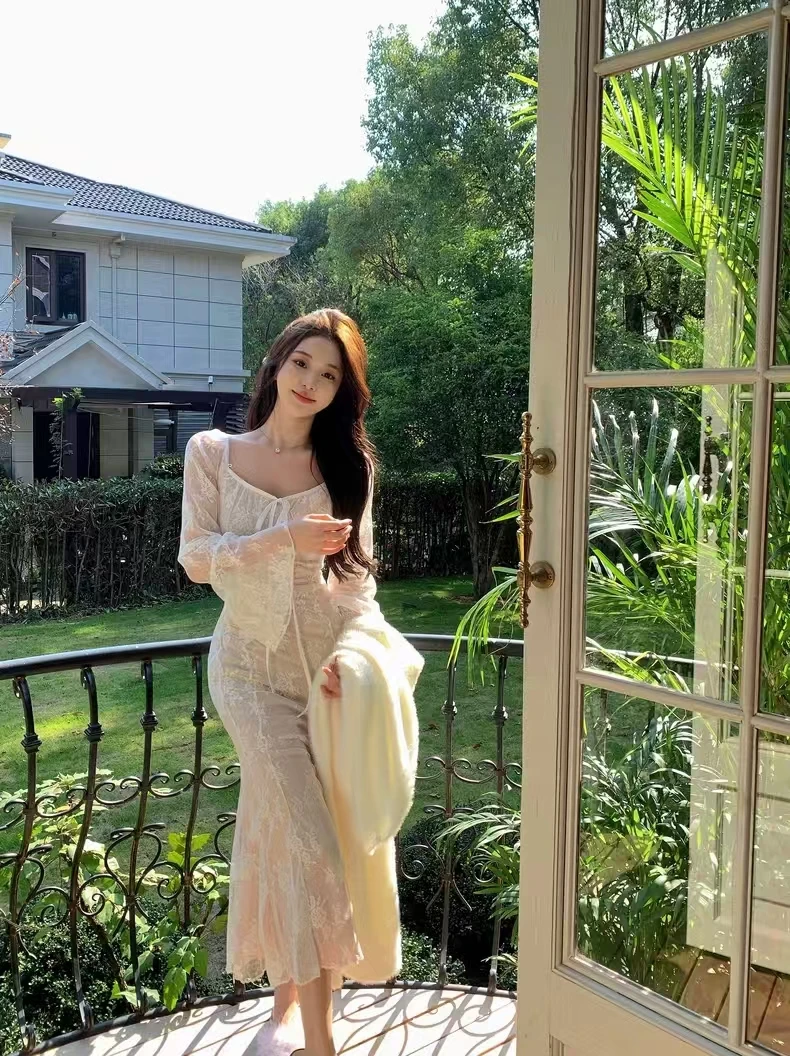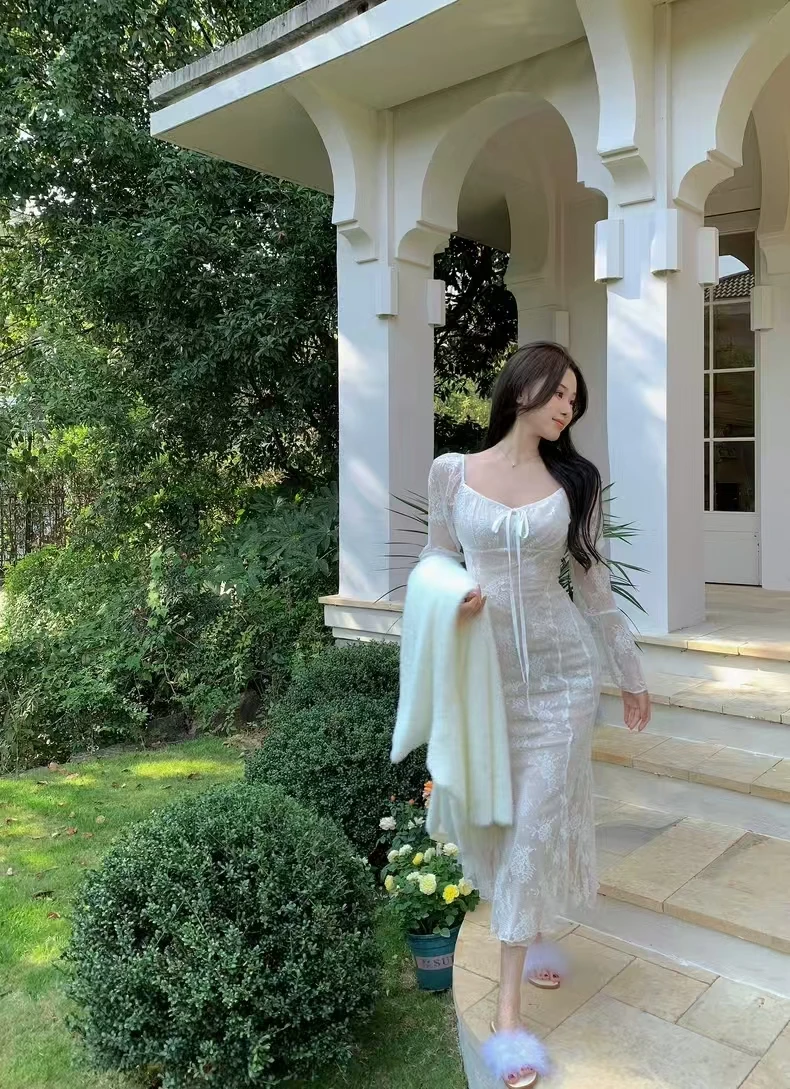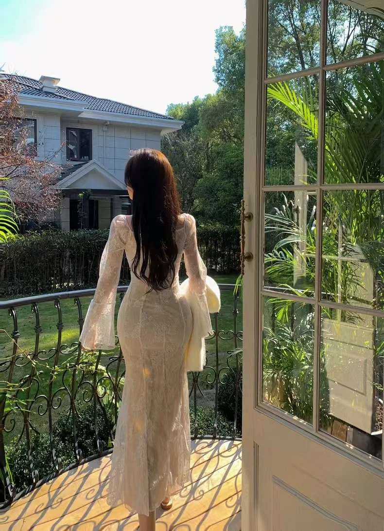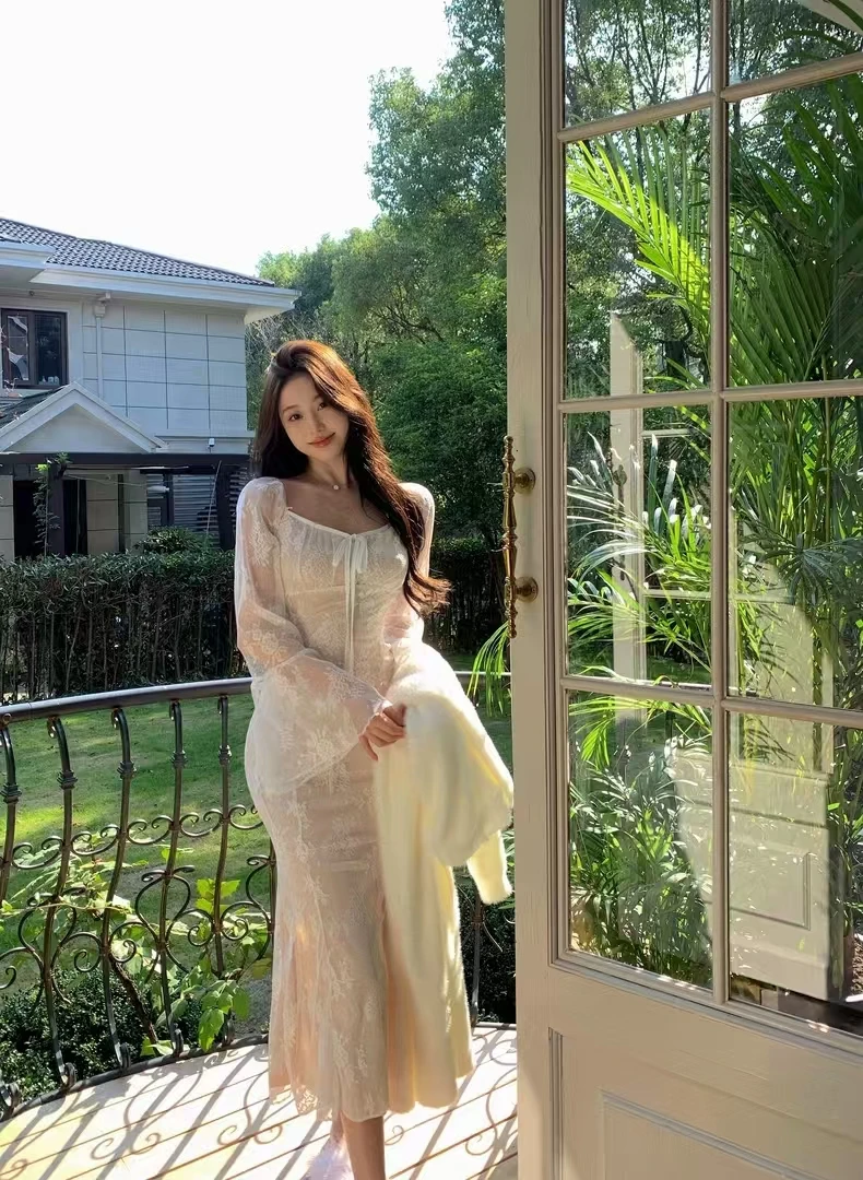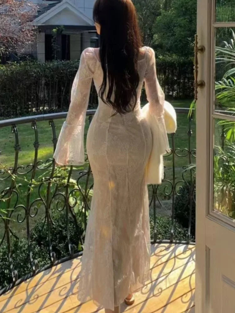 DAIIIBABYYY  -  Korean Elegant Mermaid Dress for Women Autumn Long Flare Sleeve Square Collar Lace-up Slim Lace Vestidos Fashion Chic Long Robe
