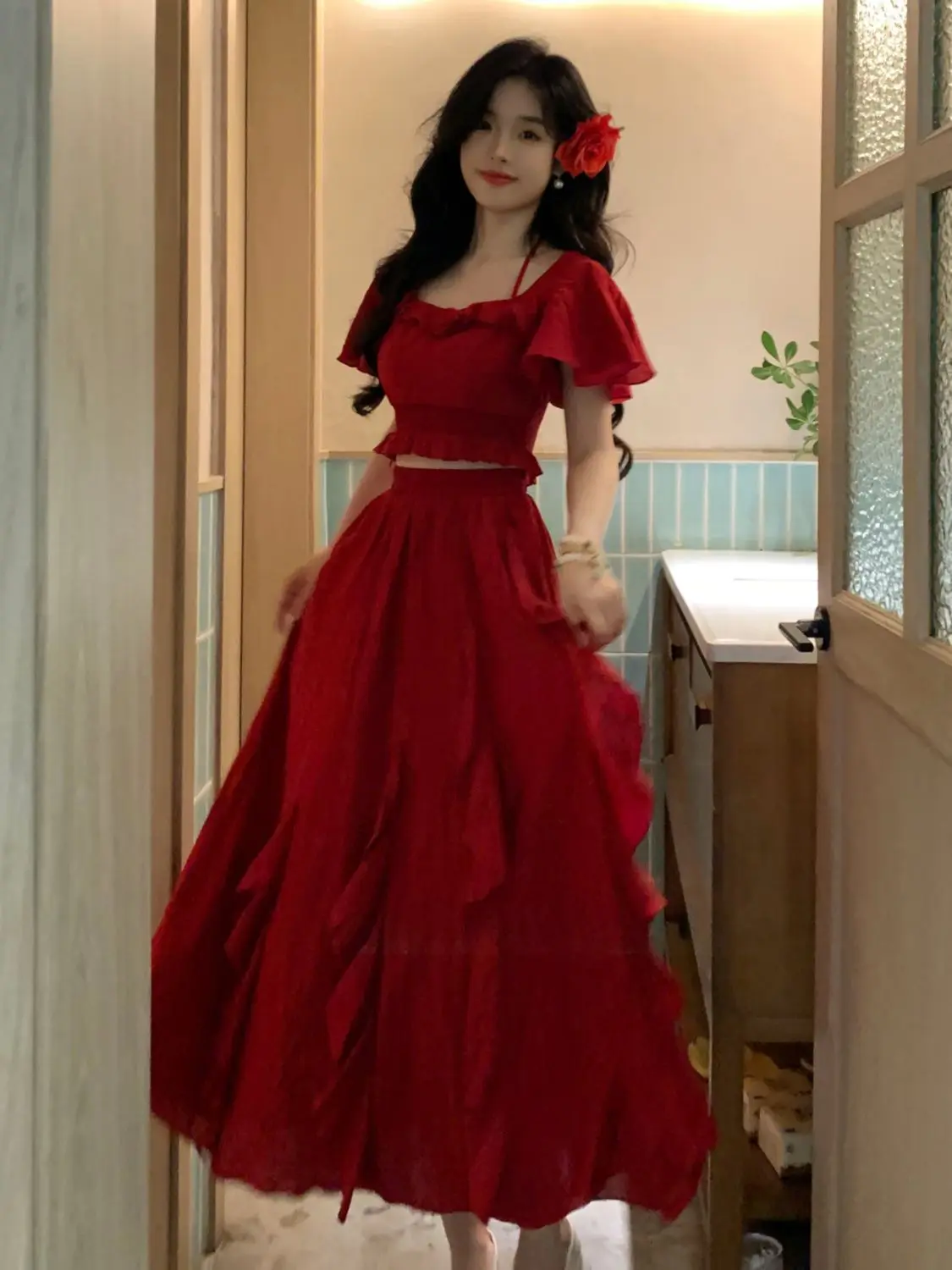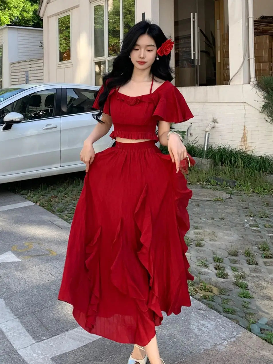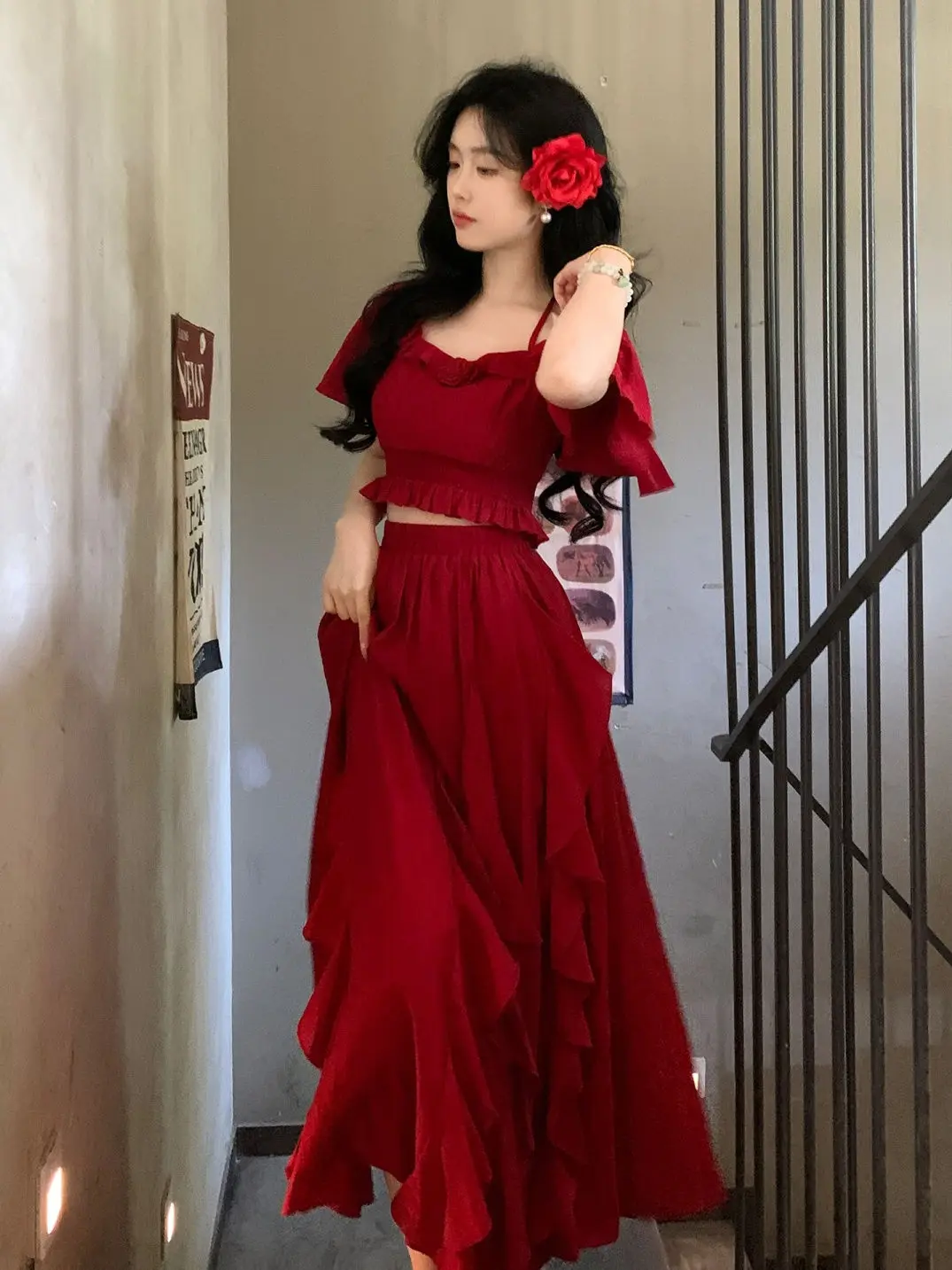 DAIIIBABYYY - New Drunken Wild Berry Red Dress Set Feminine Top Irregular Ruffled Edges Super Fairy Half Two-piece Set Women