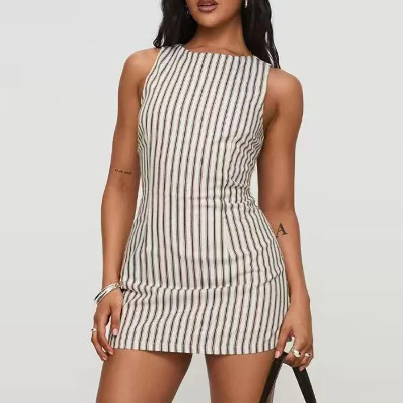 Daiiibabyyy New Fashion Striped Print Slim Fit Mini Dress Women Casual Round Neck Sleeveless Party Dress Elegant Lace-Up Waist A-Line Dress