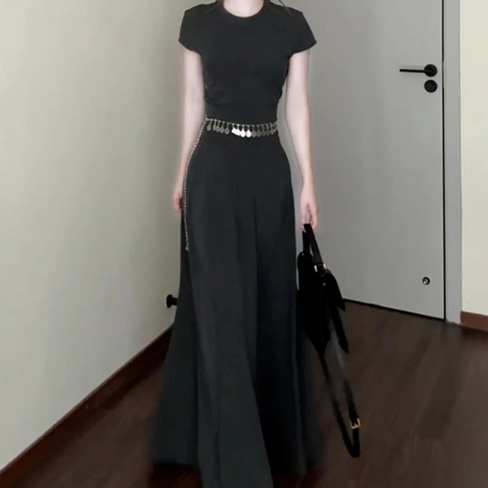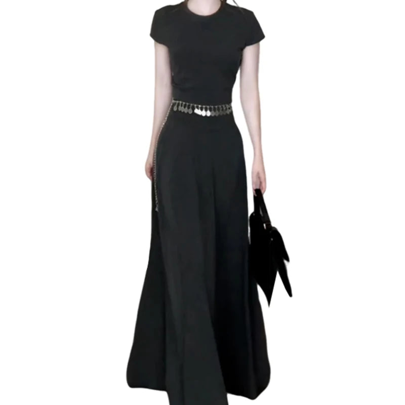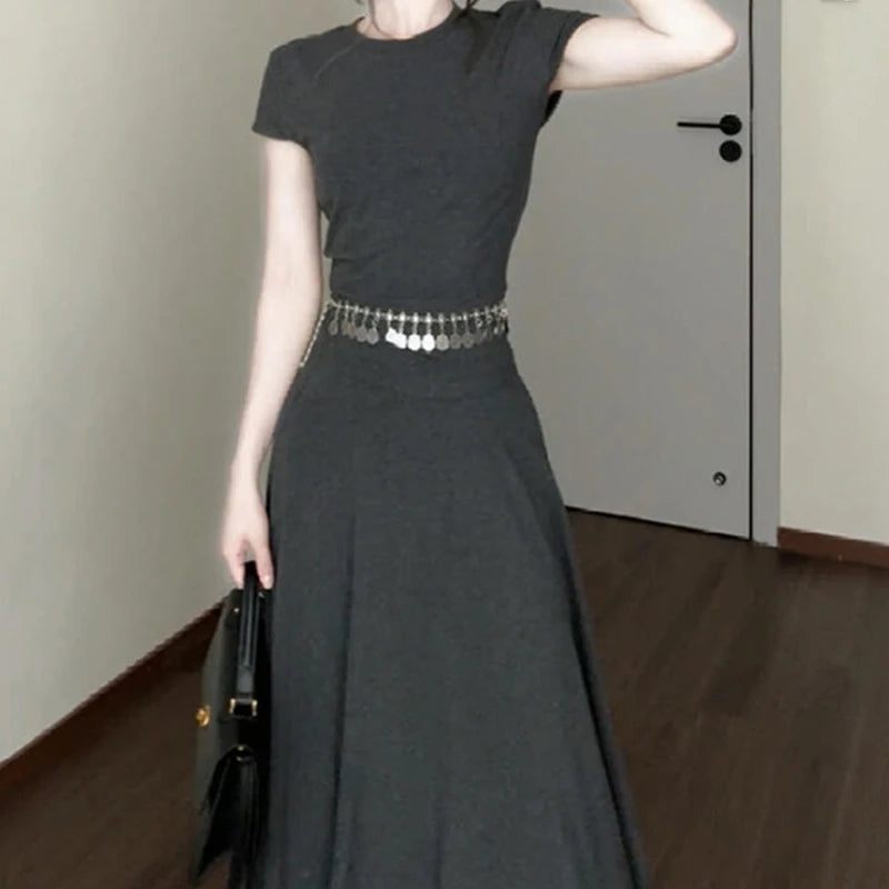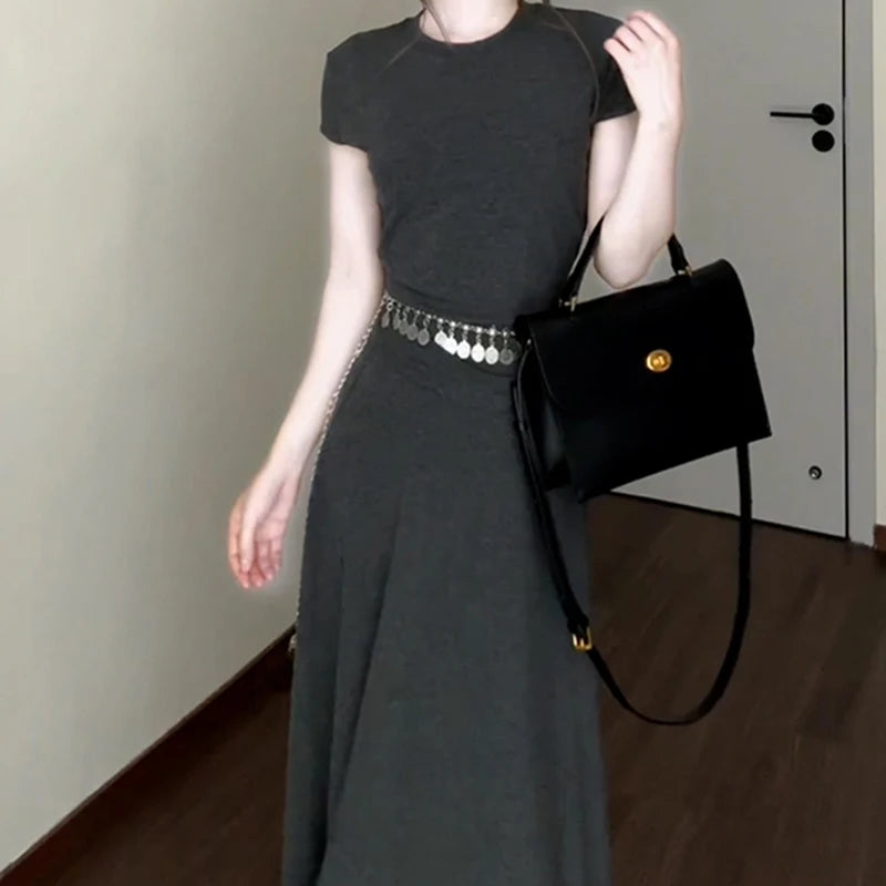 Daiiibabyyy New French Grey Short Sleeved Dress Women's O-Neck Wear Summer New Style High End Collection Waist Style Ankle-Length Dresses