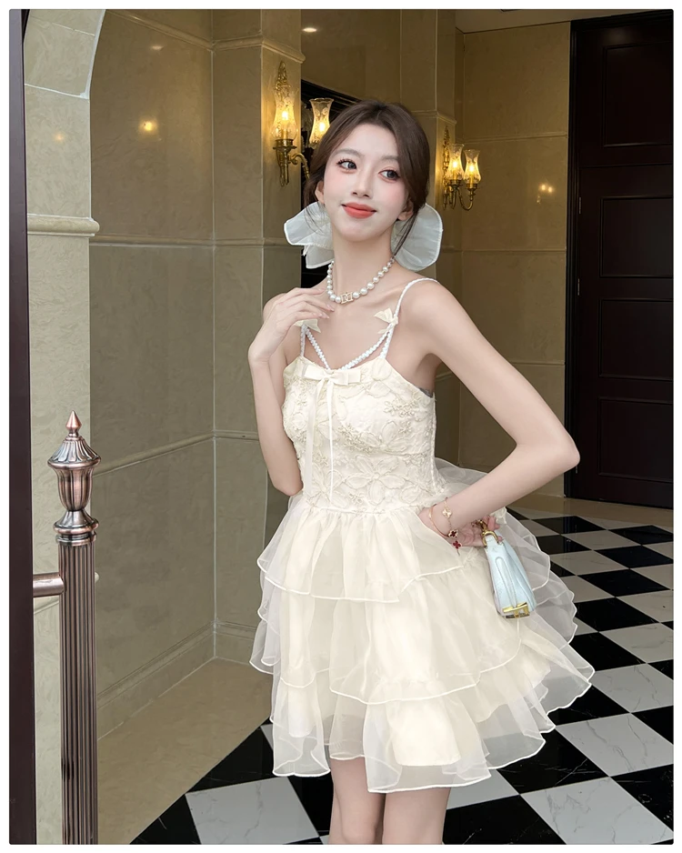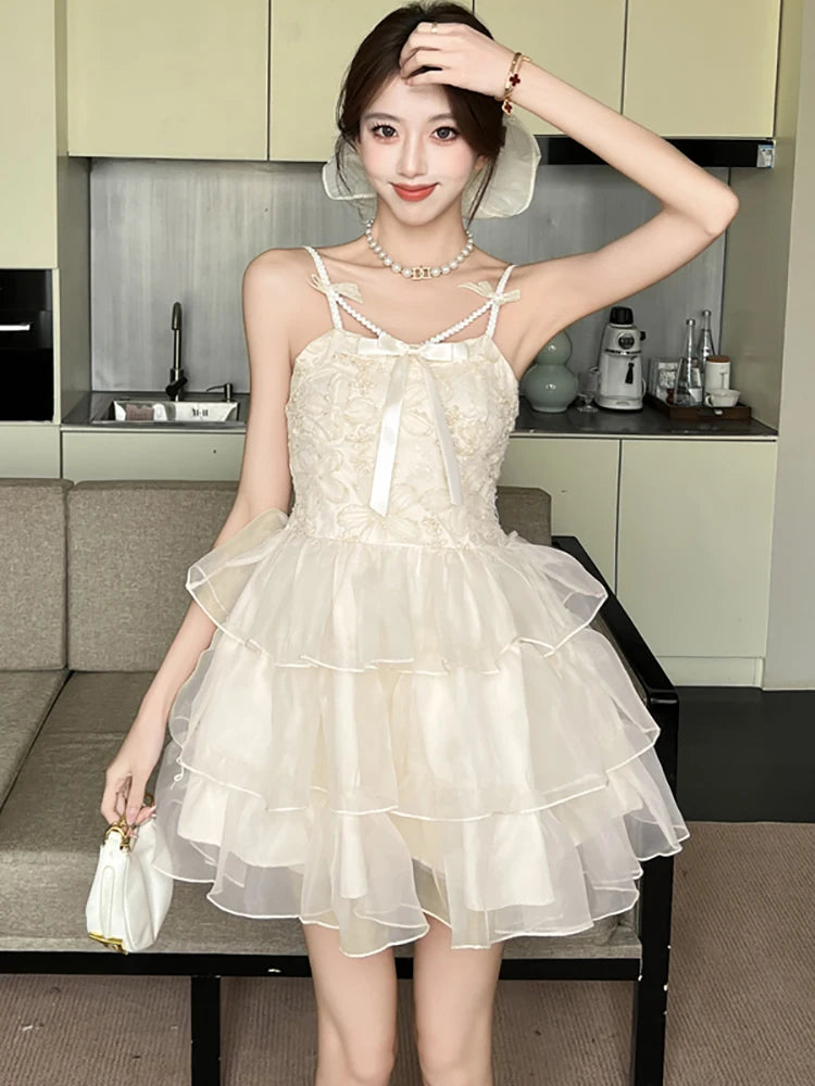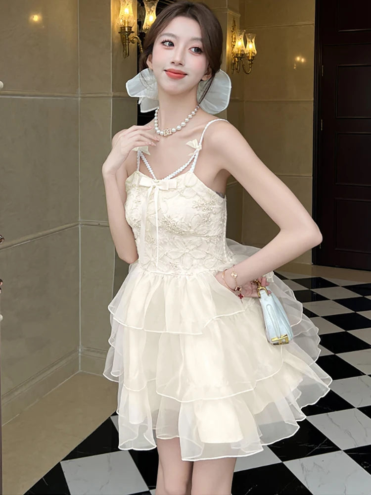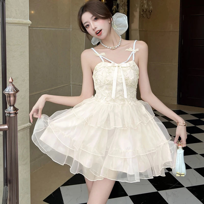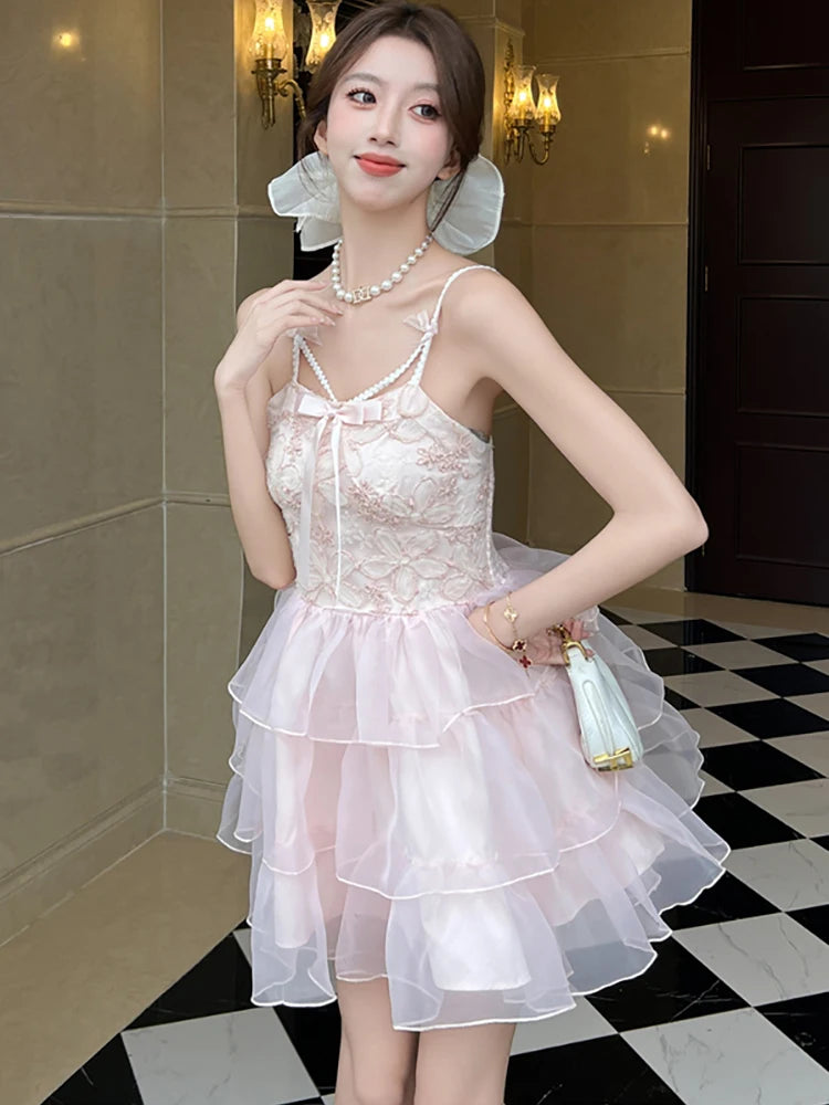 DAIIIBABYYY  -  New Pink Jacquard Patchwork Ruffled Mesh Mini Dress Women Elegant Bow Sling Dresses Summer Korean Bodycon Casual Y2k Dress