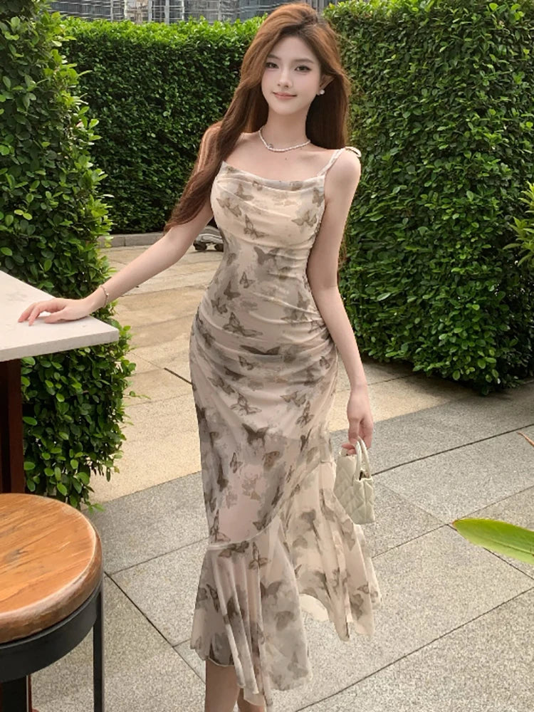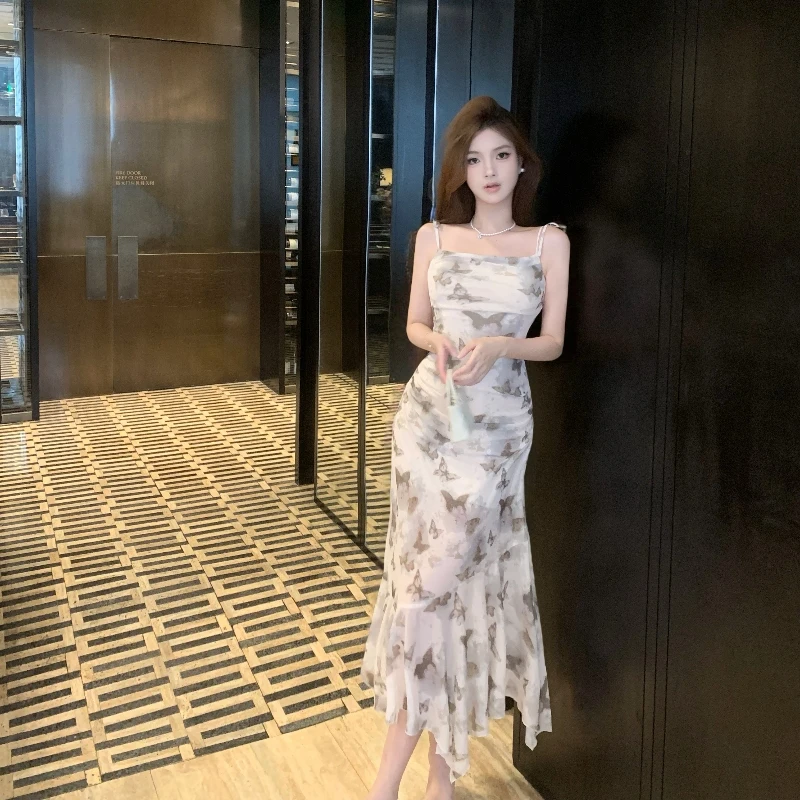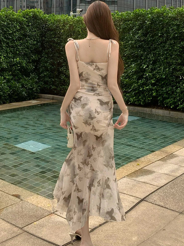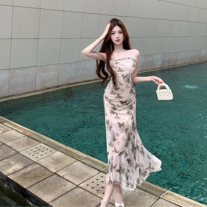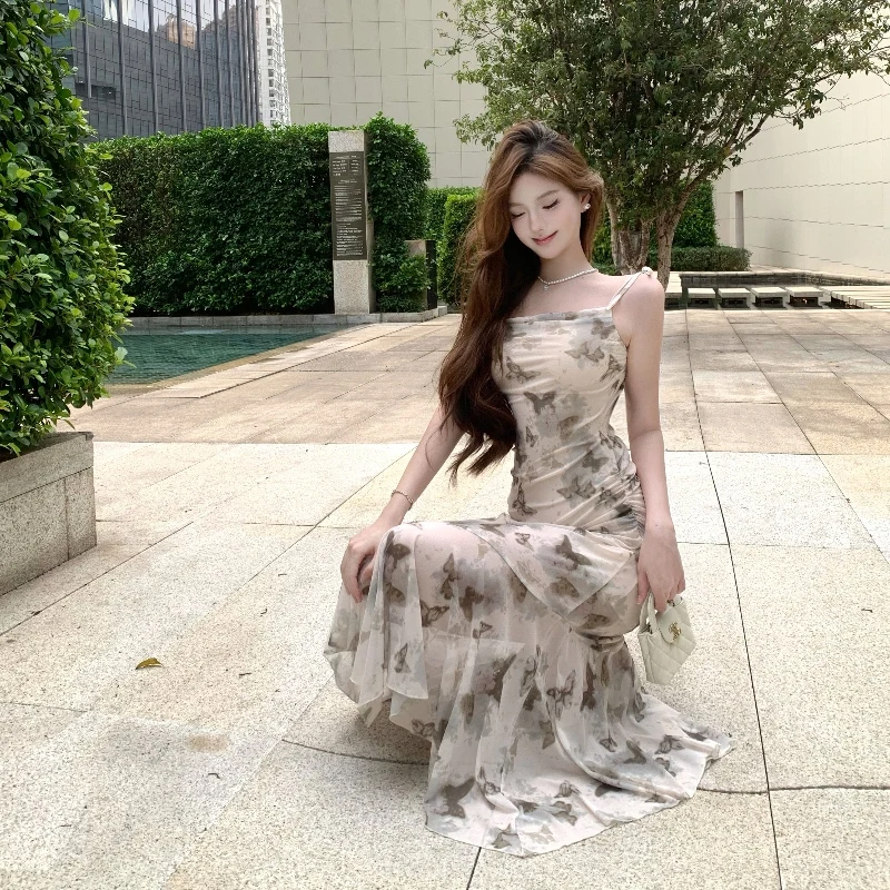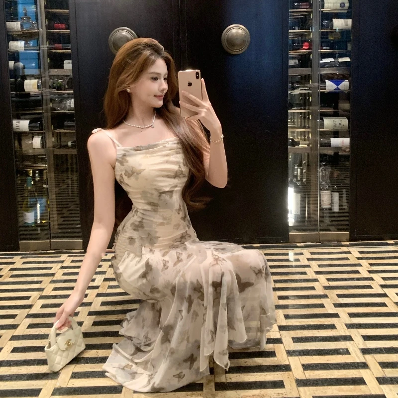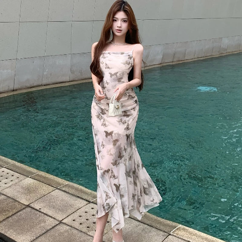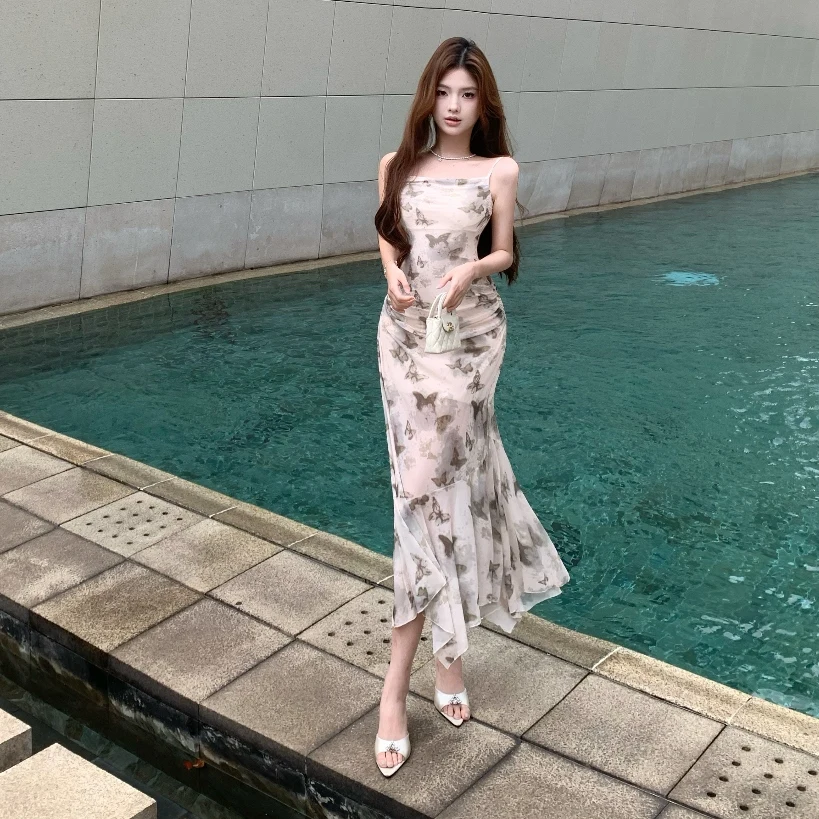 DAIIIBABYYY - New Print Mesh Sling Long Dress Summer Elegant Beach Style Holiday Dress Women Korean Fashion Bodycon Ruffled Mermaid Dress